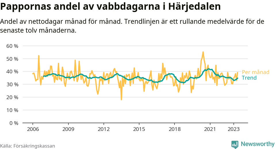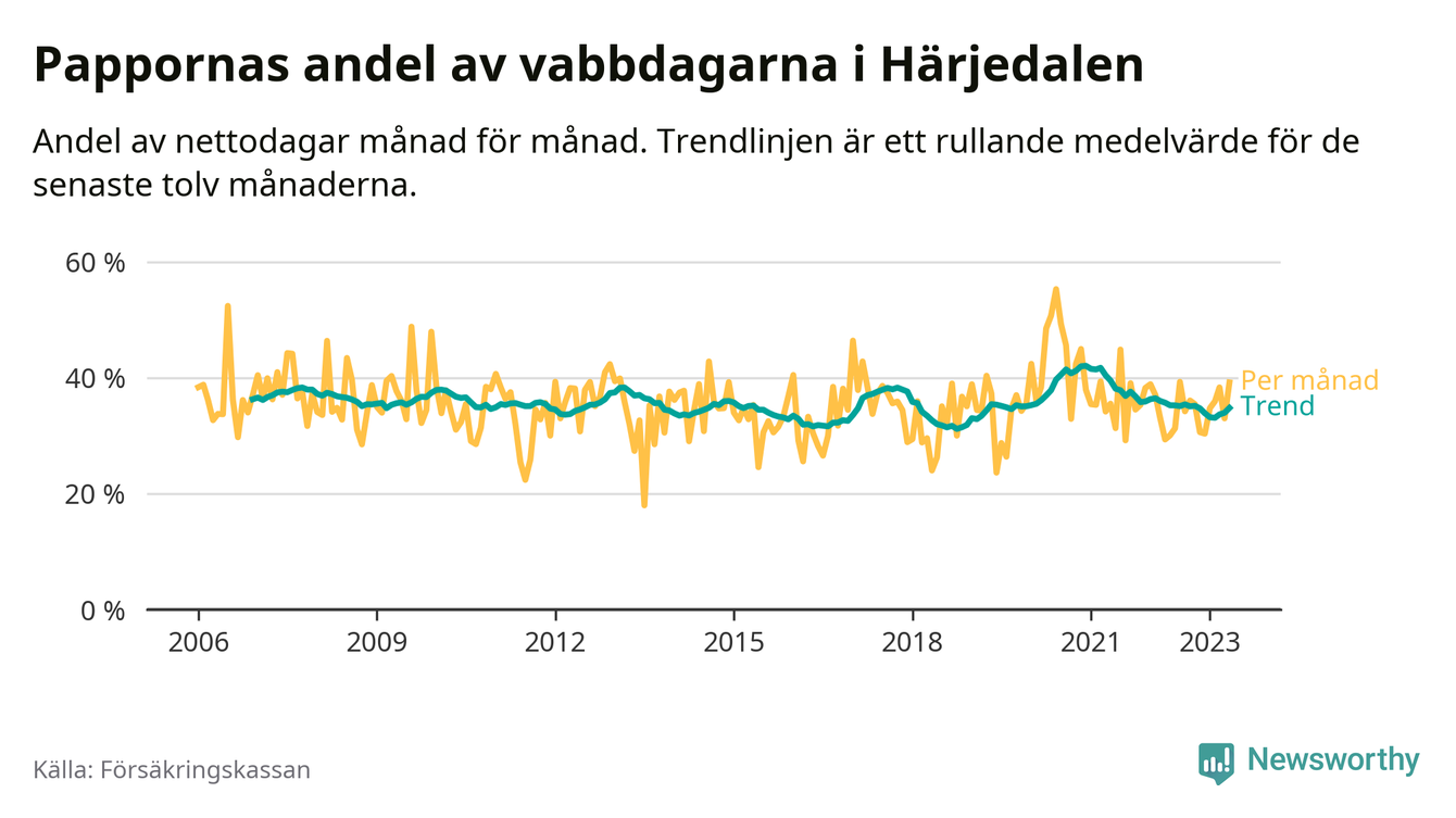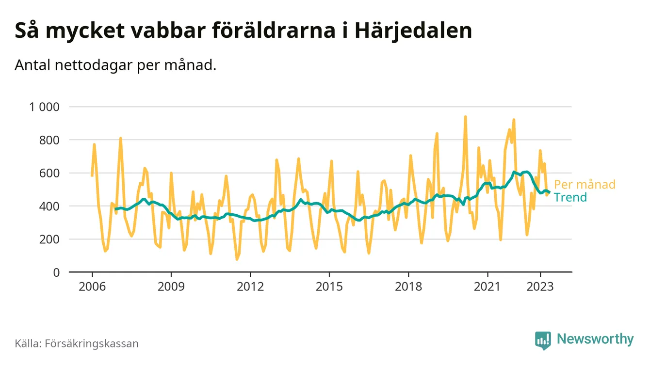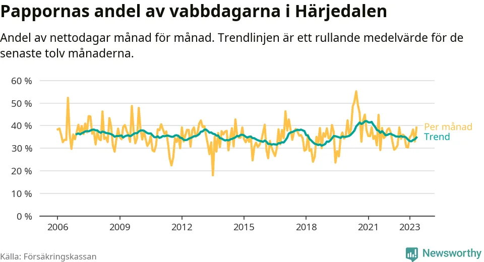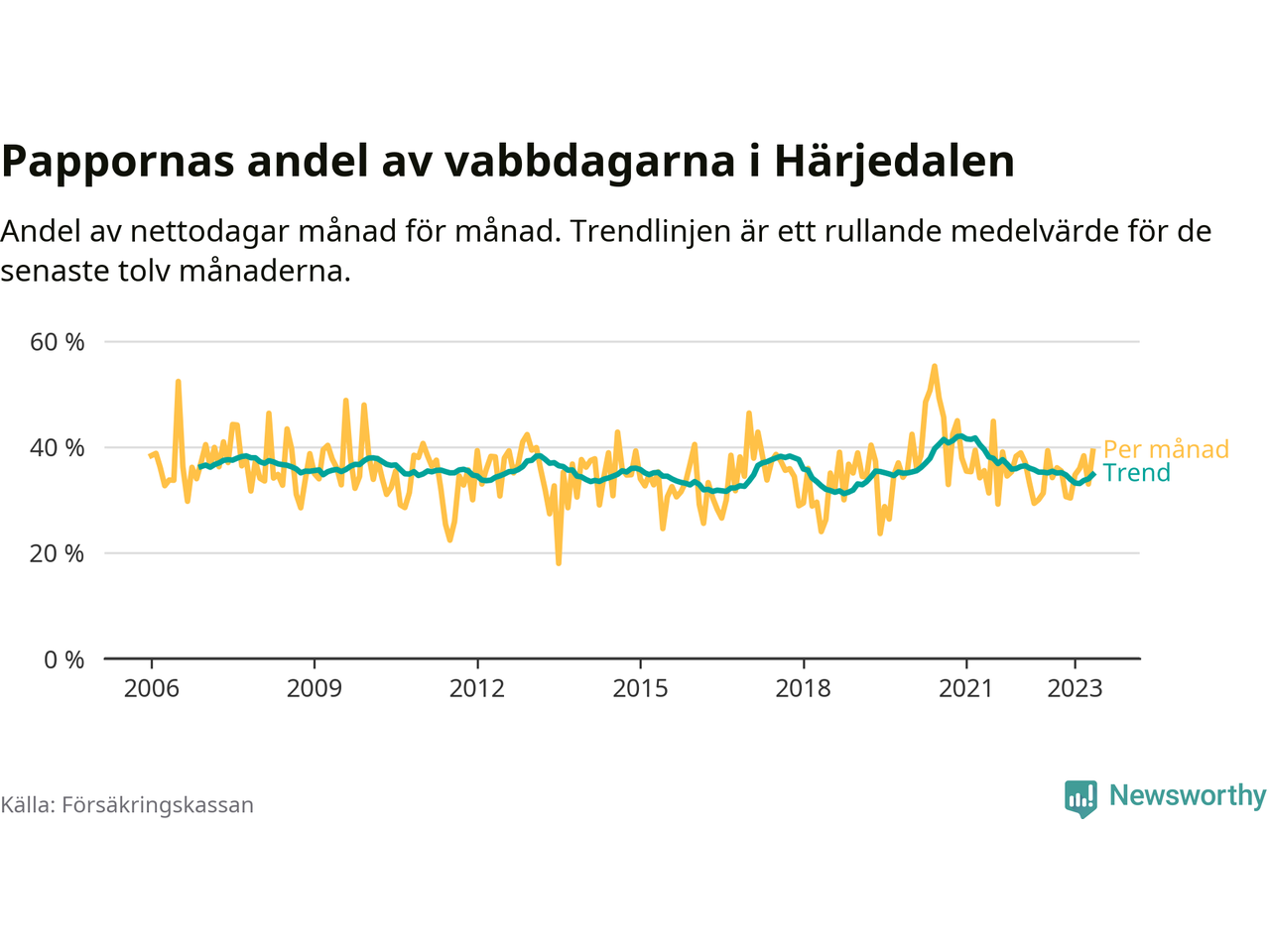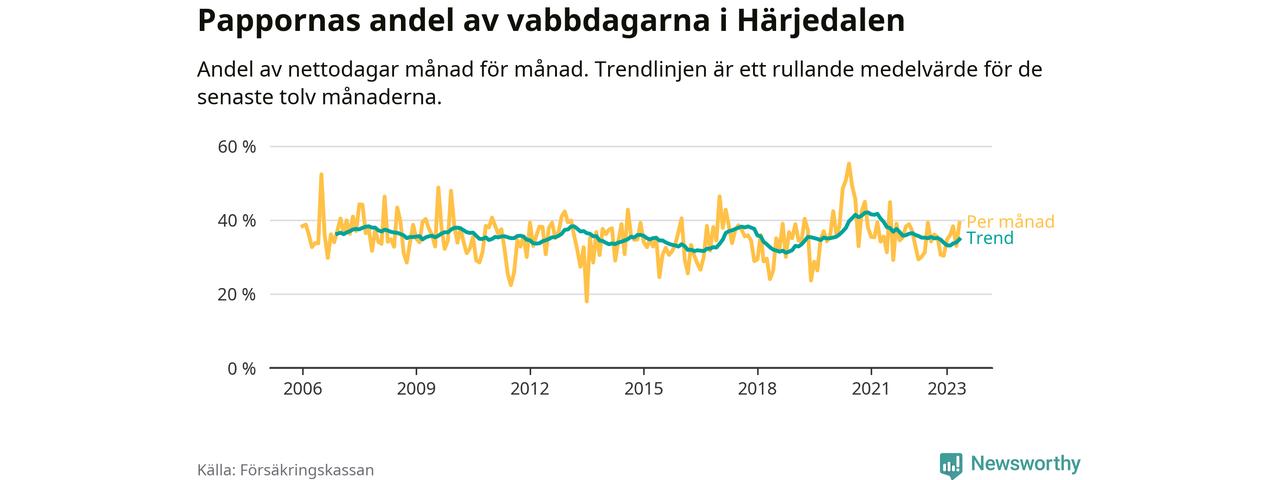 I Härjedalens kommun peakade pappornas uttag vintern 2020 då kommunens fäder var uppe i 42 procent av vabbdagarna 1. Under de senaste tolv månaderna har männen stått för 35 procent av vabb i kommunen.