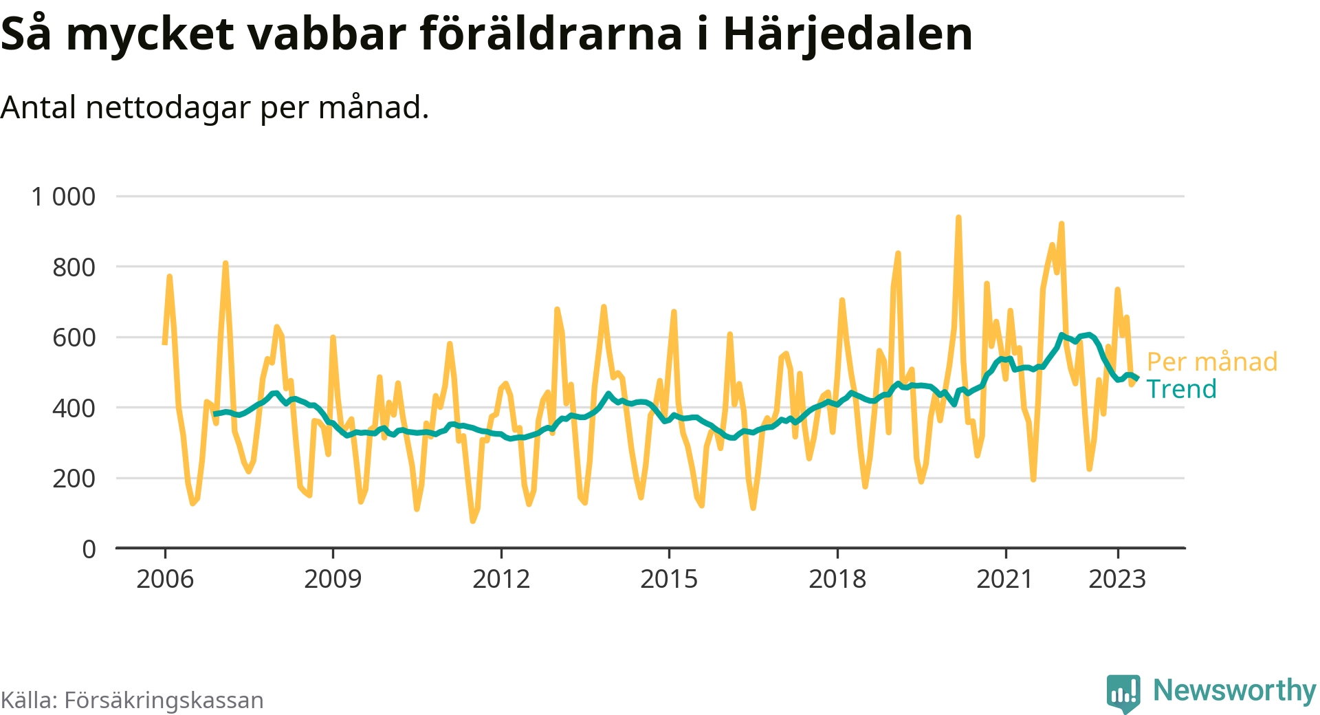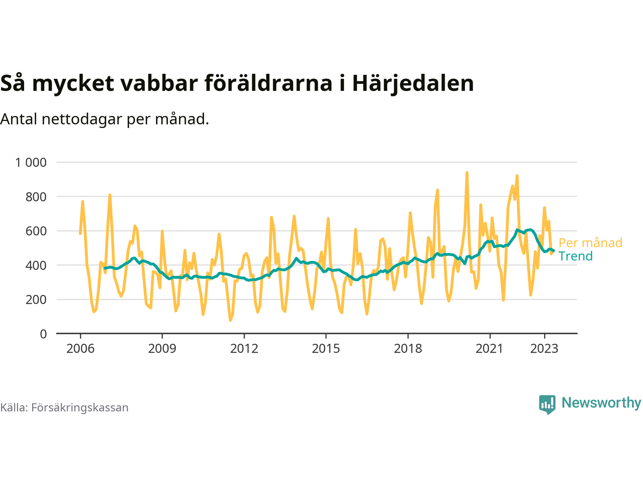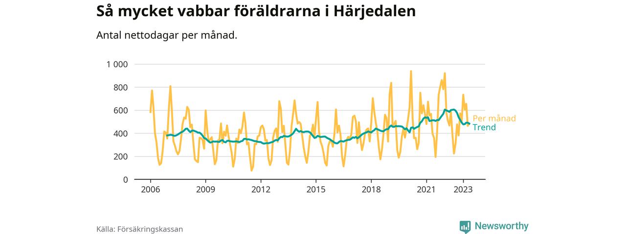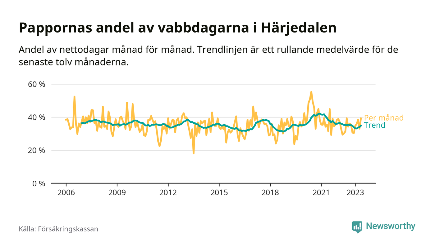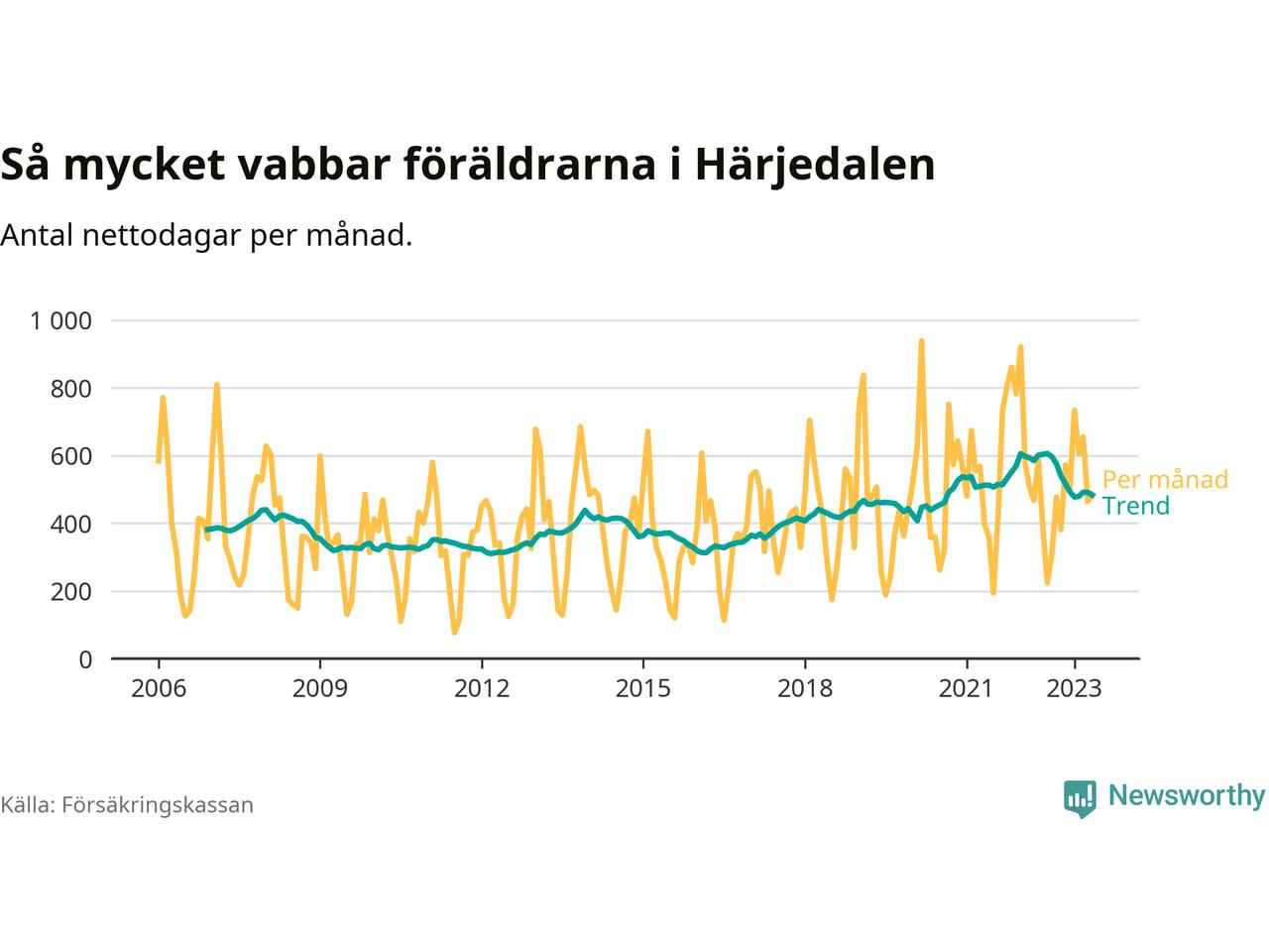 I Härjedalens kommun peakade pappornas uttag vintern 2020 då kommunens fäder var uppe i 42 procent av vabbdagarna 1. Under de senaste tolv månaderna har männen stått för 35 procent av vabb i kommunen.