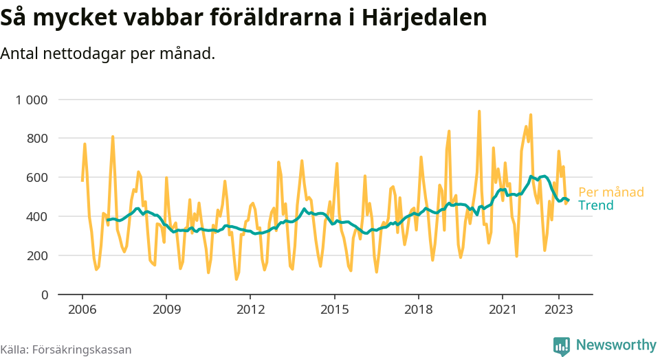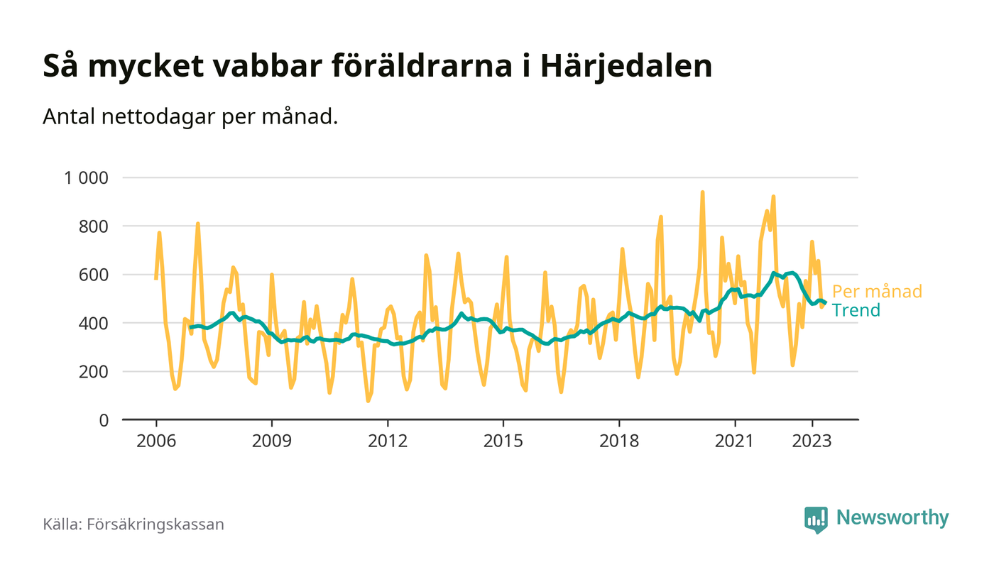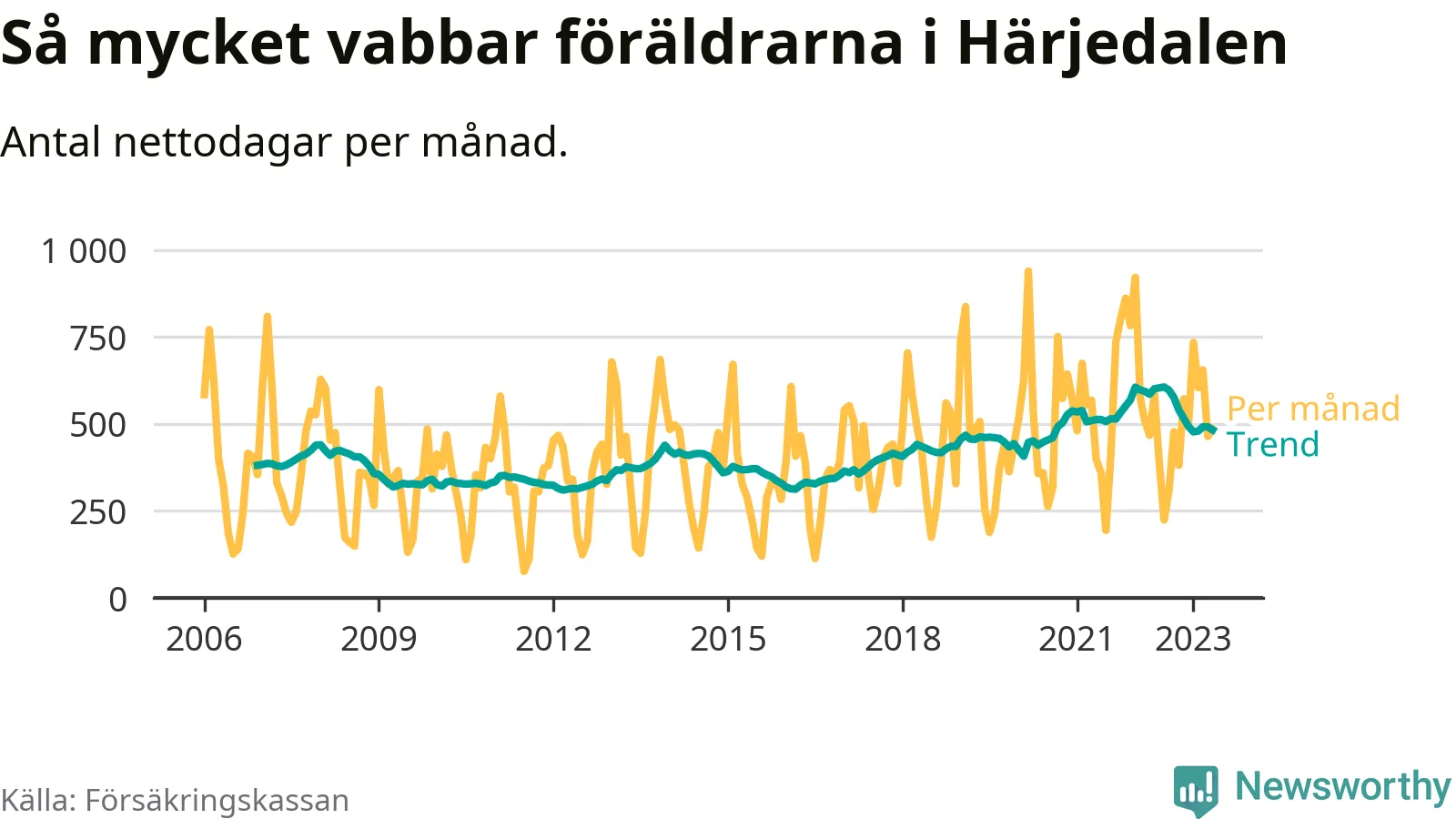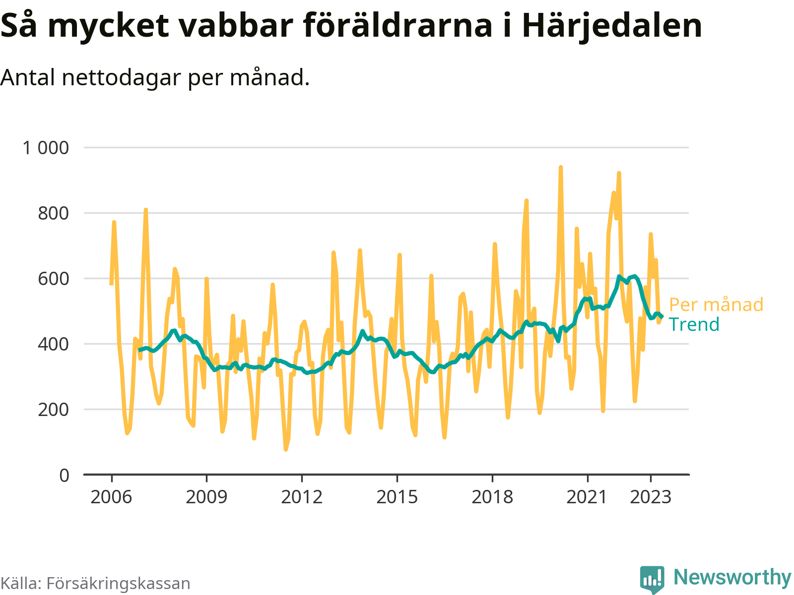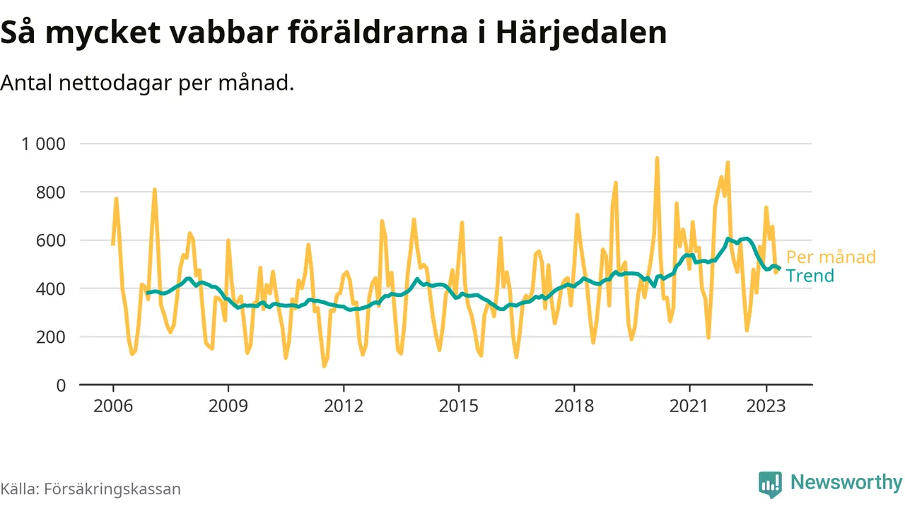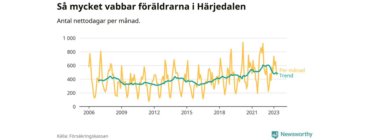 I Härjedalens kommun peakade pappornas uttag vintern 2020 då kommunens fäder var uppe i 42 procent av vabbdagarna 1. Under de senaste tolv månaderna har männen stått för 35 procent av vabb i kommunen.