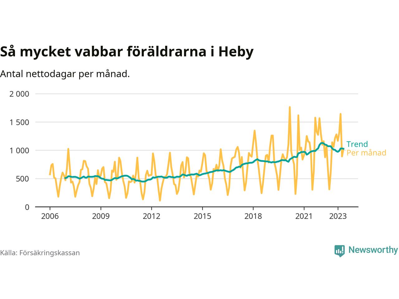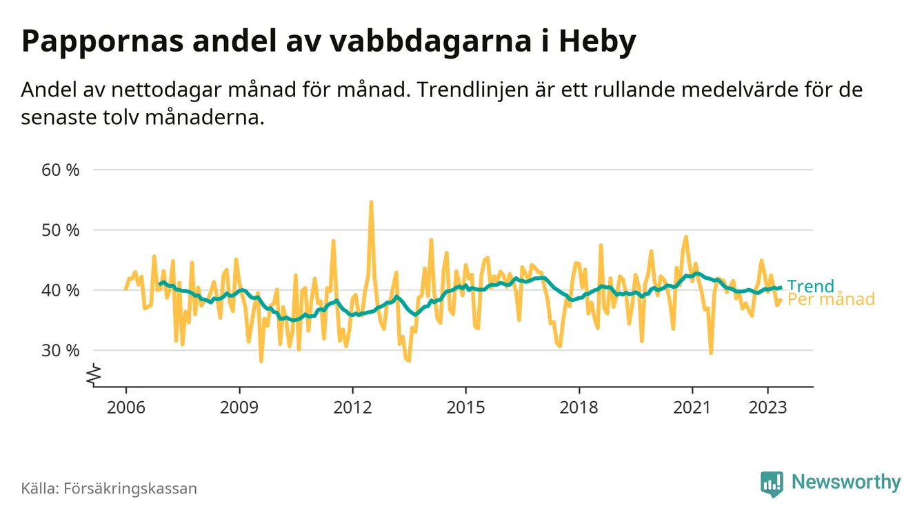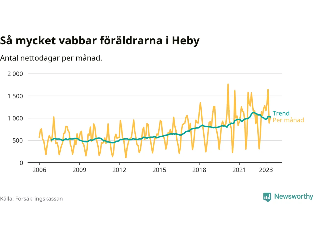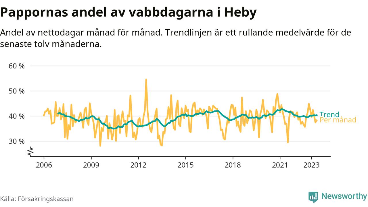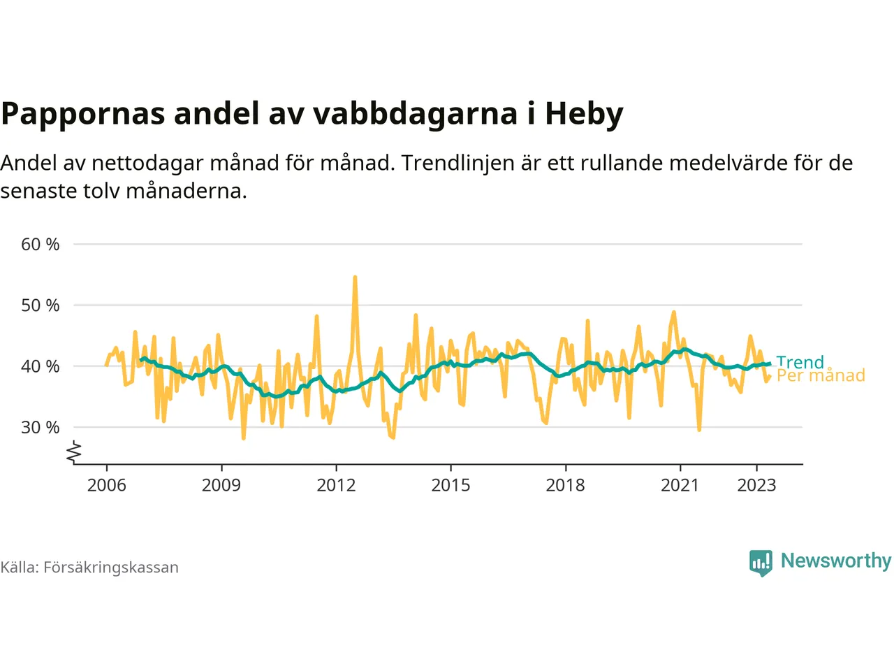 I Heby kommun peakade pappornas uttag vintern 2021 då kommunens fäder var uppe i 43 procent av vabbdagarna 1. Under de senaste tolv månaderna har männen stått för 40 procent av vabb i kommunen.