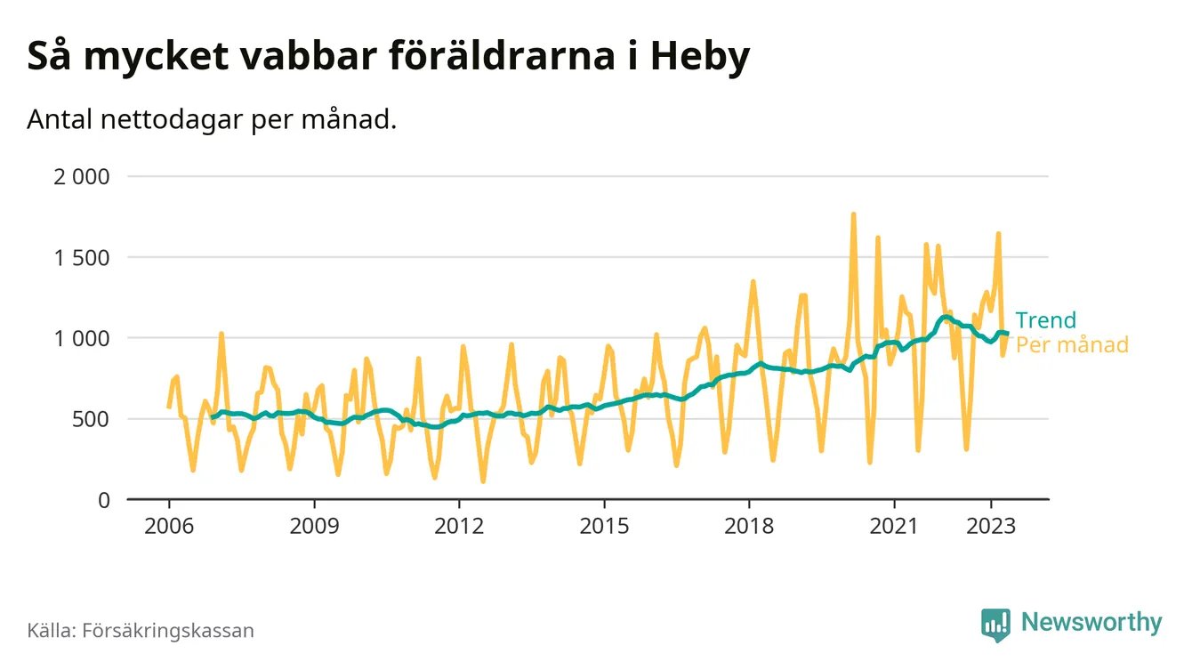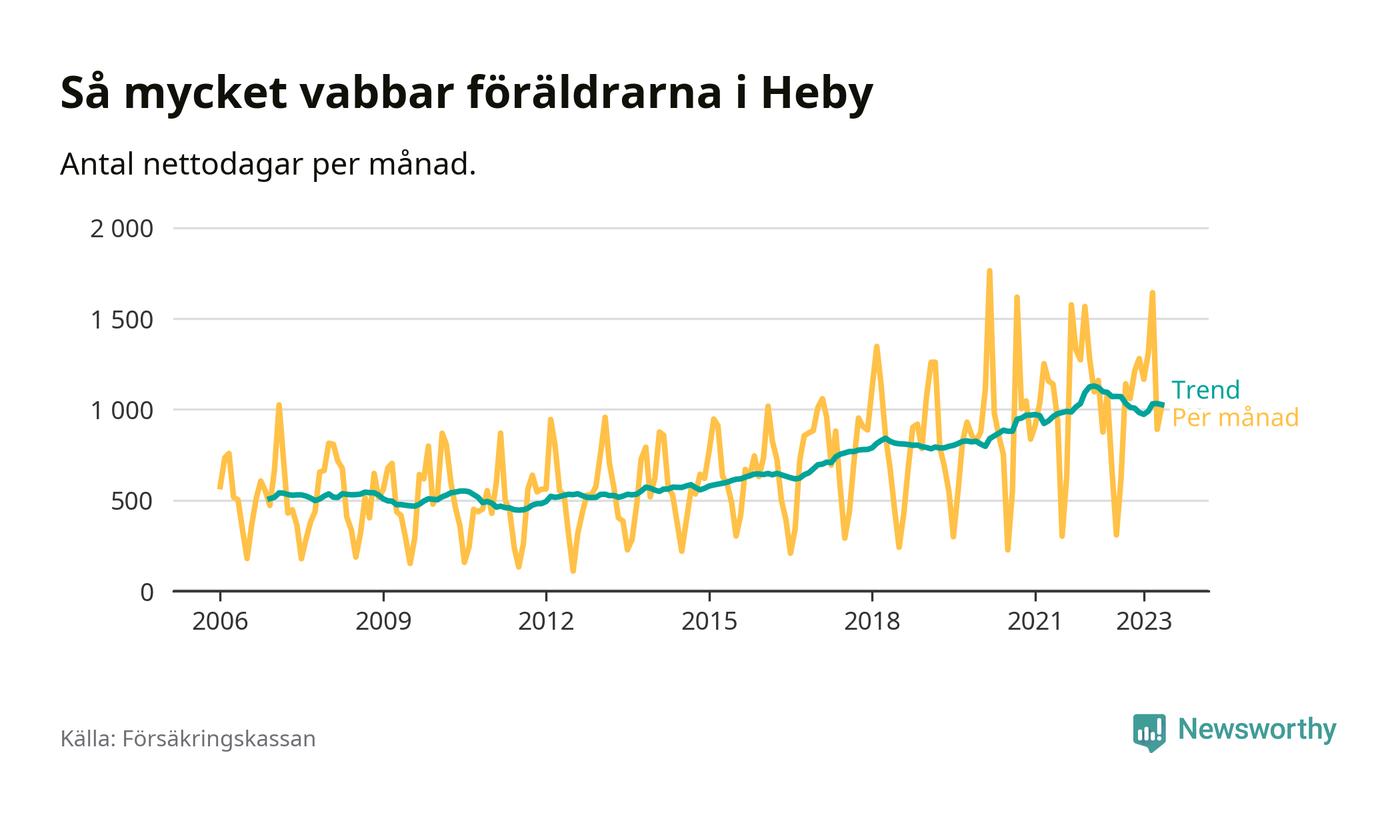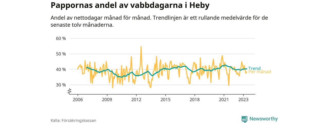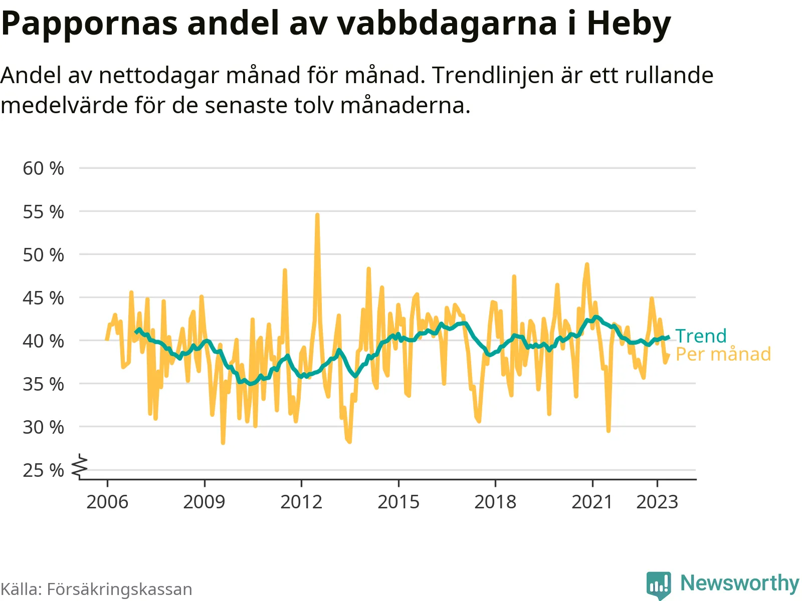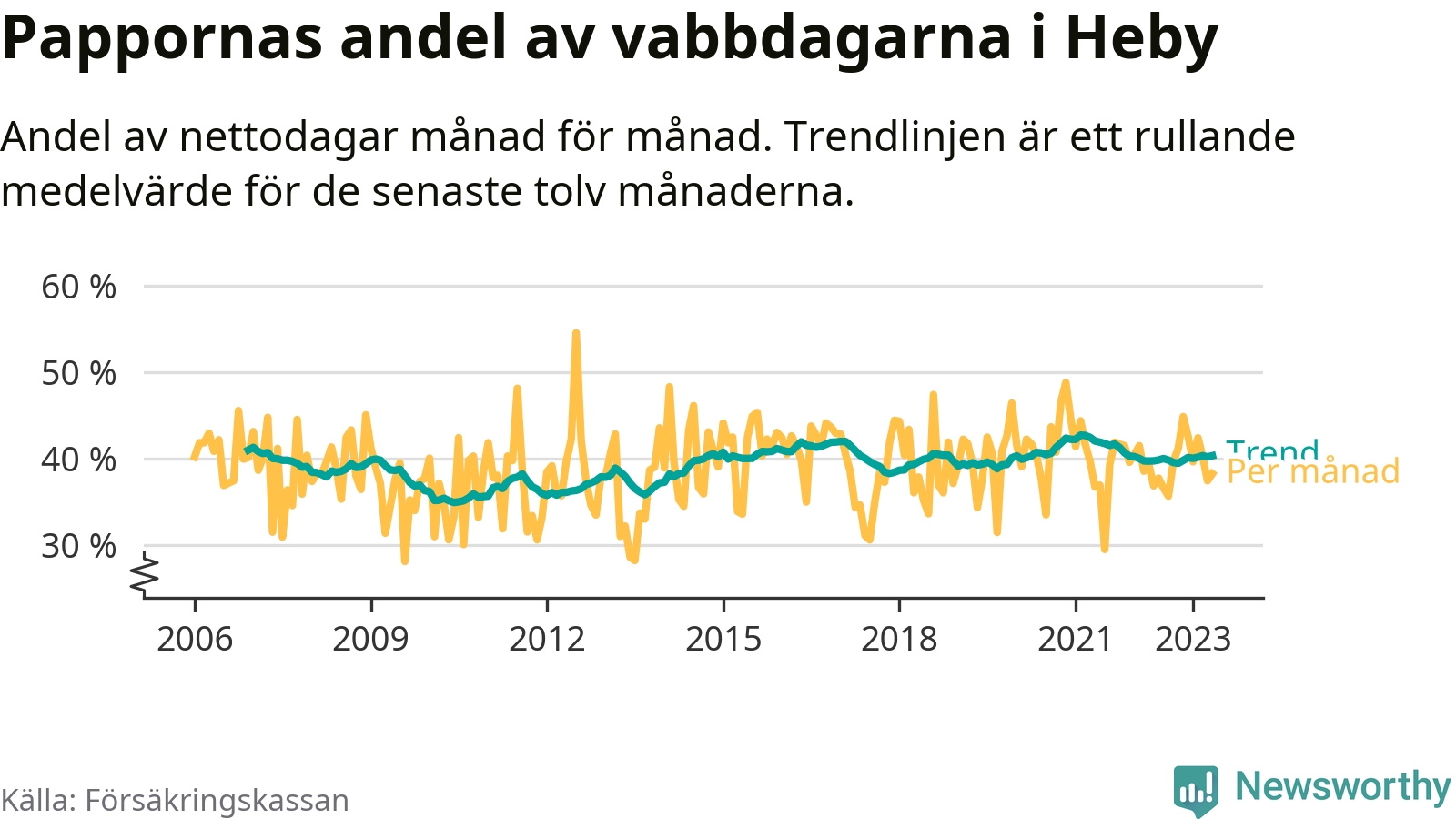 I Heby kommun peakade pappornas uttag vintern 2021 då kommunens fäder var uppe i 43 procent av vabbdagarna 1. Under de senaste tolv månaderna har männen stått för 40 procent av vabb i kommunen.