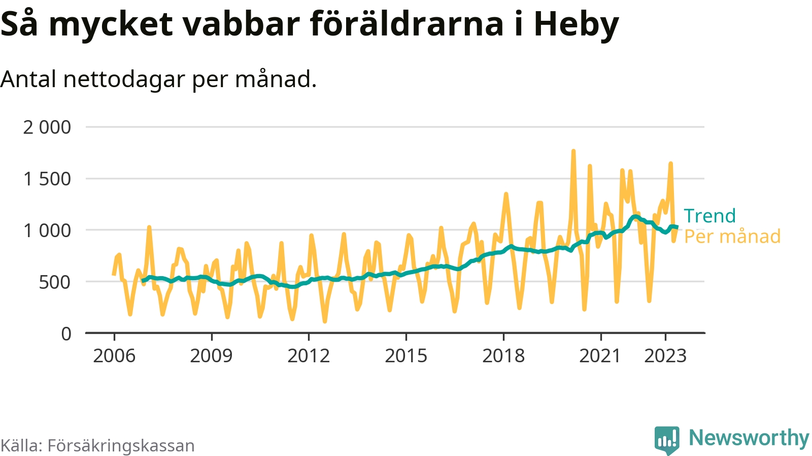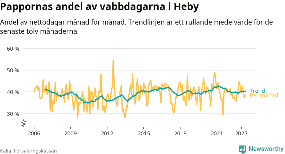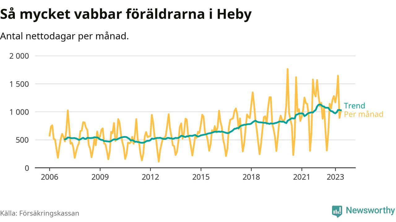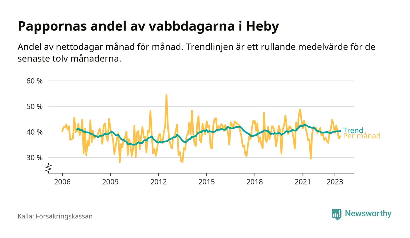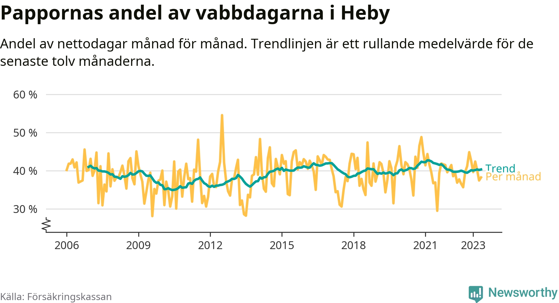 I Heby kommun peakade pappornas uttag vintern 2021 då kommunens fäder var uppe i 43 procent av vabbdagarna 1. Under de senaste tolv månaderna har männen stått för 40 procent av vabb i kommunen.