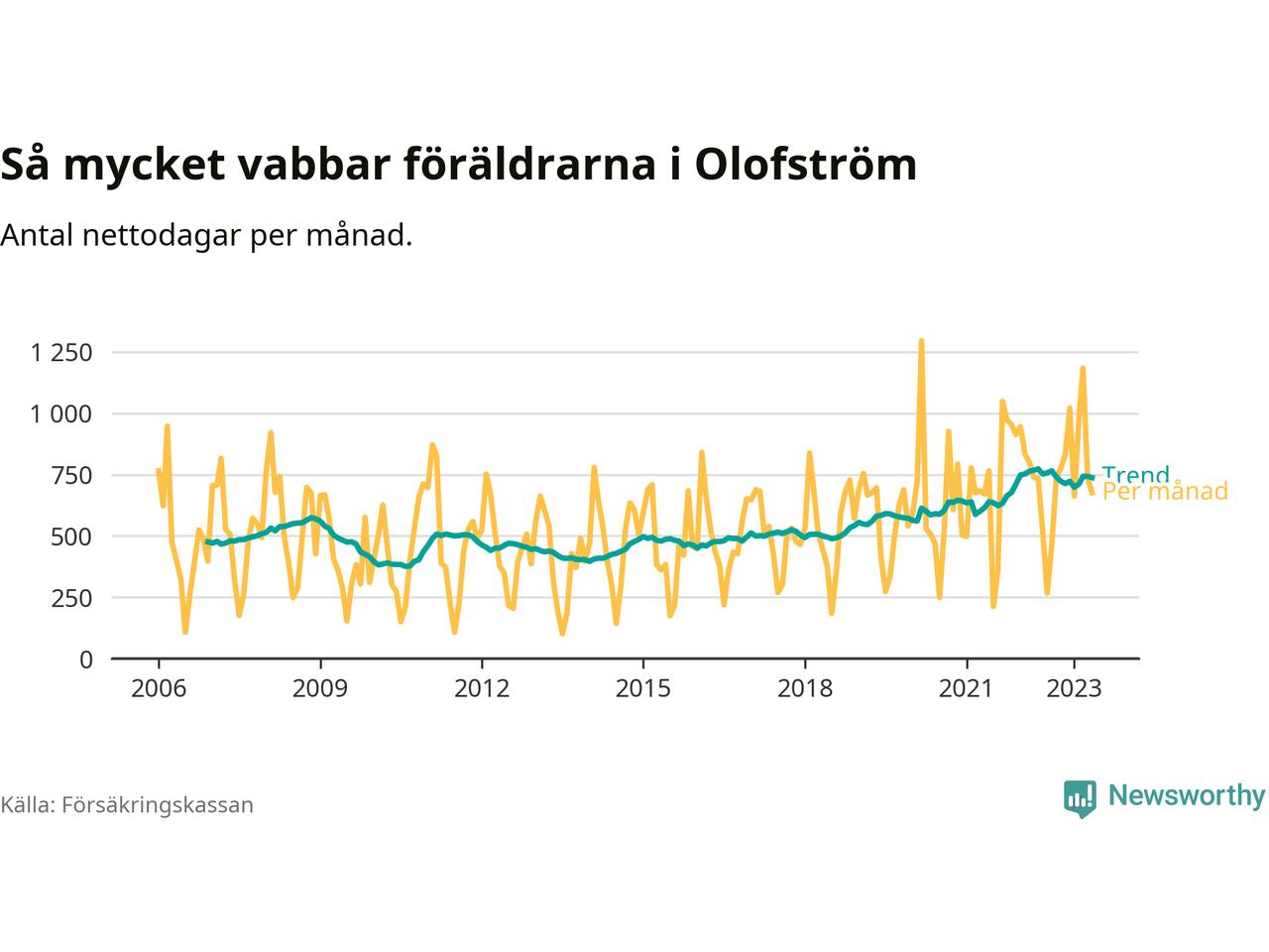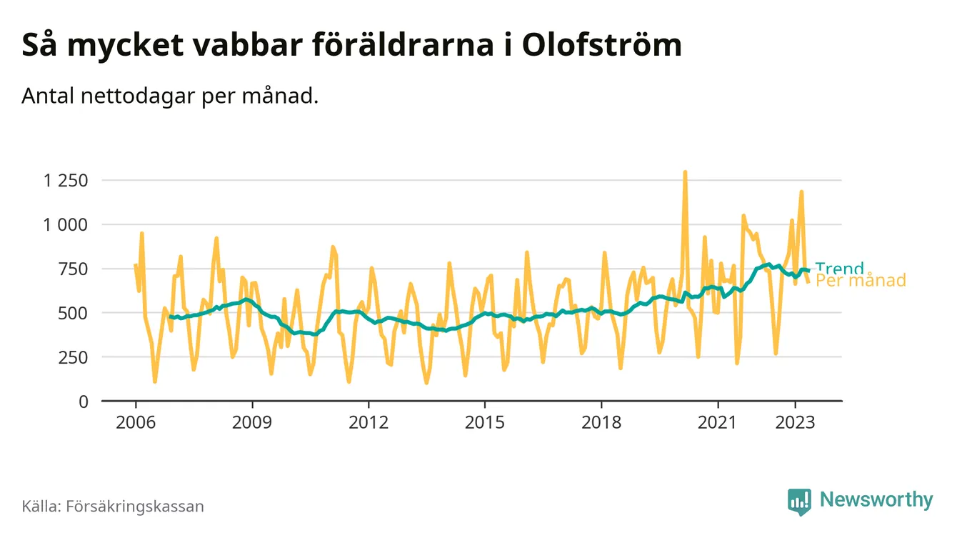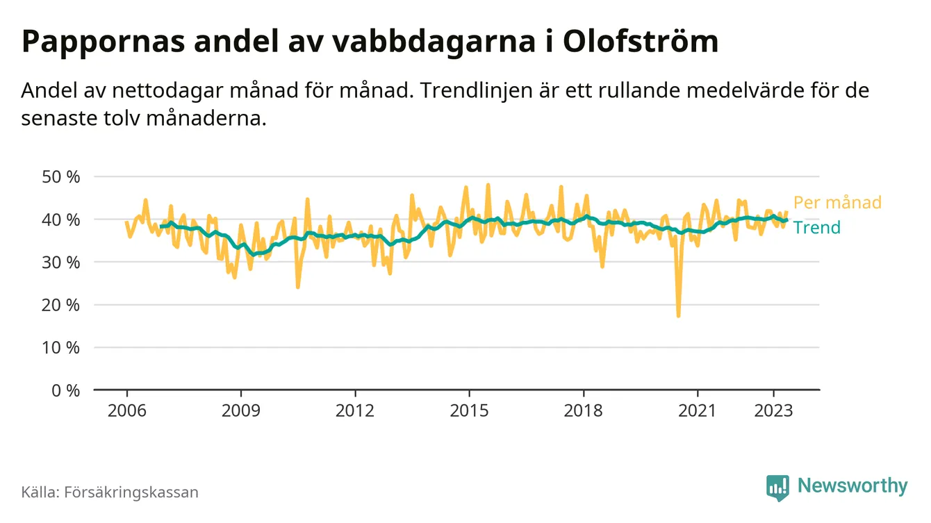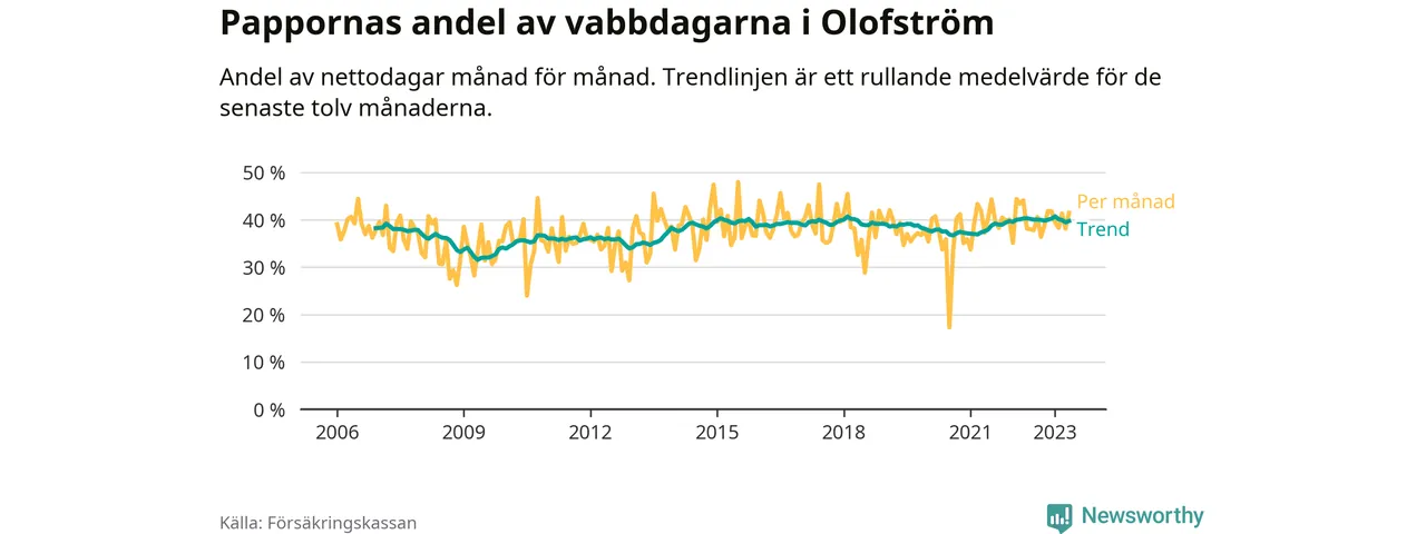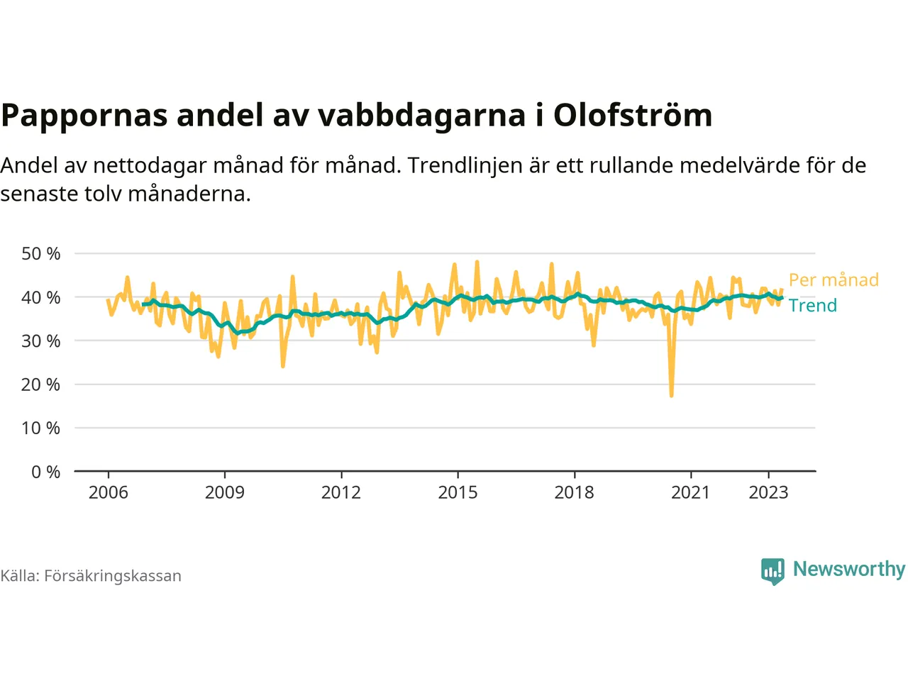 I Olofströms kommun peakade pappornas uttag vintern 2023 då kommunens fäder var uppe i 41 procent av vabbdagarna 1. Under de senaste tolv månaderna har männen stått för 40 procent av vabb i kommunen.