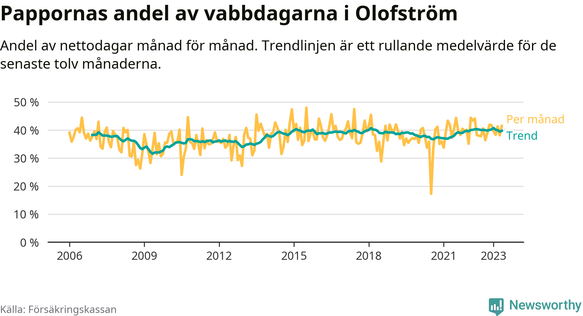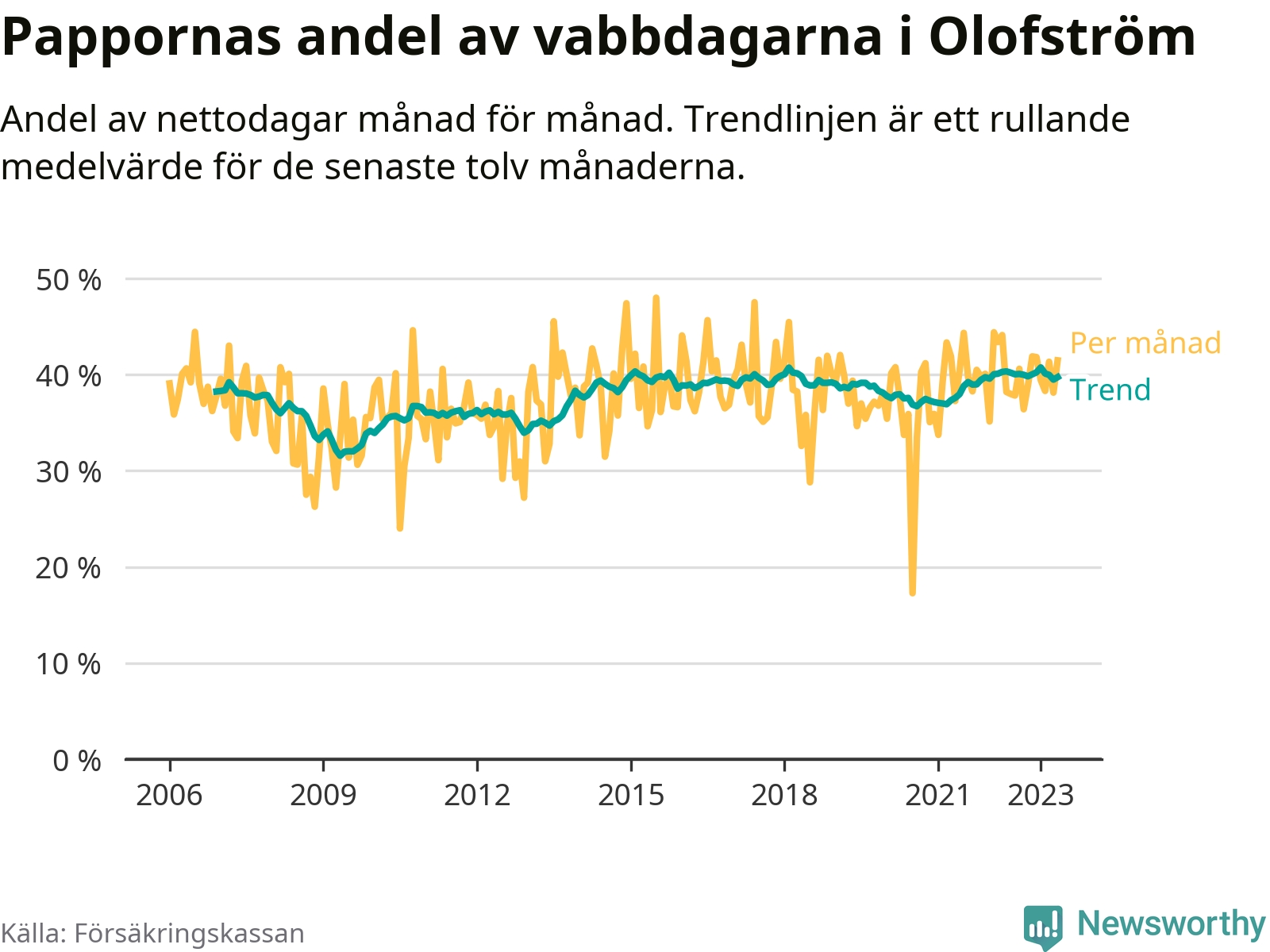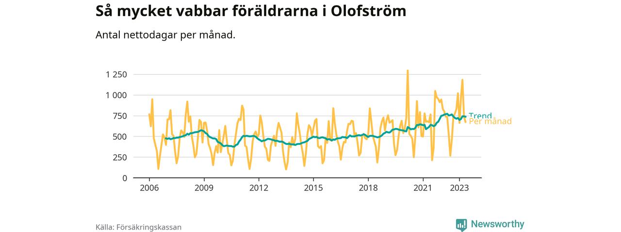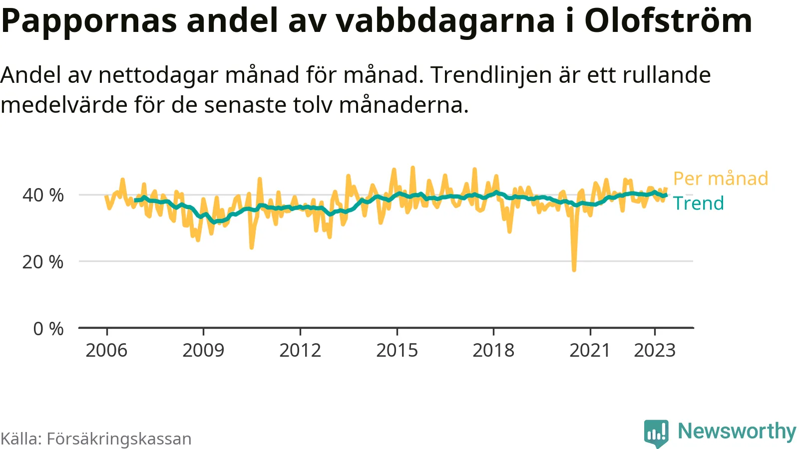 I Olofströms kommun peakade pappornas uttag vintern 2023 då kommunens fäder var uppe i 41 procent av vabbdagarna 1. Under de senaste tolv månaderna har männen stått för 40 procent av vabb i kommunen.