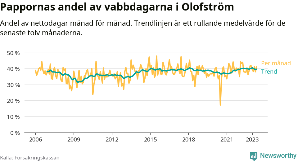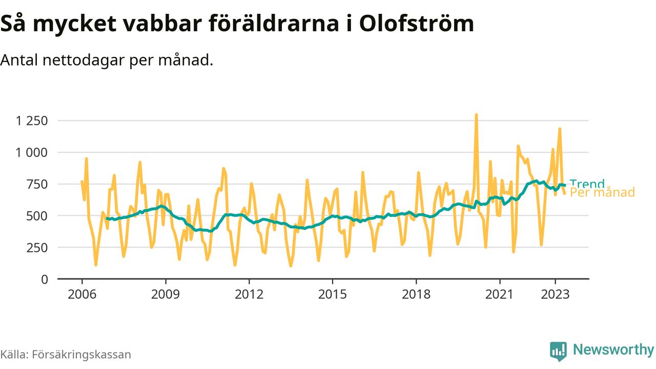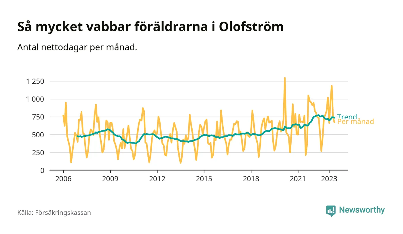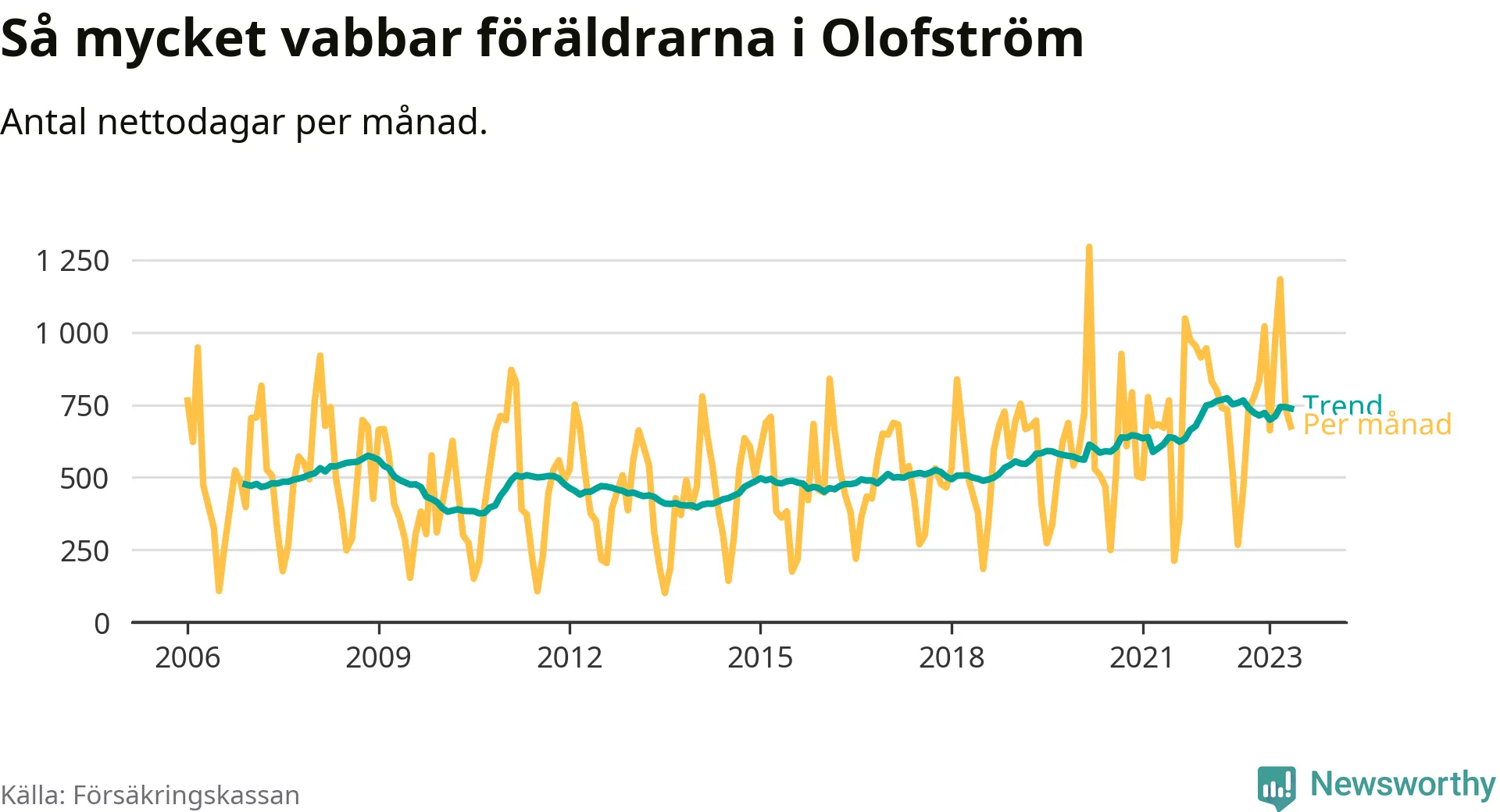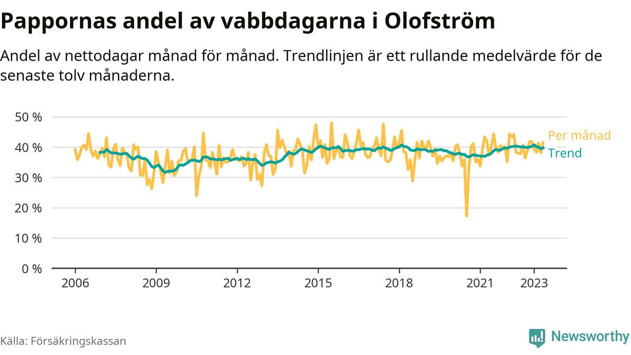 I Olofströms kommun peakade pappornas uttag vintern 2023 då kommunens fäder var uppe i 41 procent av vabbdagarna 1. Under de senaste tolv månaderna har männen stått för 40 procent av vabb i kommunen.