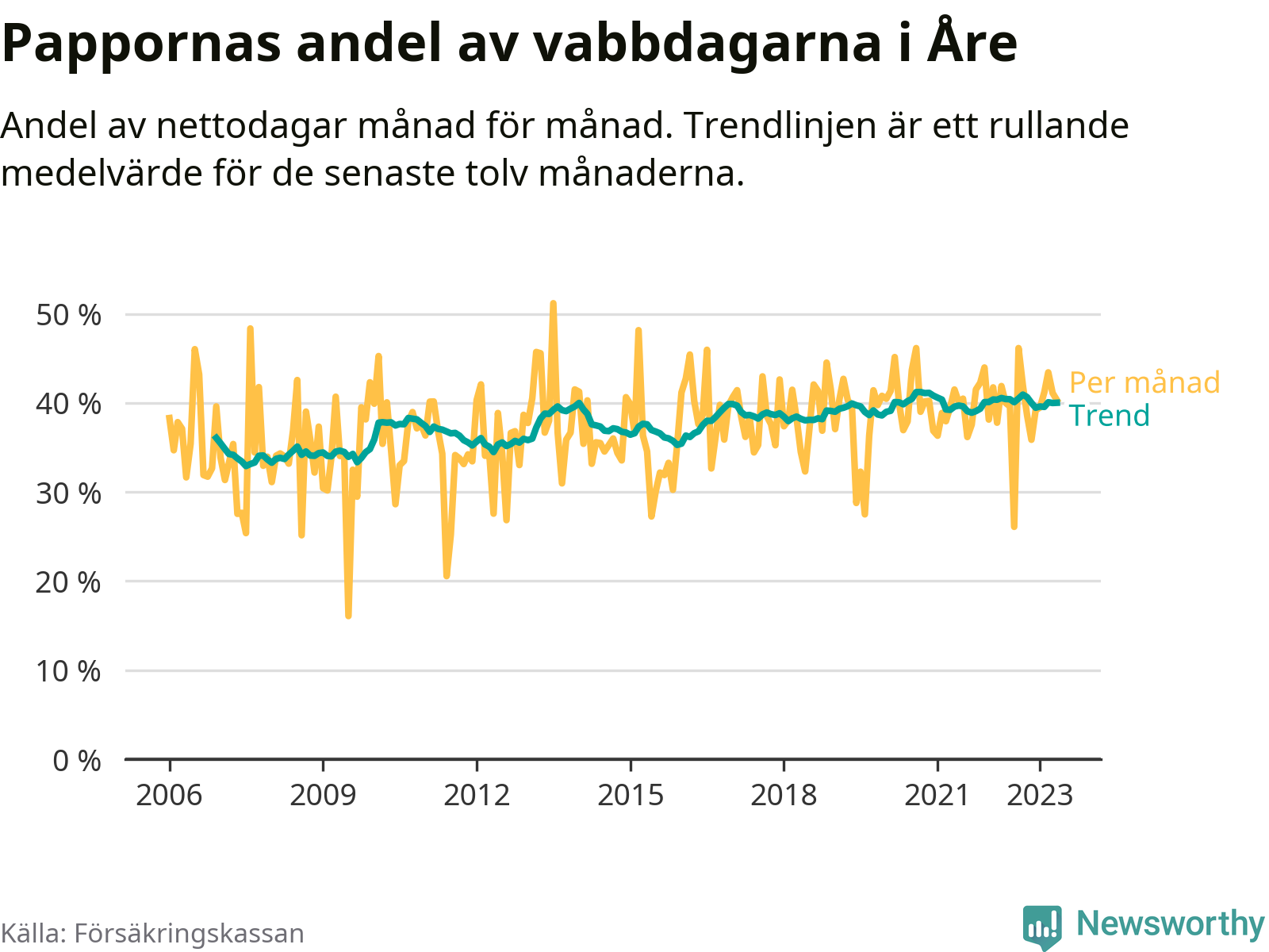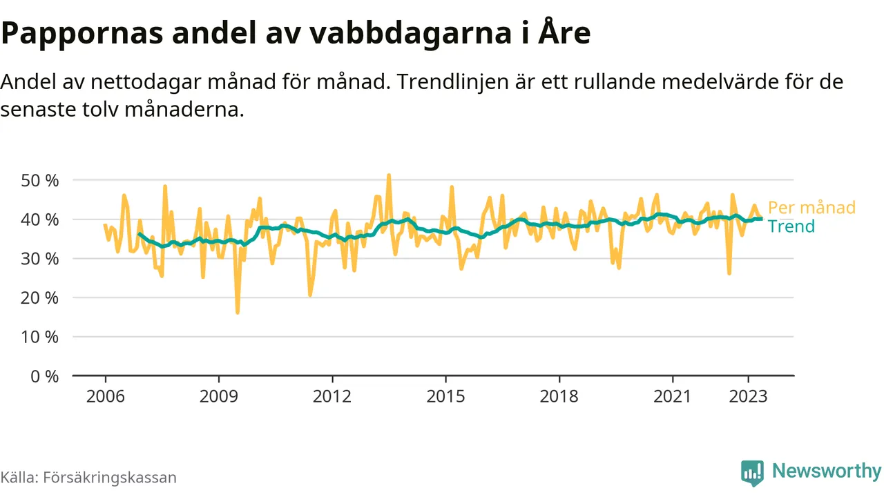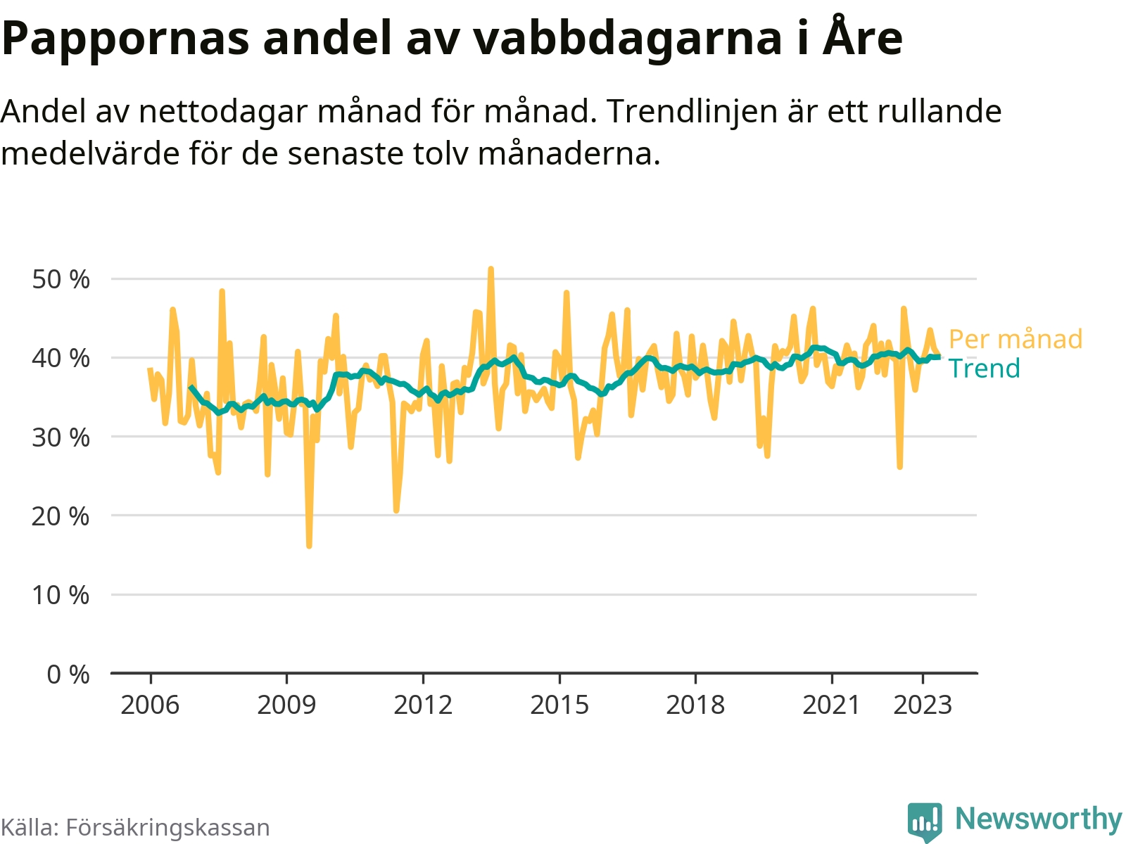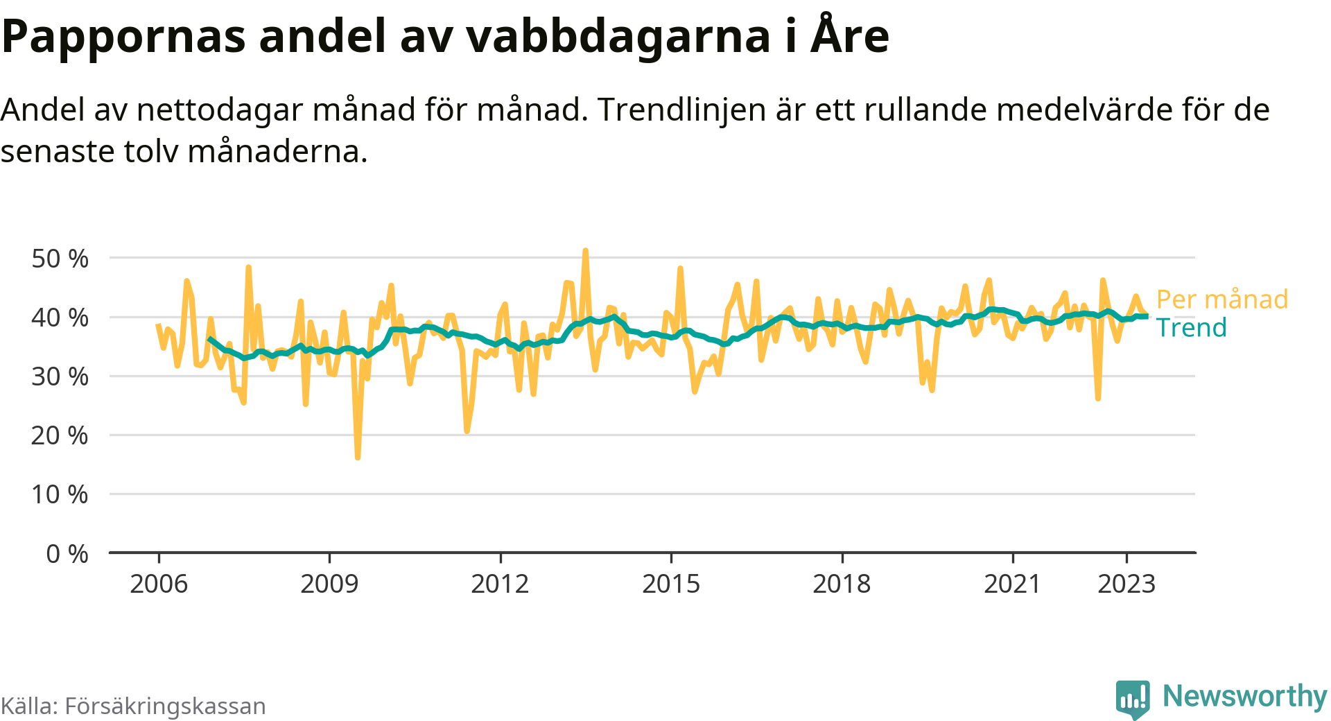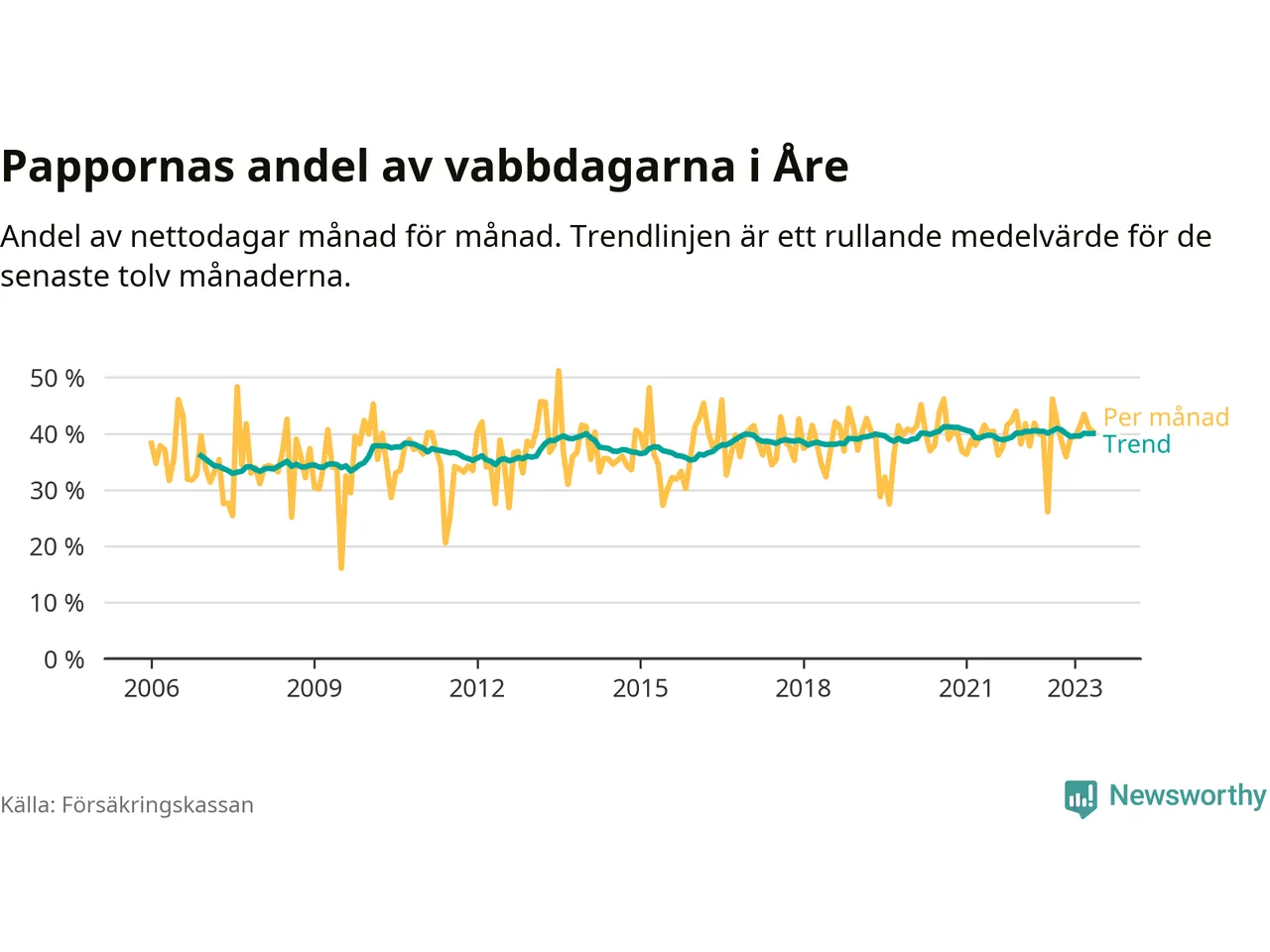 I Åre kommun peakade pappornas uttag hösten 2020 då kommunens fäder var uppe i 41 procent av vabbdagarna 1. Under de senaste tolv månaderna har männen stått för 40 procent av vabb i kommunen.