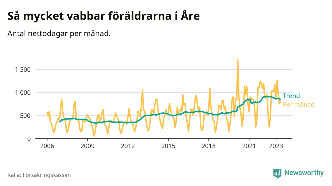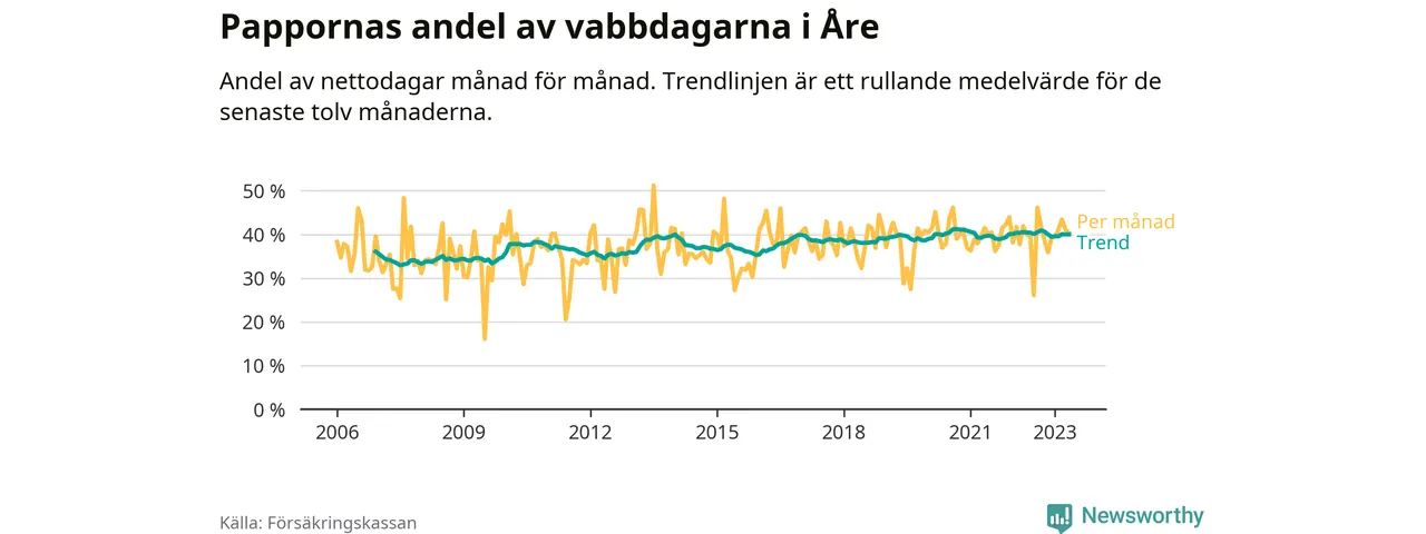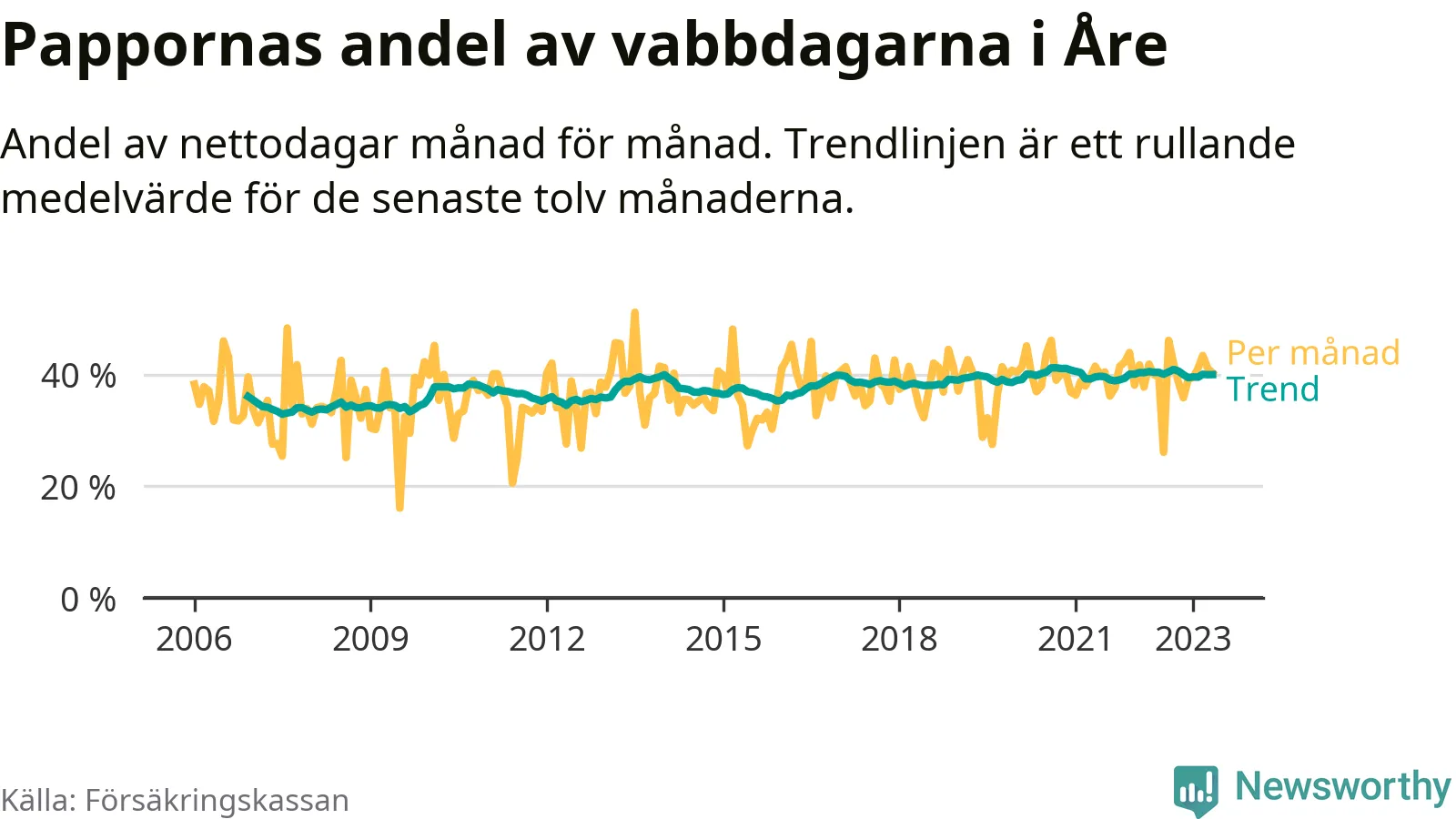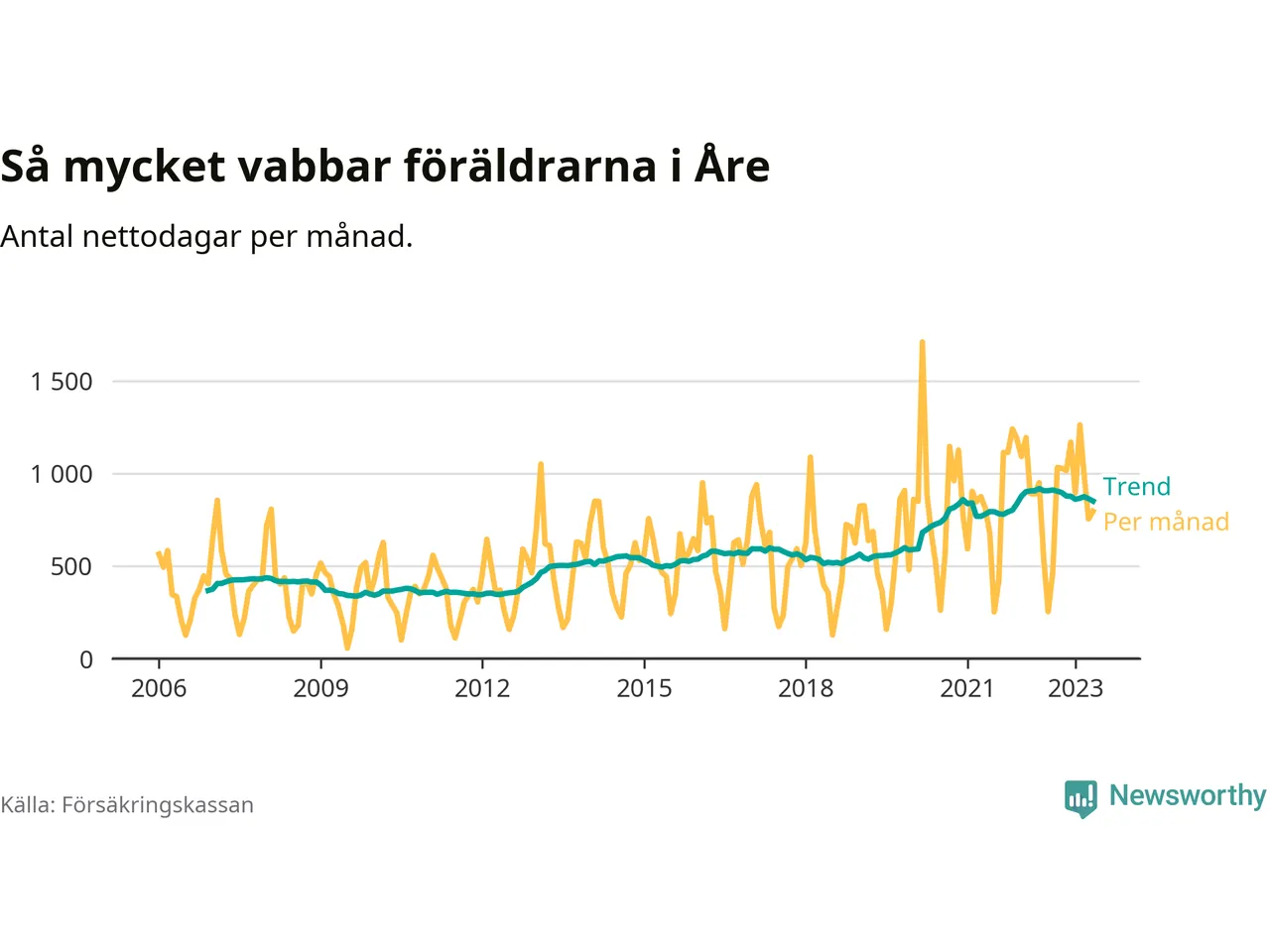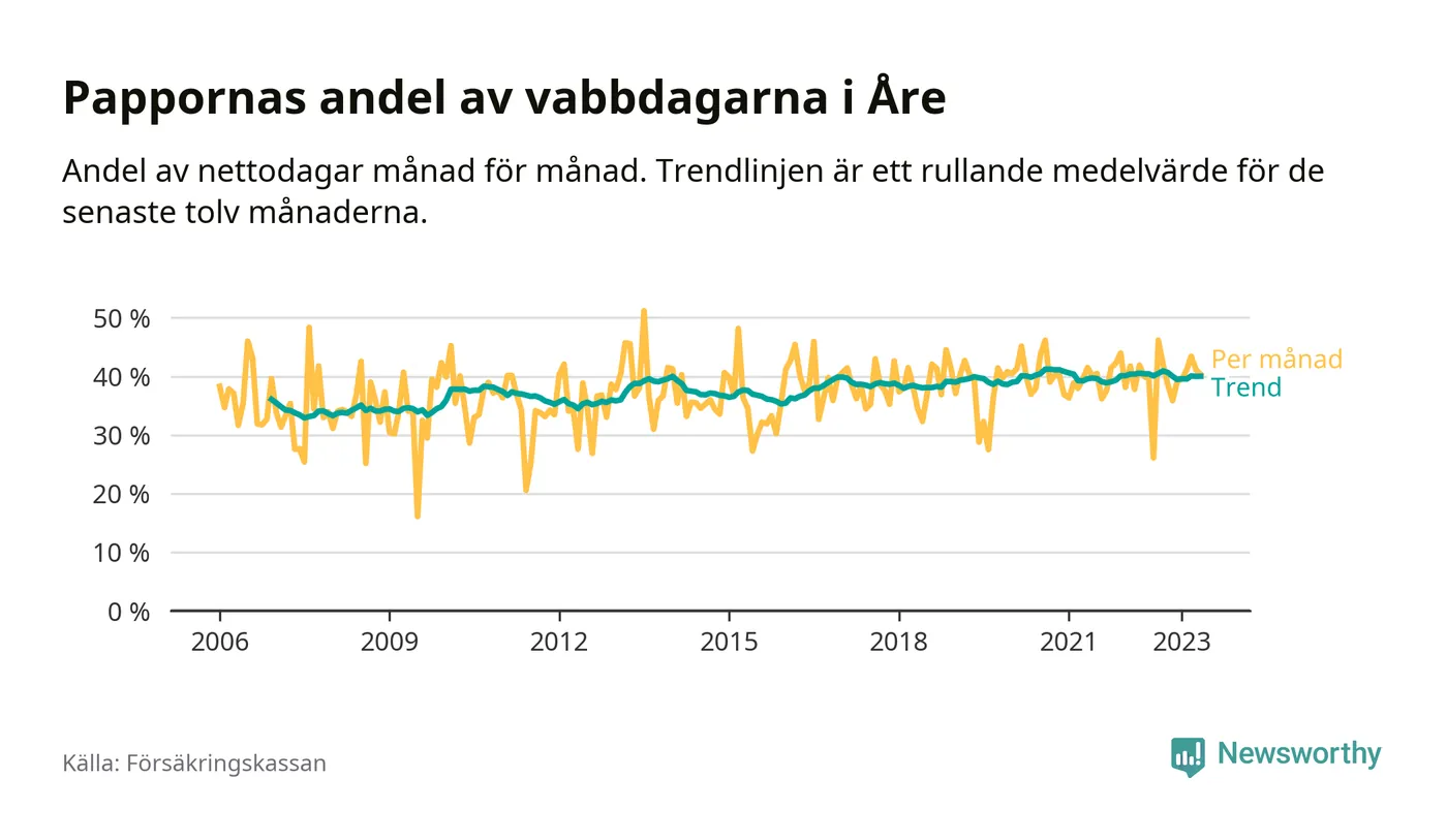 I Åre kommun peakade pappornas uttag hösten 2020 då kommunens fäder var uppe i 41 procent av vabbdagarna 1. Under de senaste tolv månaderna har männen stått för 40 procent av vabb i kommunen.