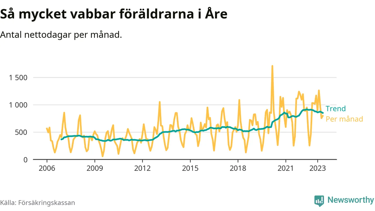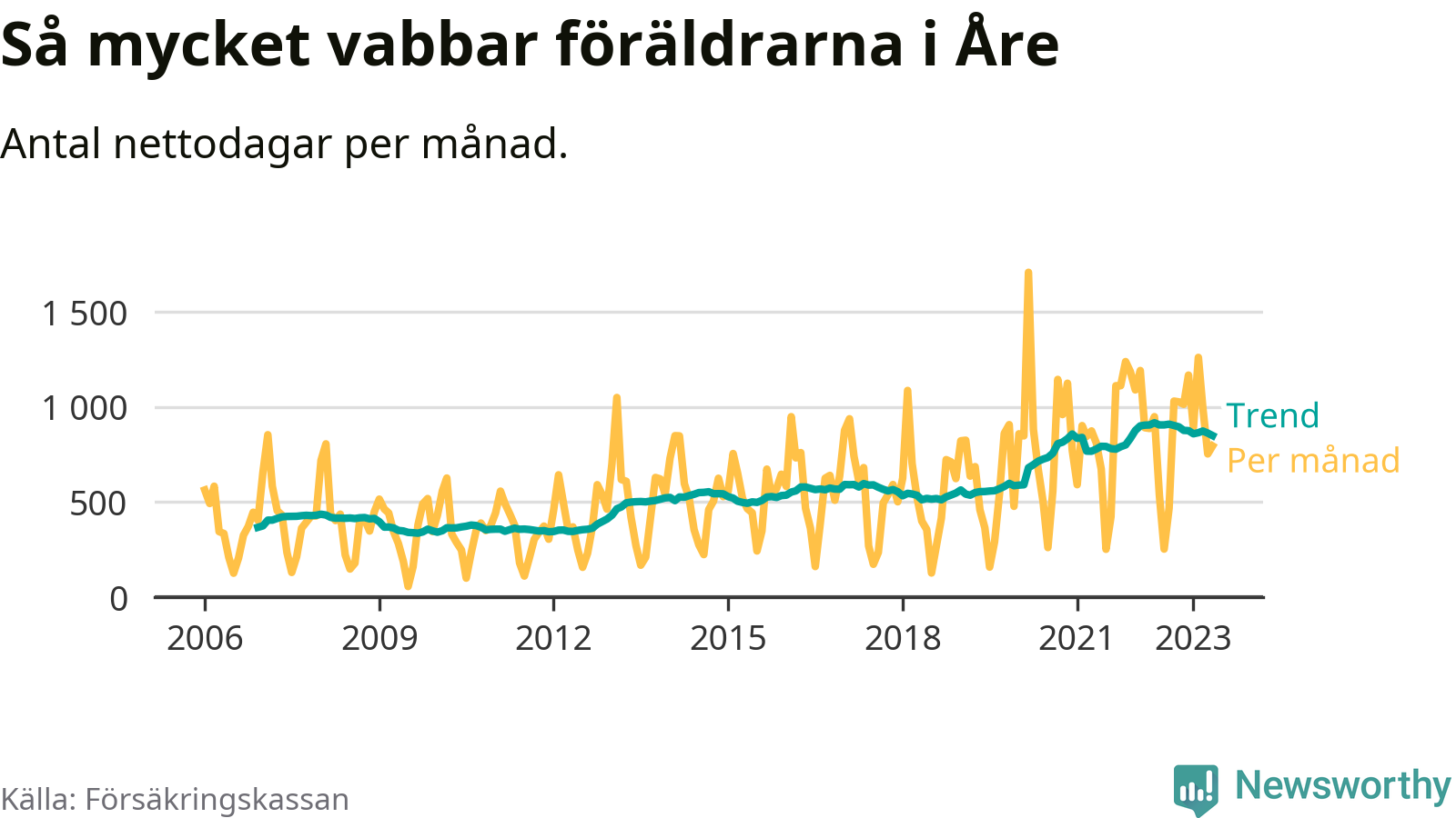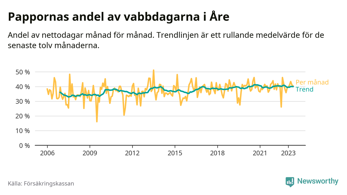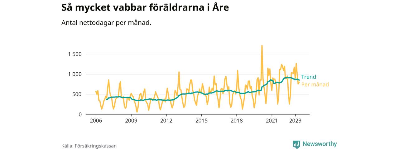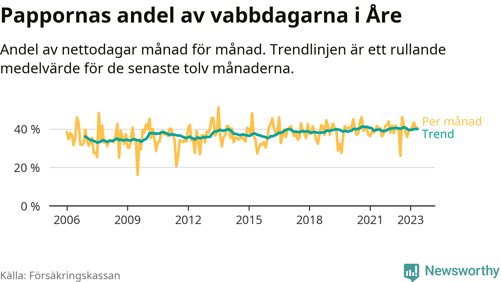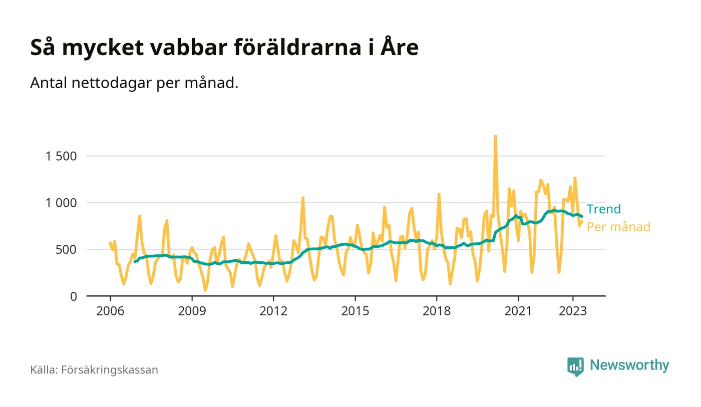 I Åre kommun peakade pappornas uttag hösten 2020 då kommunens fäder var uppe i 41 procent av vabbdagarna 1. Under de senaste tolv månaderna har männen stått för 40 procent av vabb i kommunen.