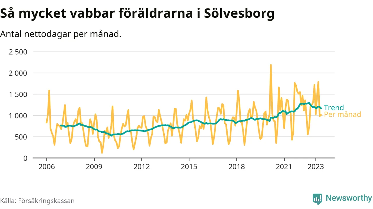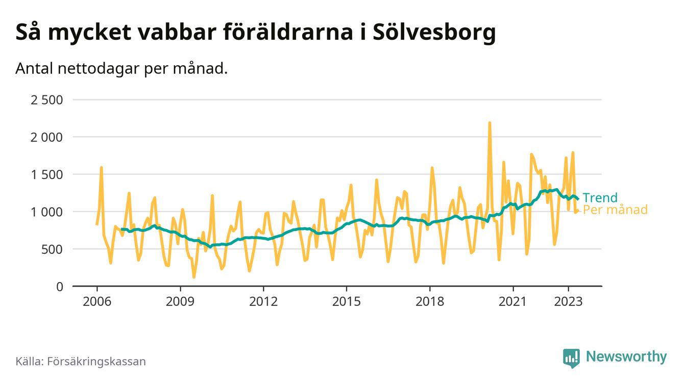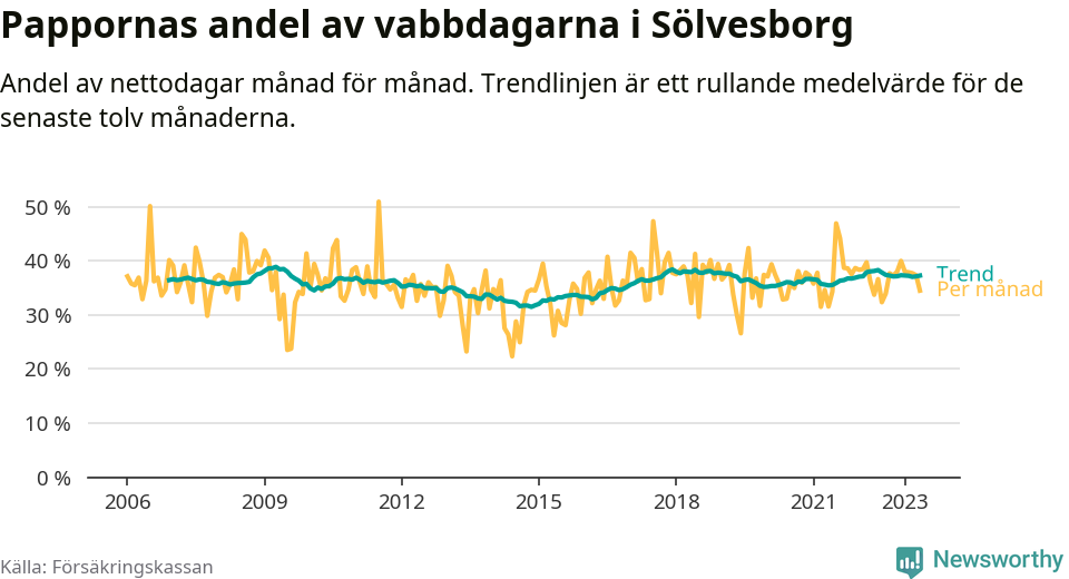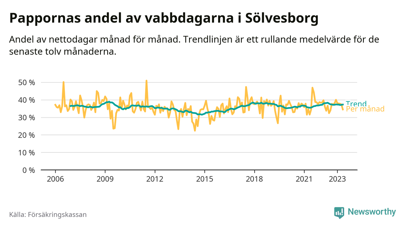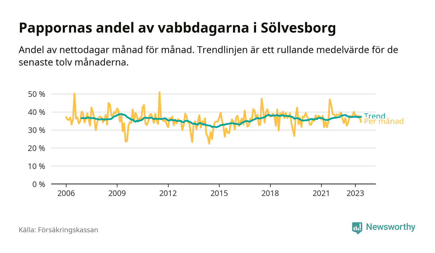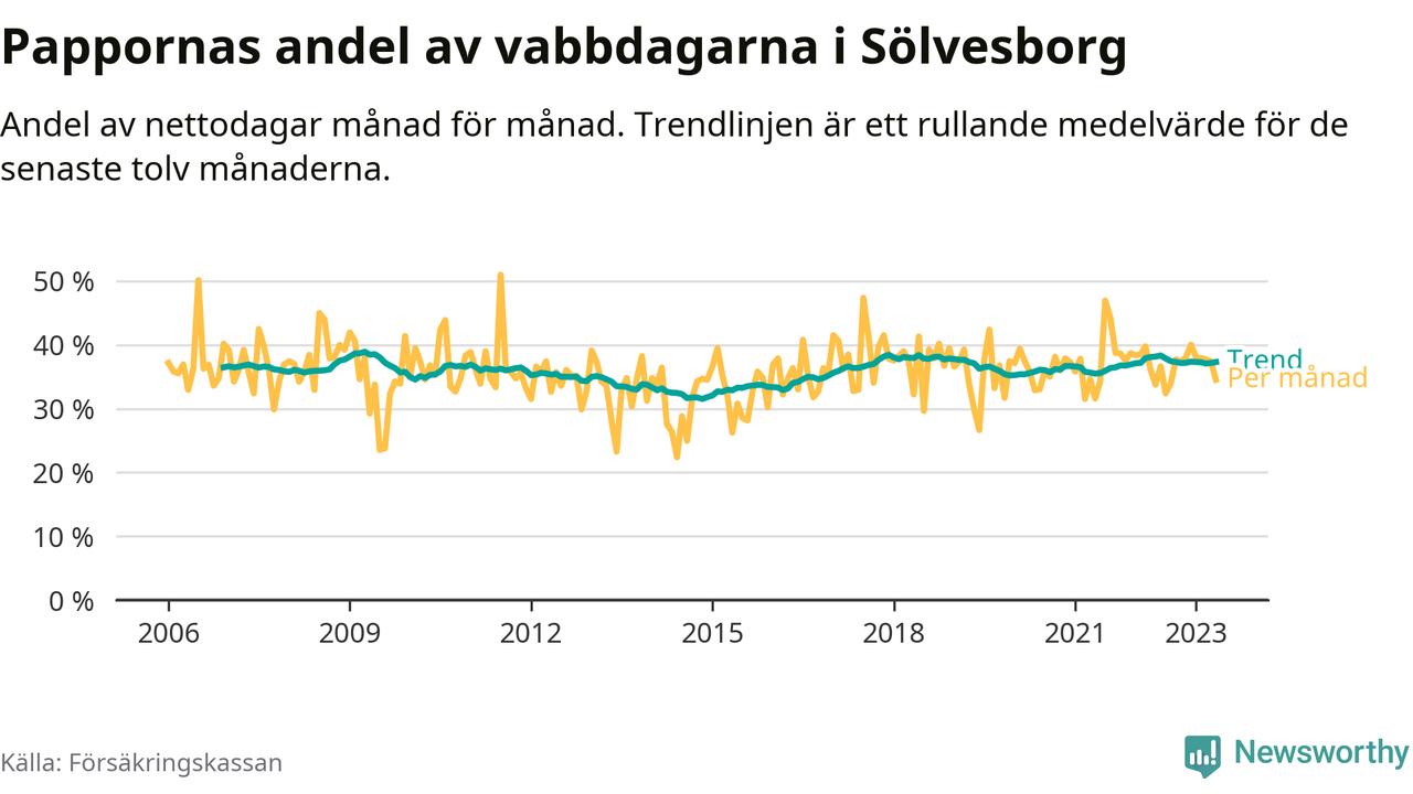 I Sölvesborgs kommun peakade pappornas uttag våren 2009 då kommunens fäder var uppe i 39 procent av vabbdagarna 1. Under de senaste tolv månaderna har männen stått för 37 procent av vabb i kommunen.