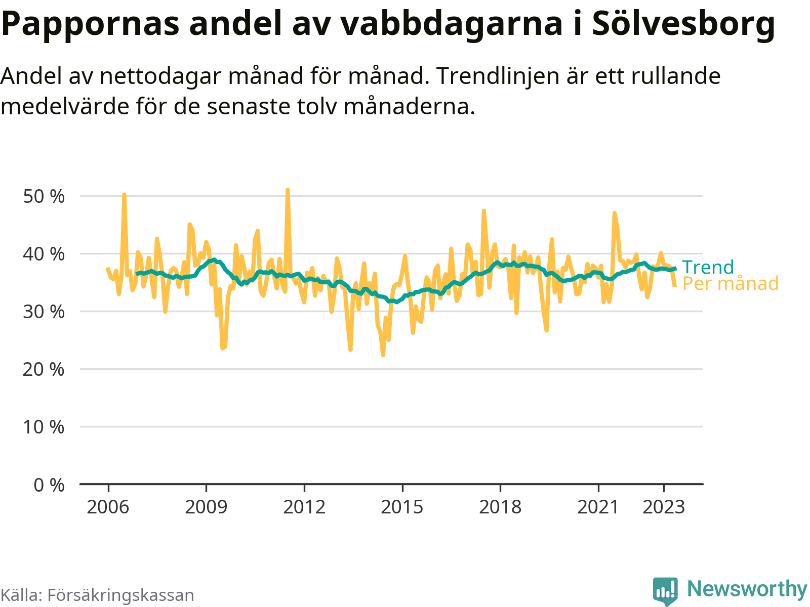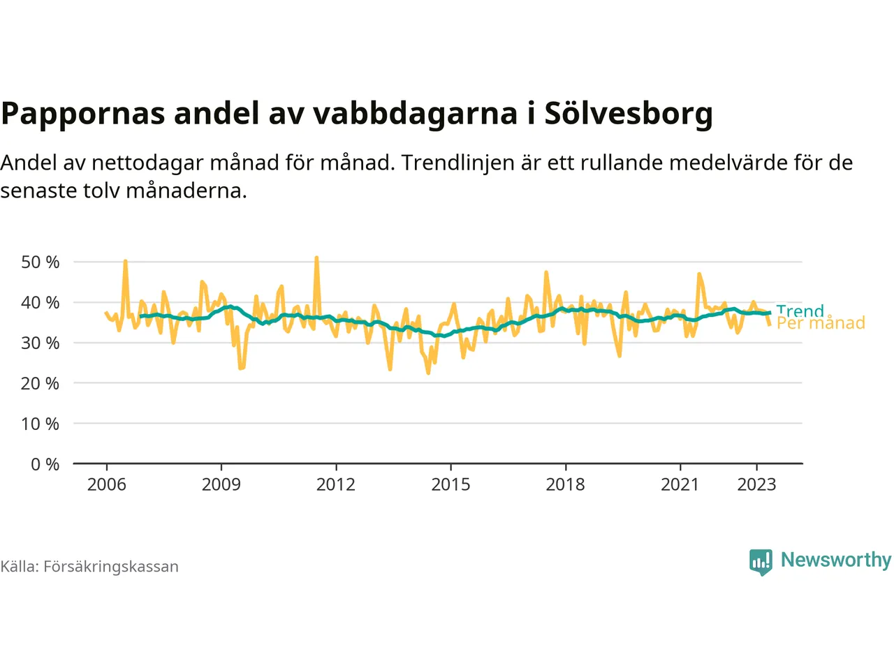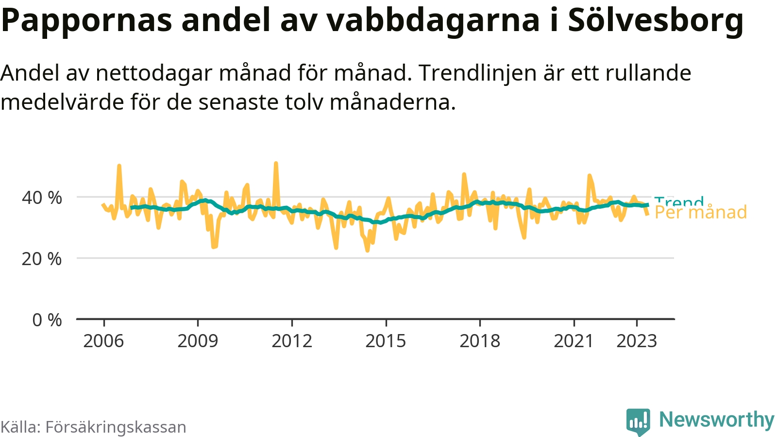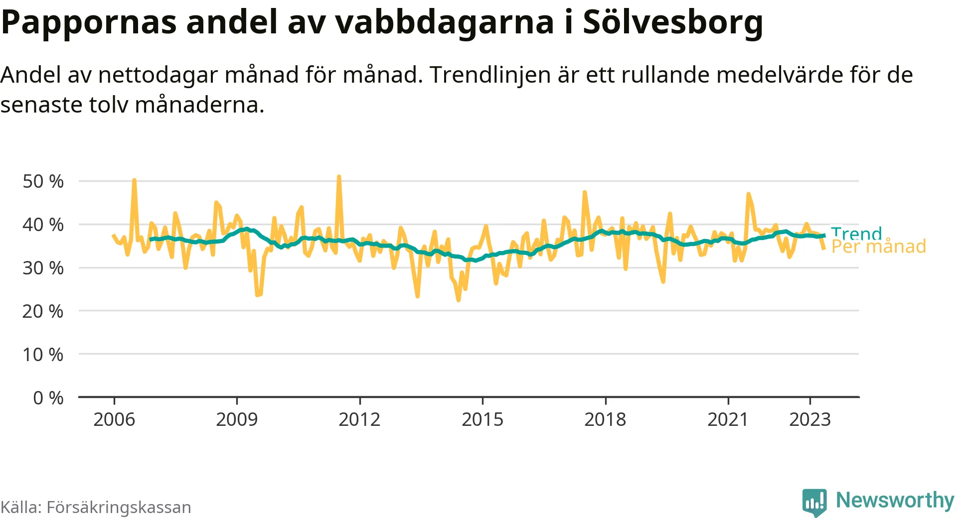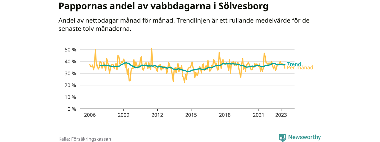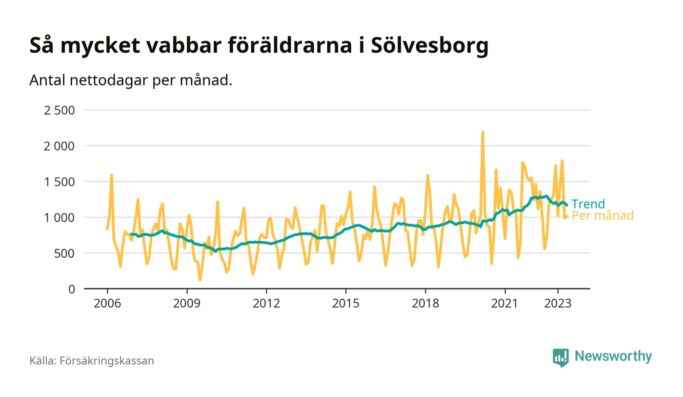 I Sölvesborgs kommun peakade pappornas uttag våren 2009 då kommunens fäder var uppe i 39 procent av vabbdagarna 1. Under de senaste tolv månaderna har männen stått för 37 procent av vabb i kommunen.