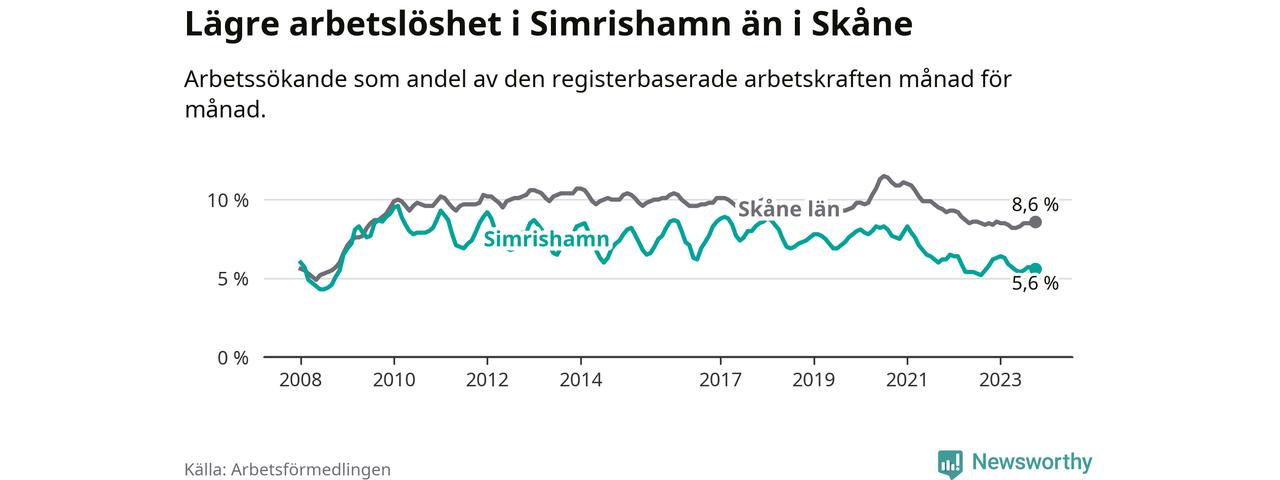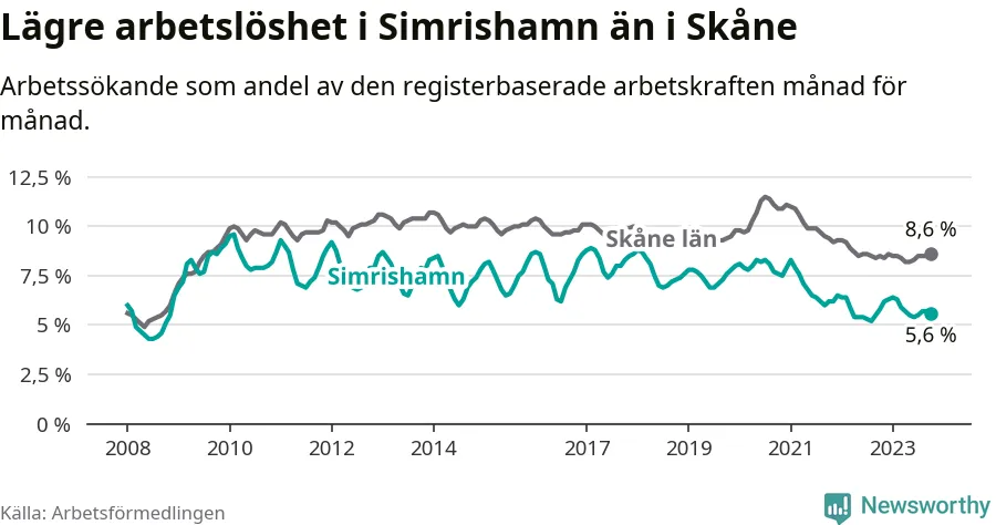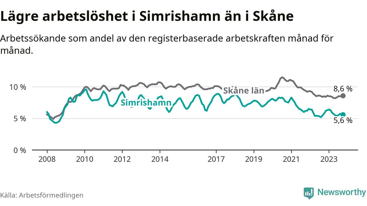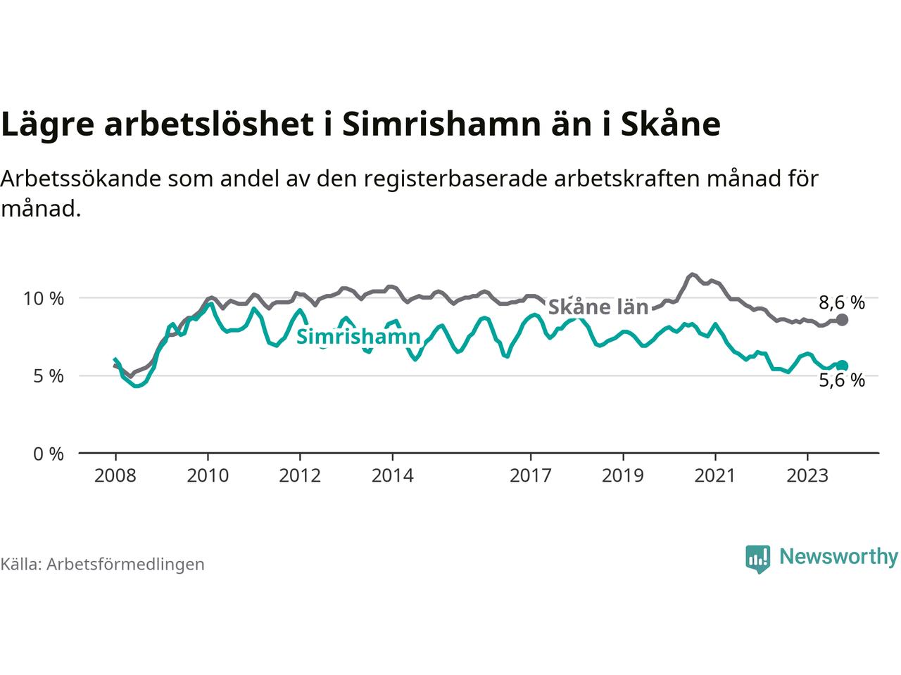 Under oktober månad rapporterade Simrishamns kommun en total arbetslöshet på 5,6 procent. Det är en minskning jämfört med samma tidpunkt i fjol (−0,2 procentenheter). I Skåne län däremot stiger arbetslösheten något.