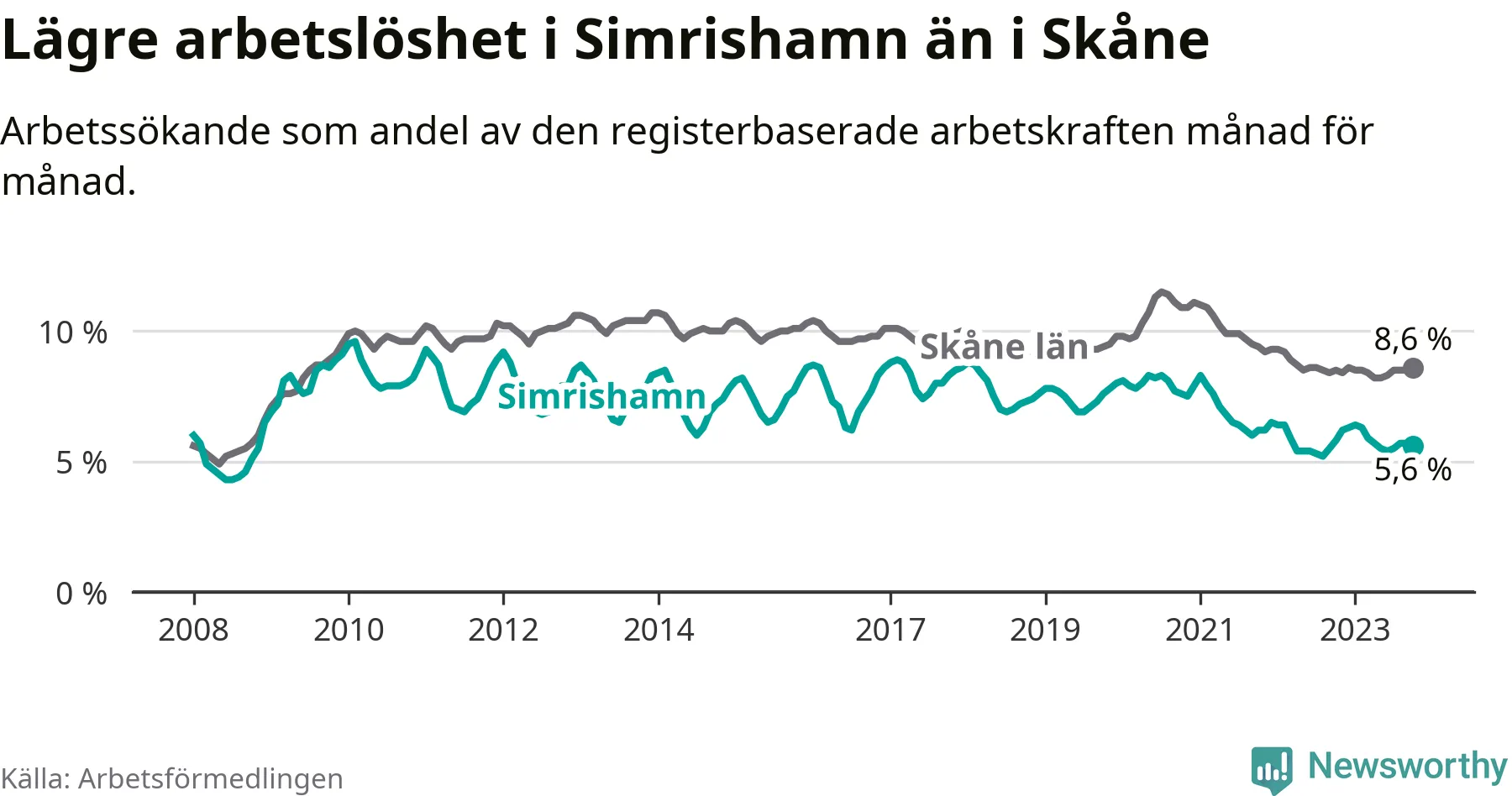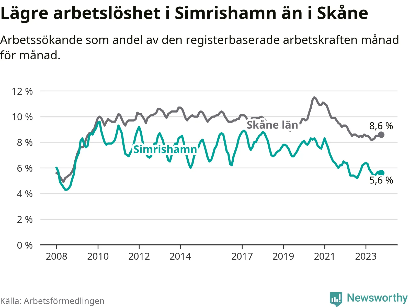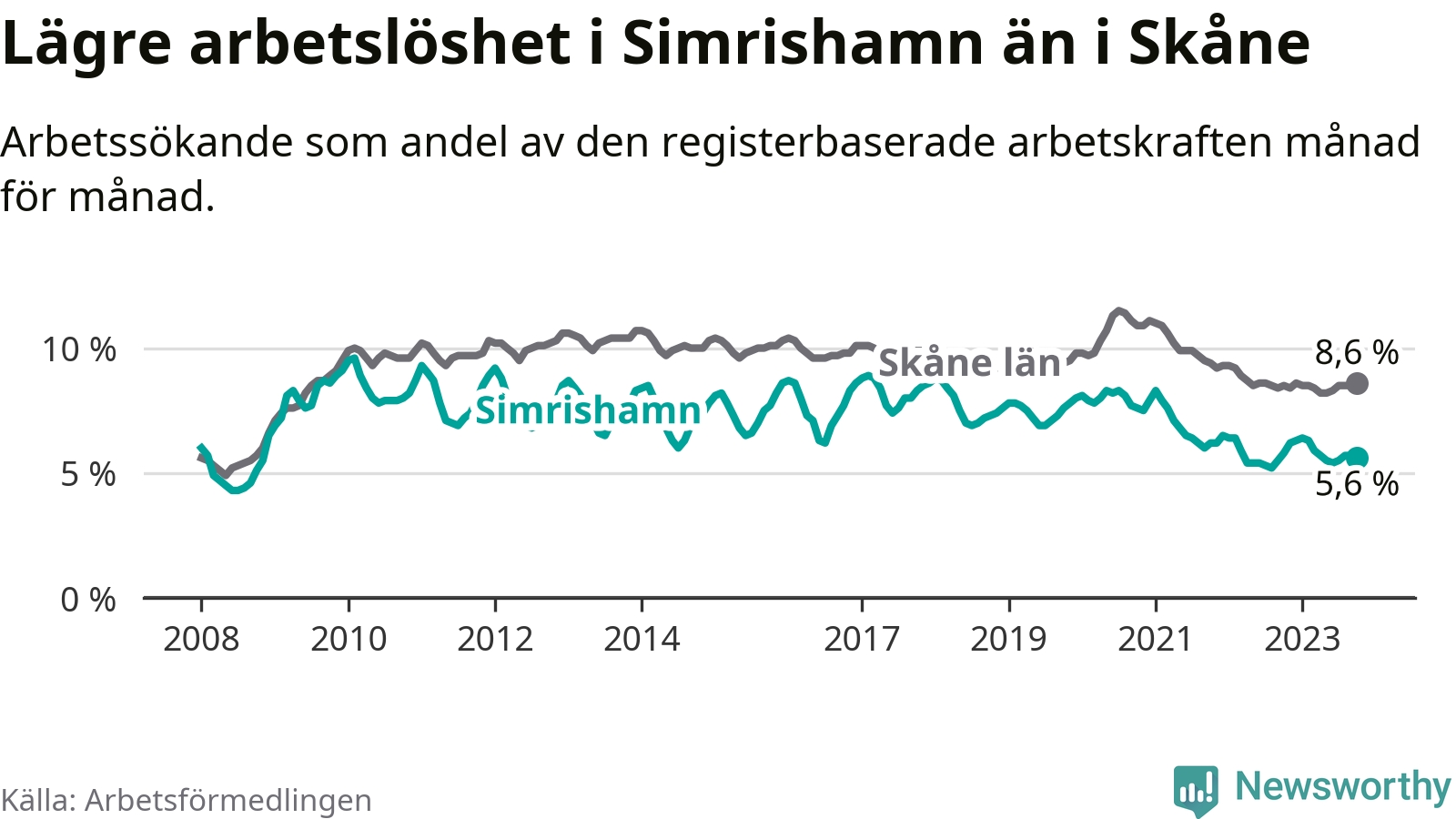 Under oktober månad rapporterade Simrishamns kommun en total arbetslöshet på 5,6 procent. Det är en minskning jämfört med samma tidpunkt i fjol (−0,2 procentenheter). I Skåne län däremot stiger arbetslösheten något.