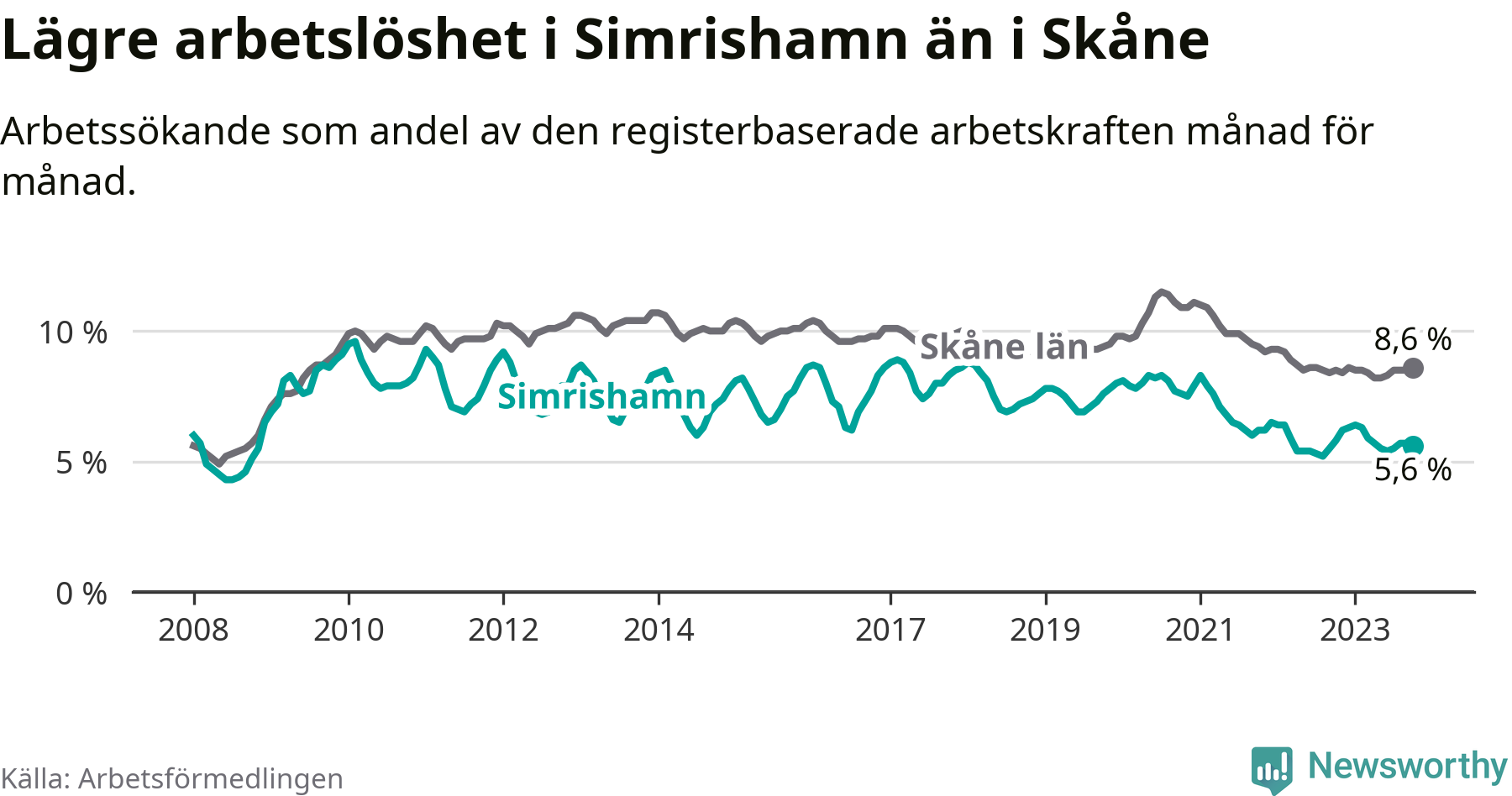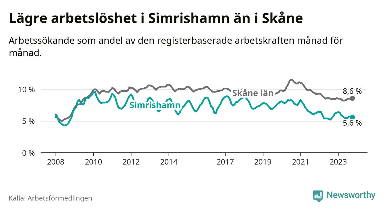 Simrishamn hade redan tidigare lägre arbetslöshet än snittet i hela Skåne län och nu växer klyftan (5,6 procent i kommunen, jämfört med 8,6 procent i hela länet). Vellinge har den lägsta arbetslösheten i länet (3,3 procent), medan Malmö har den högsta (12,3 procent). För att Simrishamn skulle komma ner i samma arbetslöshetsnivå som Vellinge skulle 186 personer behöva sysselsättas.