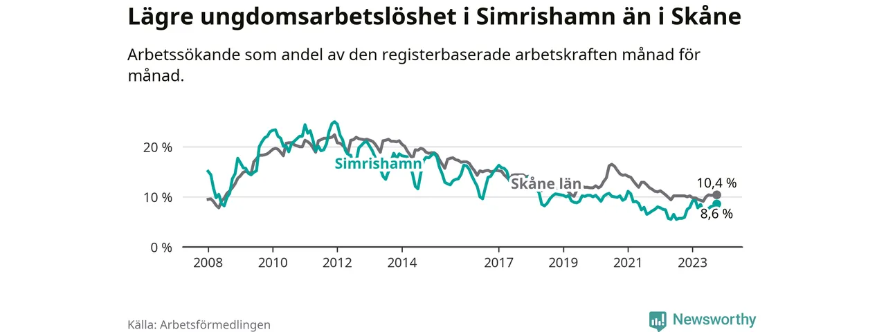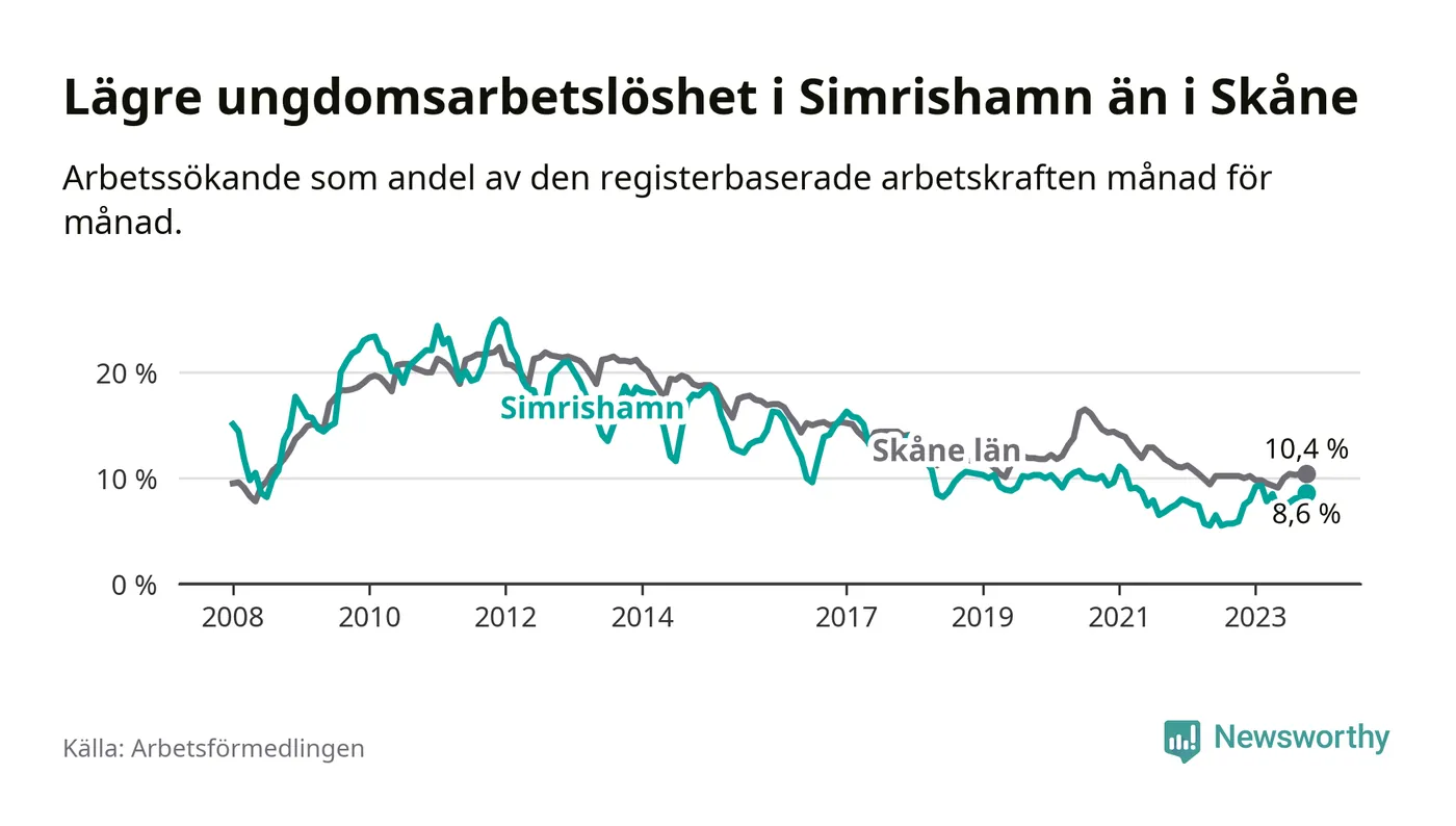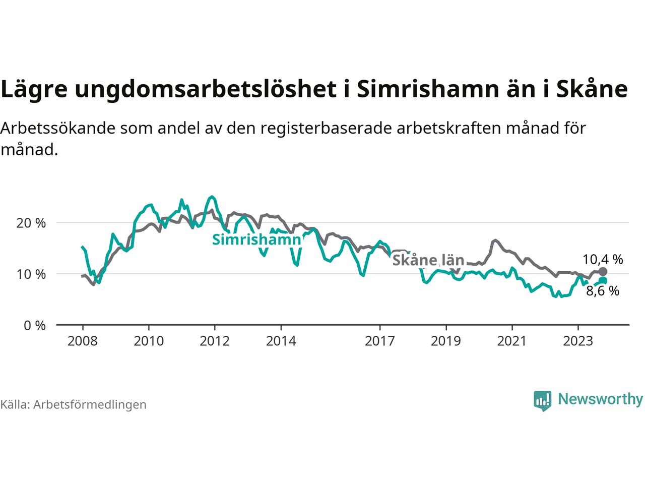 Precis som den totala arbetslösheten ligger ungdomsarbetslösheten i Simrishamn lägre än i Skåne som helhet. Skillnaden mellan kommunen och länet är 1,8 procentenheter.