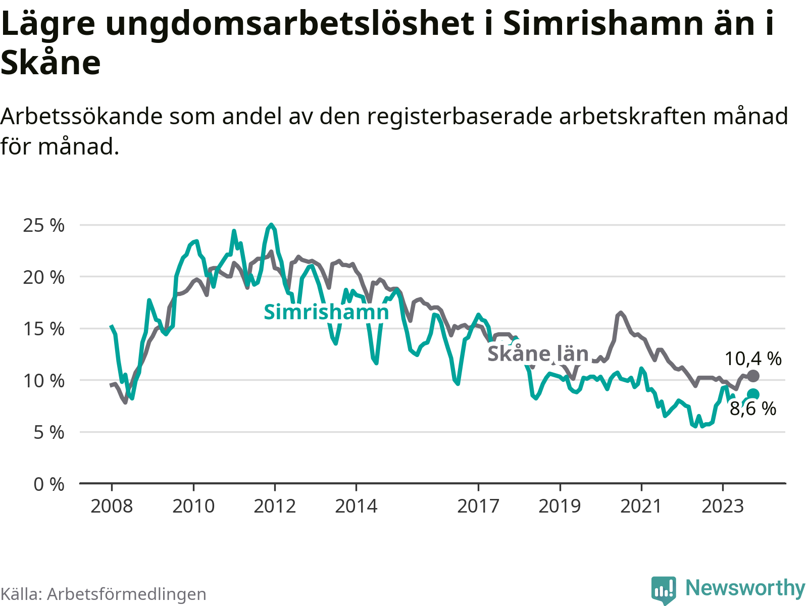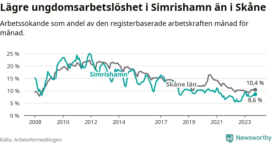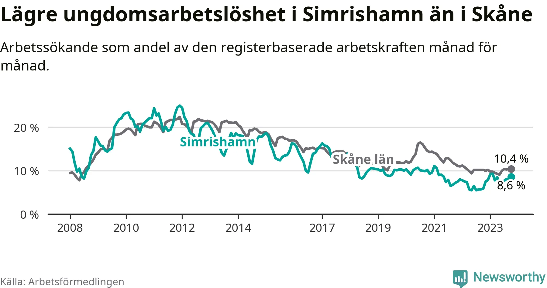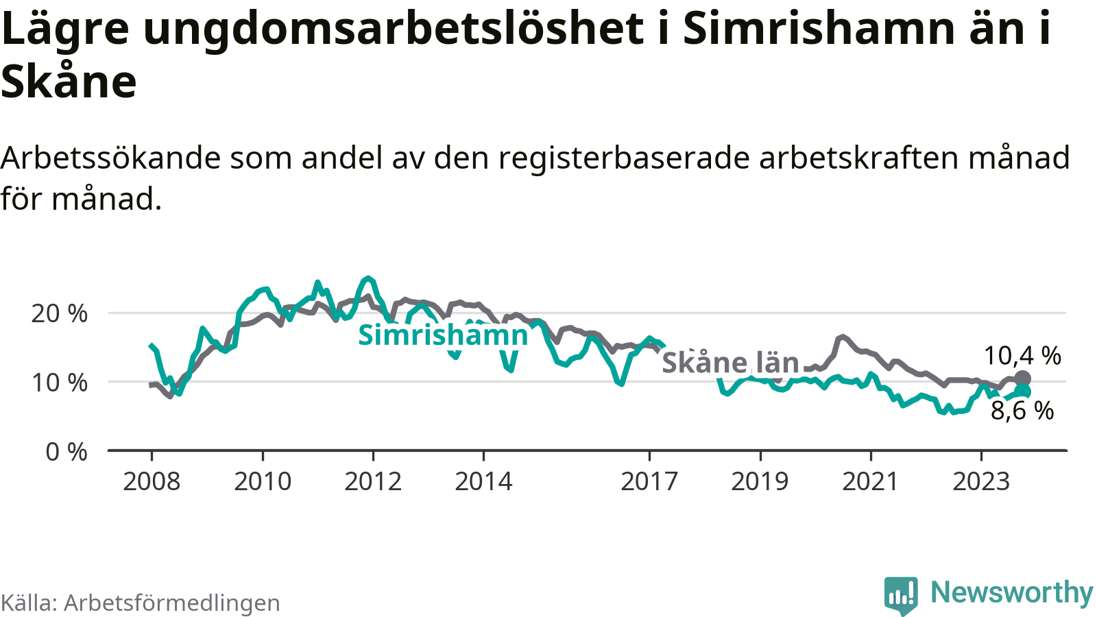 Precis som den totala arbetslösheten ligger ungdomsarbetslösheten i Simrishamn lägre än i Skåne som helhet. Skillnaden mellan kommunen och länet är 1,8 procentenheter.