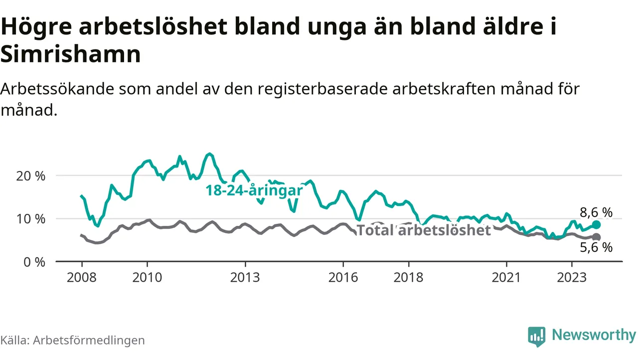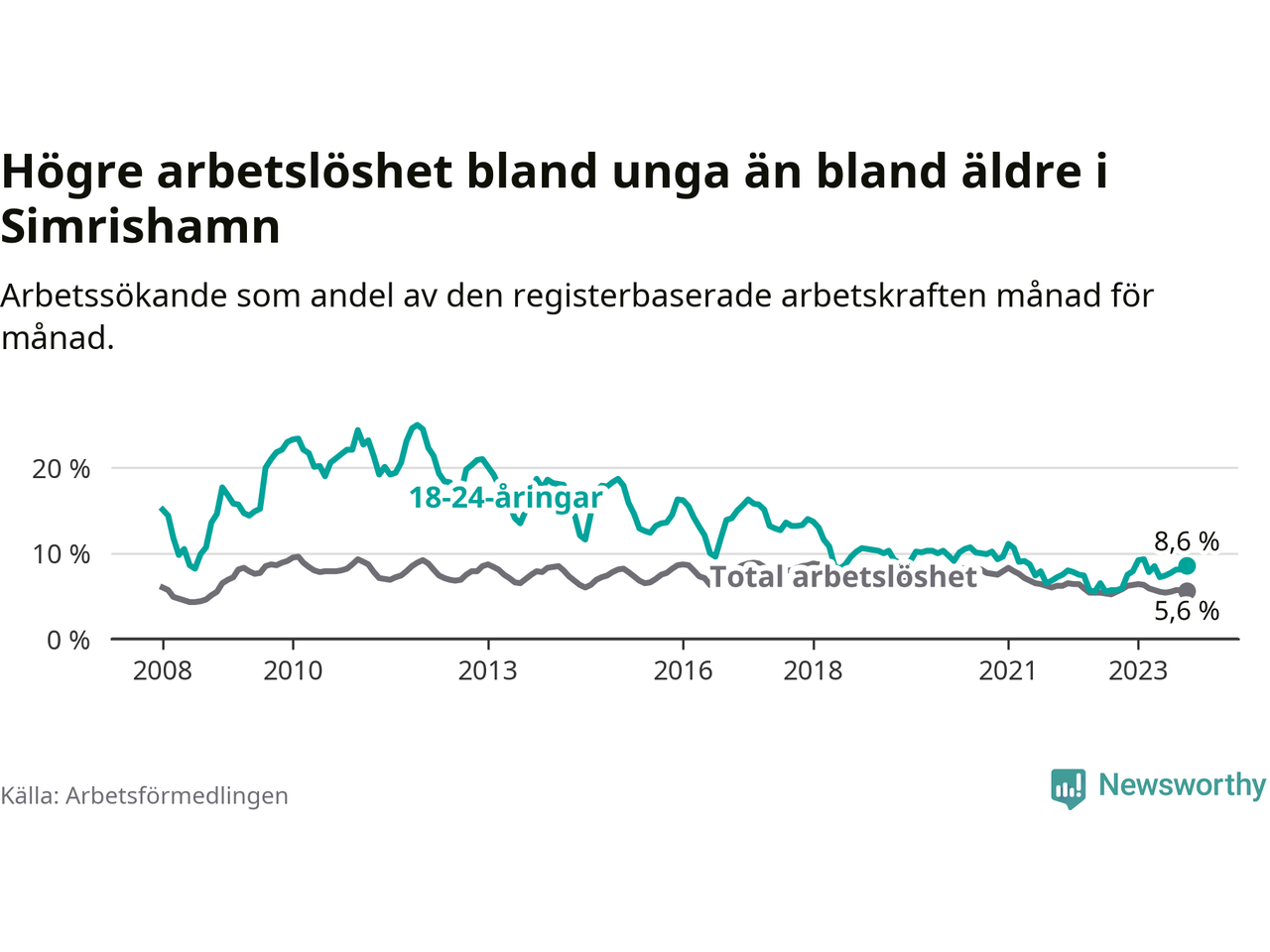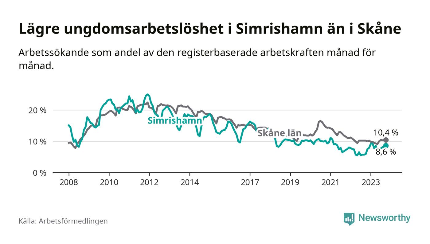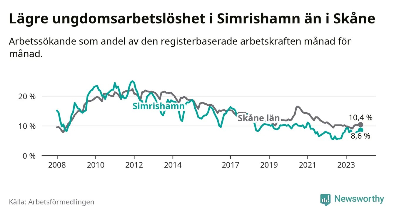 Den senaste månadsstatistiken från Arbetsförmedlingen visar på en uppgång i ungdomsarbetslöshet i Simrishamns kommun med 2,7 procentenheter. Arbetslösheten bland personer i åldern 18–24 år låg i oktober på 8,6 procent.