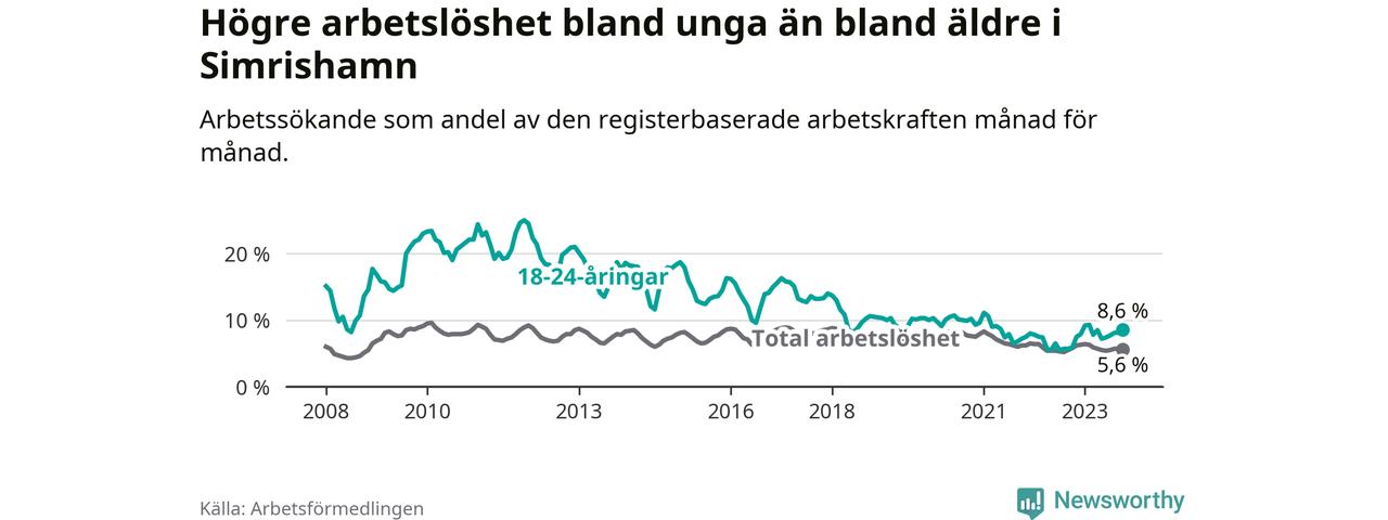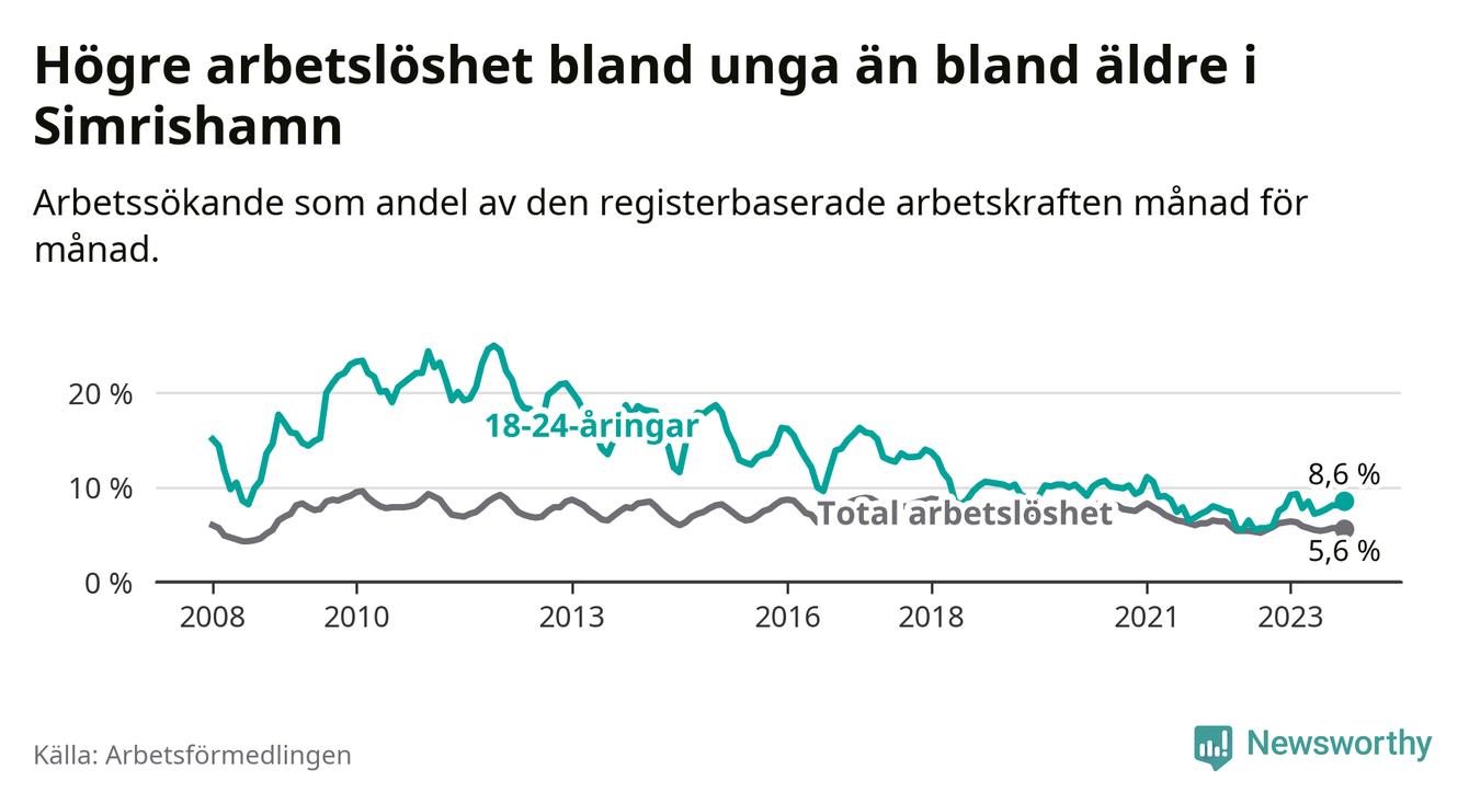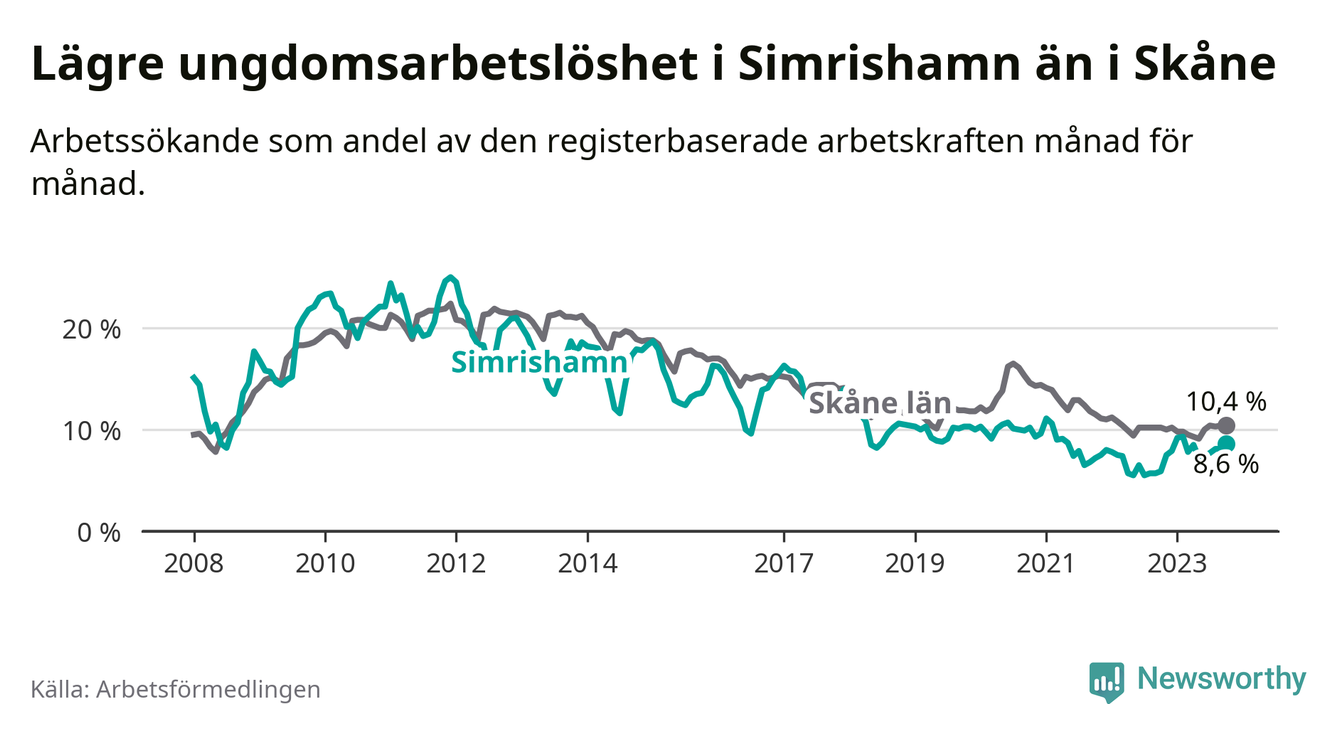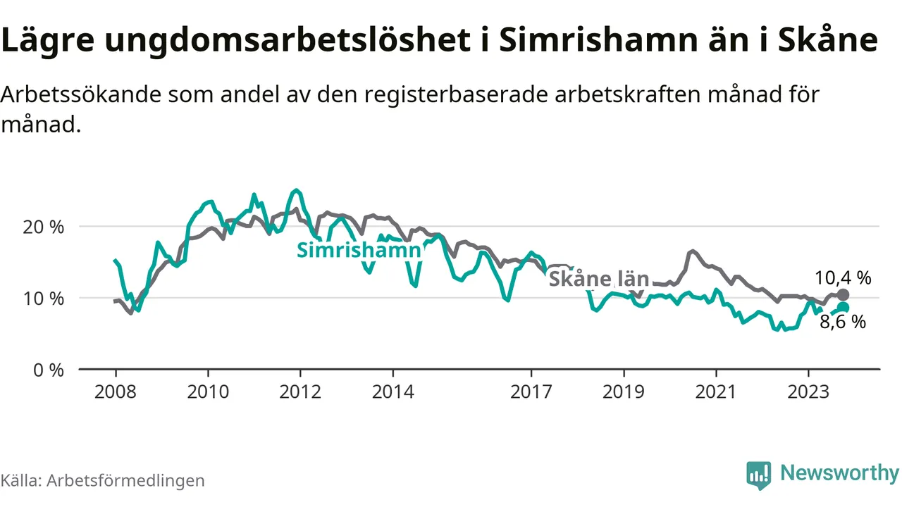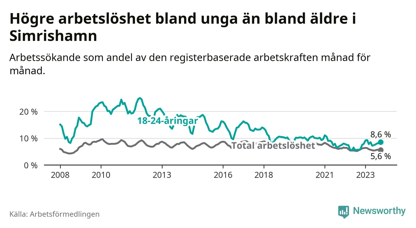 Den senaste månadsstatistiken från Arbetsförmedlingen visar på en uppgång i ungdomsarbetslöshet i Simrishamns kommun med 2,7 procentenheter. Arbetslösheten bland personer i åldern 18–24 år låg i oktober på 8,6 procent.