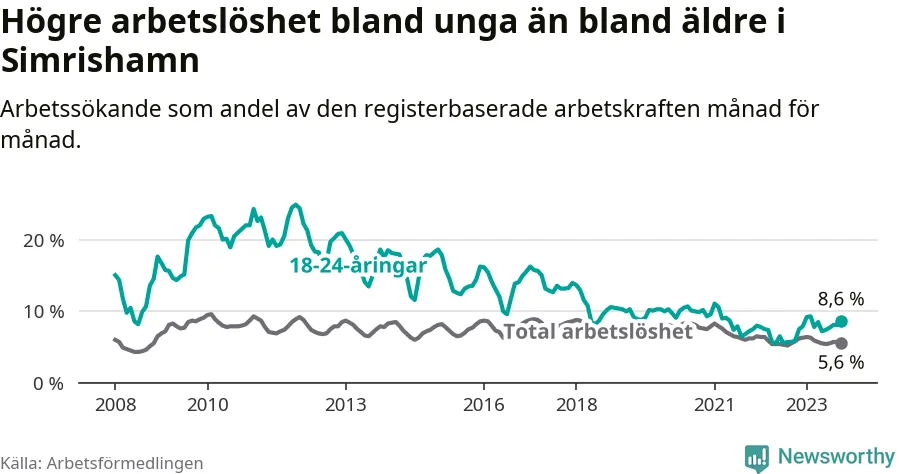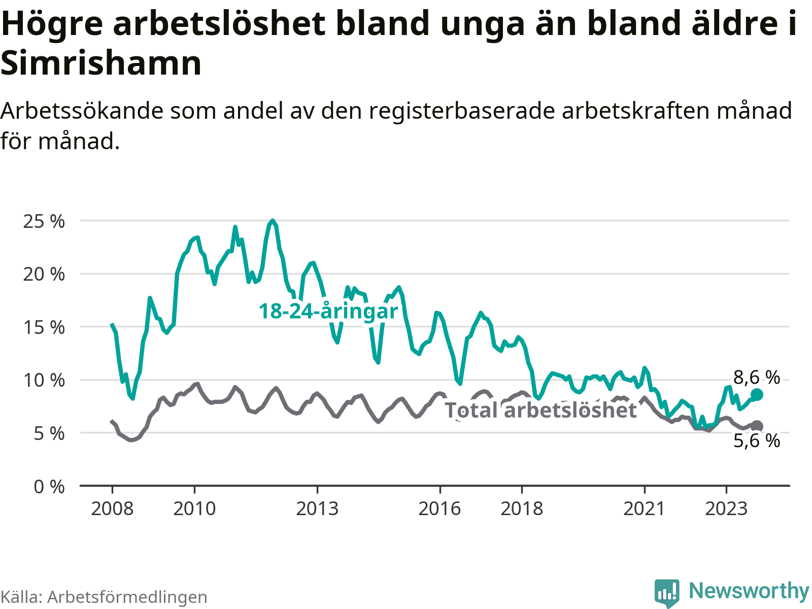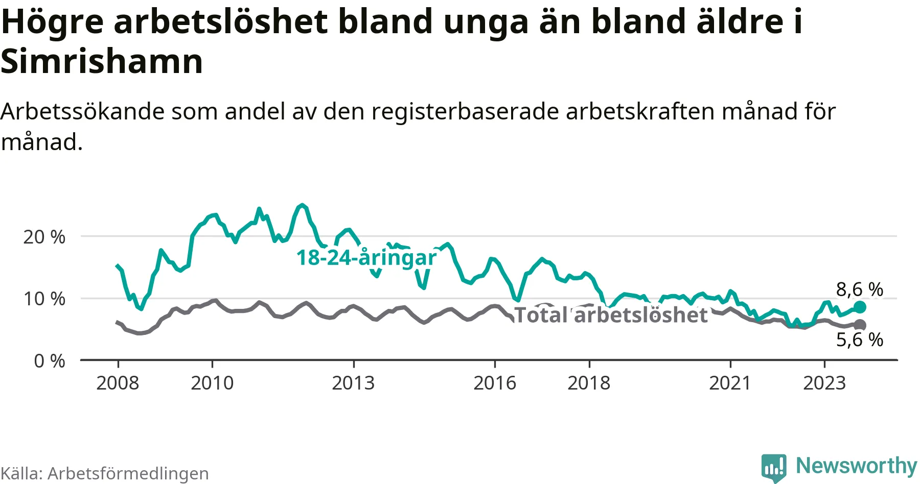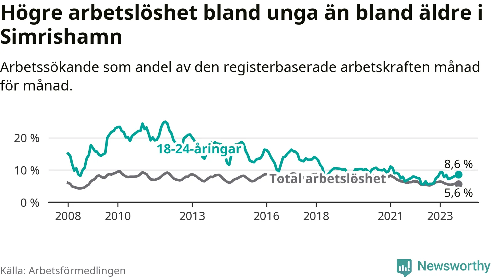 Den senaste månadsstatistiken från Arbetsförmedlingen visar på en uppgång i ungdomsarbetslöshet i Simrishamns kommun med 2,7 procentenheter. Arbetslösheten bland personer i åldern 18–24 år låg i oktober på 8,6 procent.