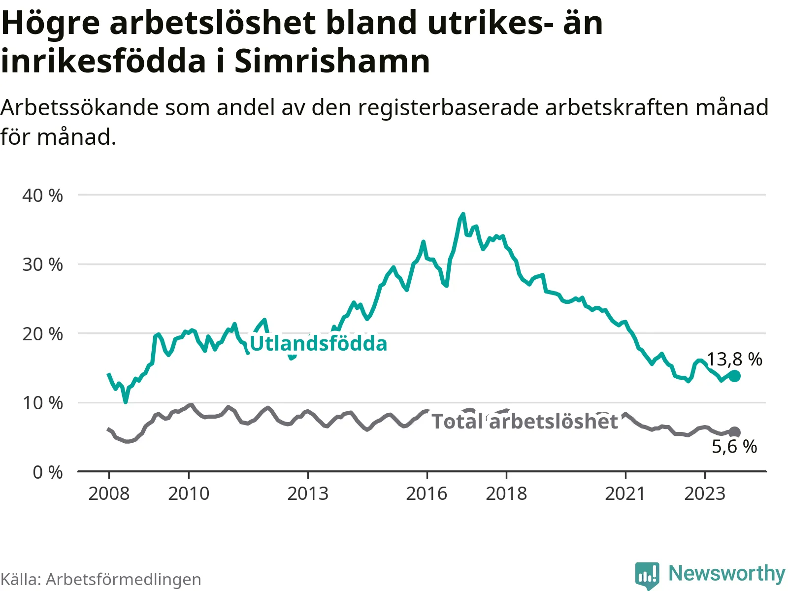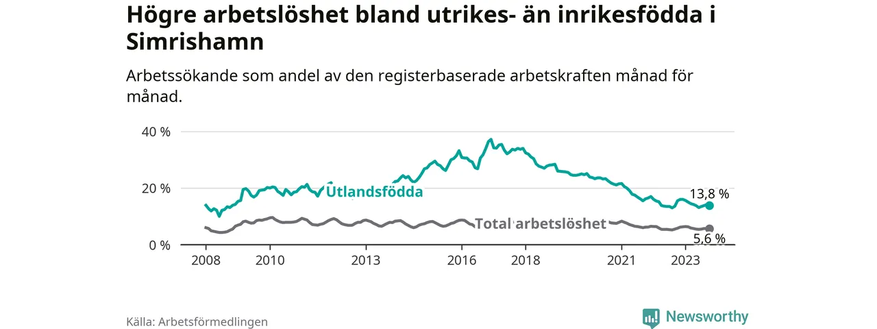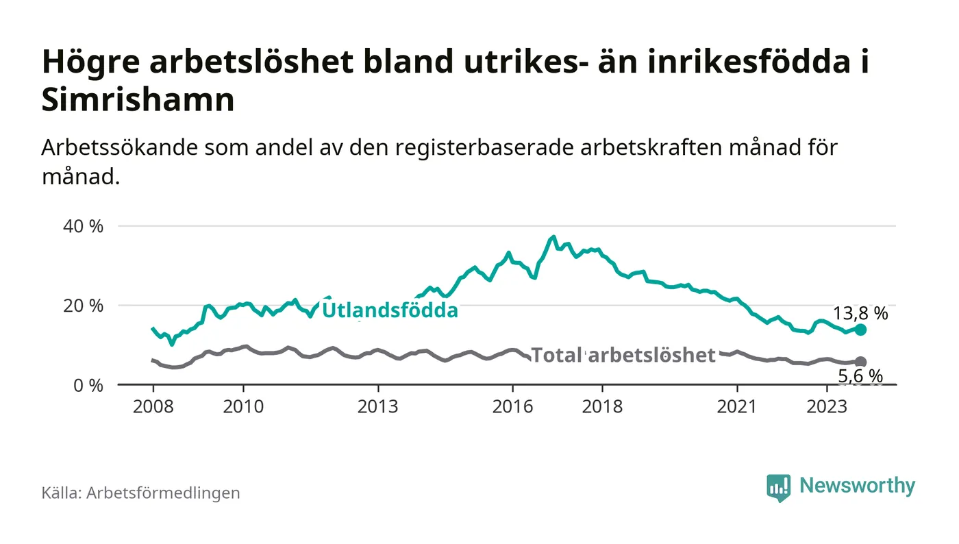 Skillnaden i arbetslöshet mellan utrikesfödda och hela befolkningen är 8,2 procentenheter i Simrishamn. Det är en betydligt mindre skillnad än för ett år sedan (−1,5 procentenheter).