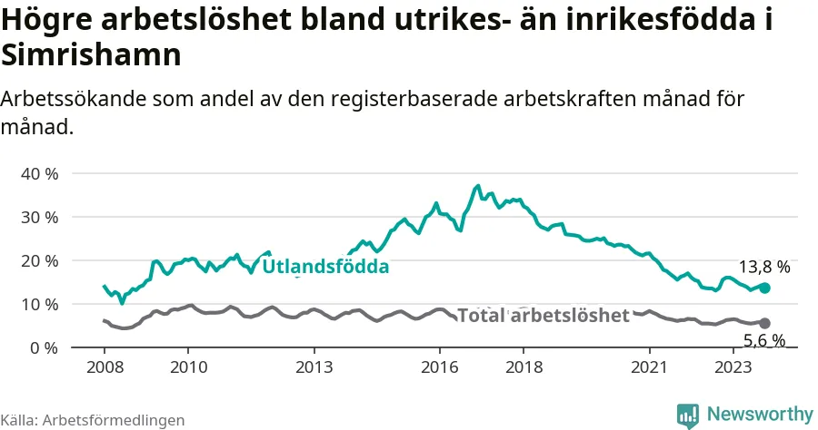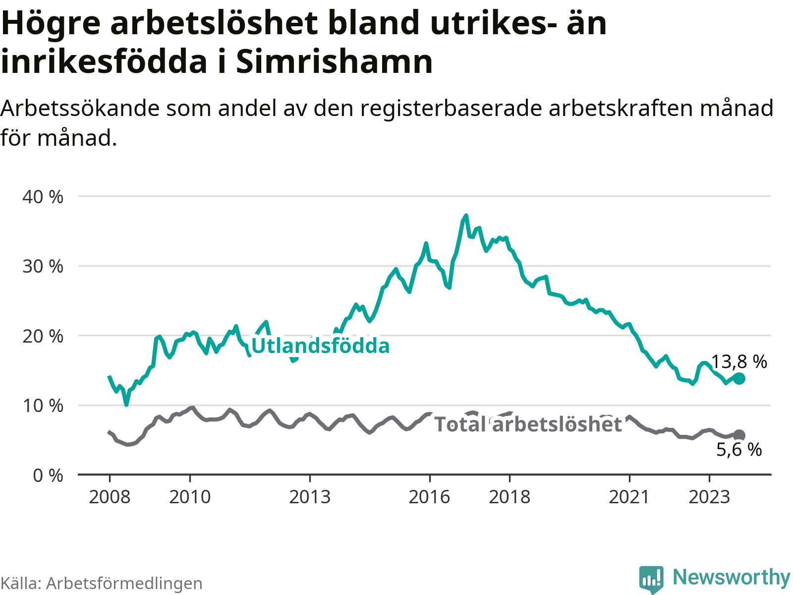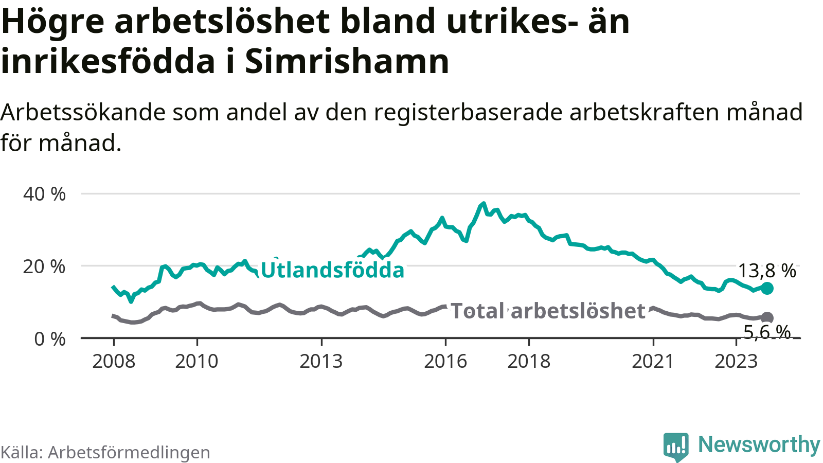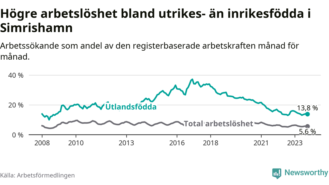 Skillnaden i arbetslöshet mellan utrikesfödda och hela befolkningen är 8,2 procentenheter i Simrishamn. Det är en betydligt mindre skillnad än för ett år sedan (−1,5 procentenheter).