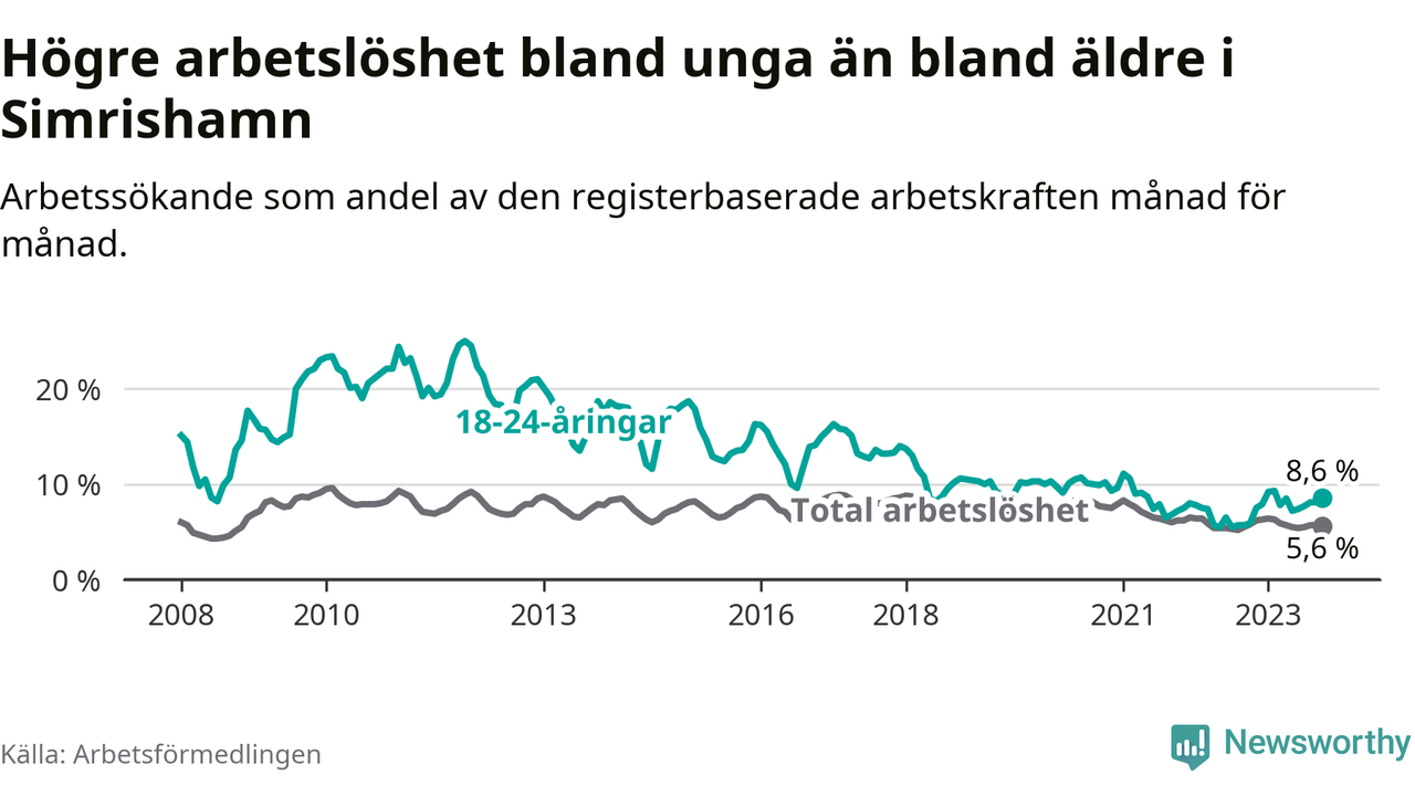 I och med den senaste månadens uppgång har de ungas arbetslöshet i Simrishamn stigit tio månader i följd (upp från 7,9 procent i december 2022 till 8,6 procent nu).