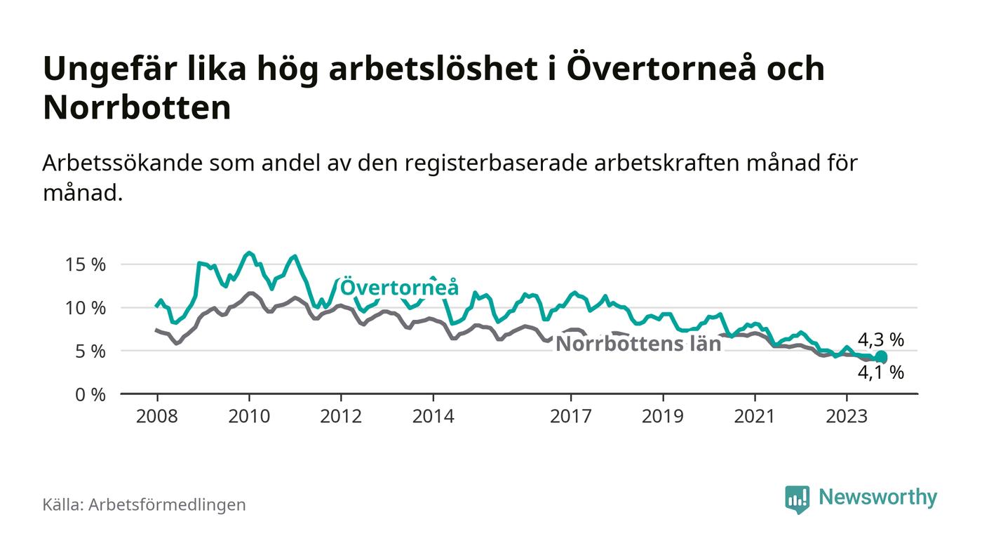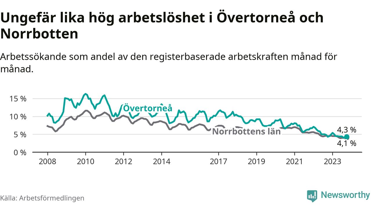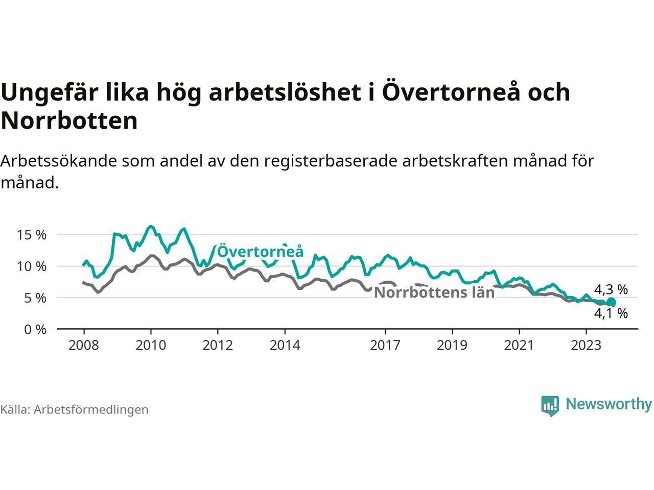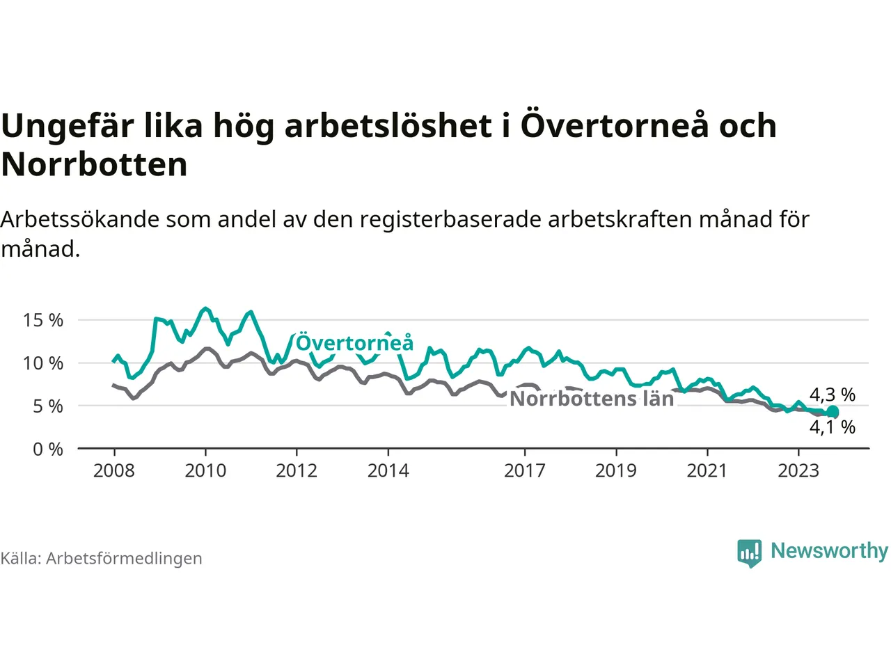 Övertorneå går därmed mot strömmen i förhållande till andra kommuner i Norrbottens län. I de flesta andra kommuner i länet går arbetslösheten nedåt. Störst är minskningen i Haparanda, där arbetslösheten sjunker med 1,3 procentenheter. I tabellen längre ner ser du utvecklingen i samtliga kommuner i länet.