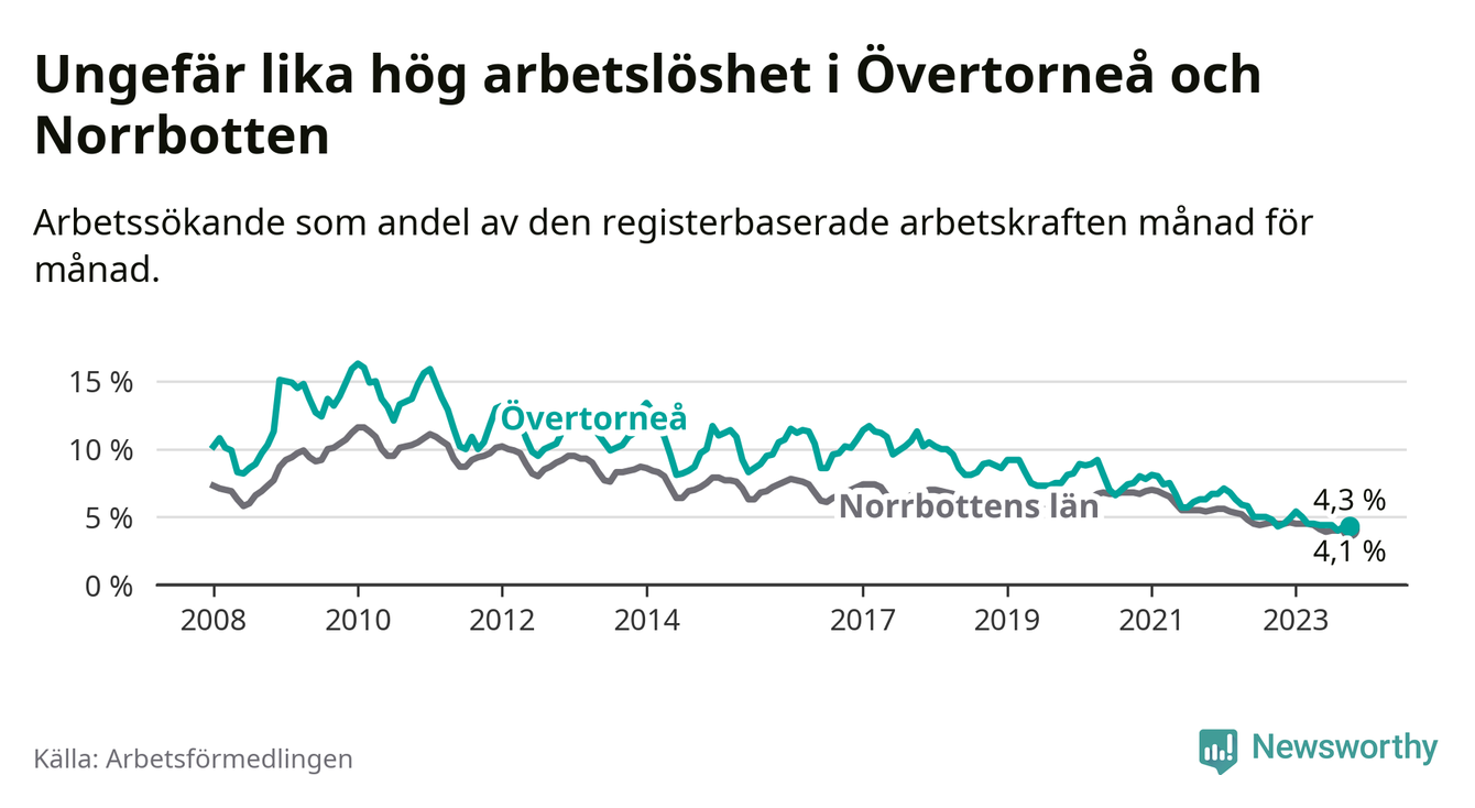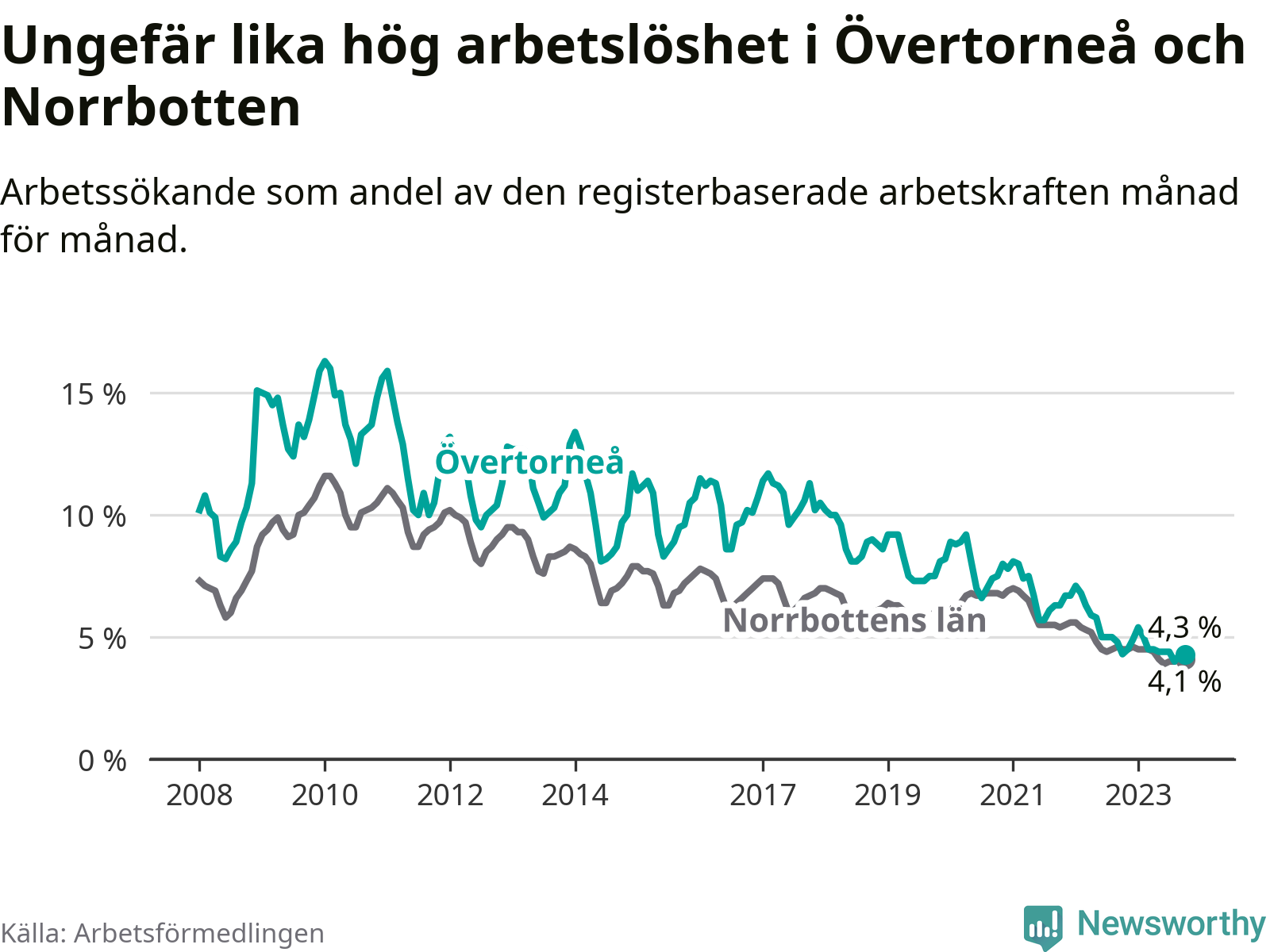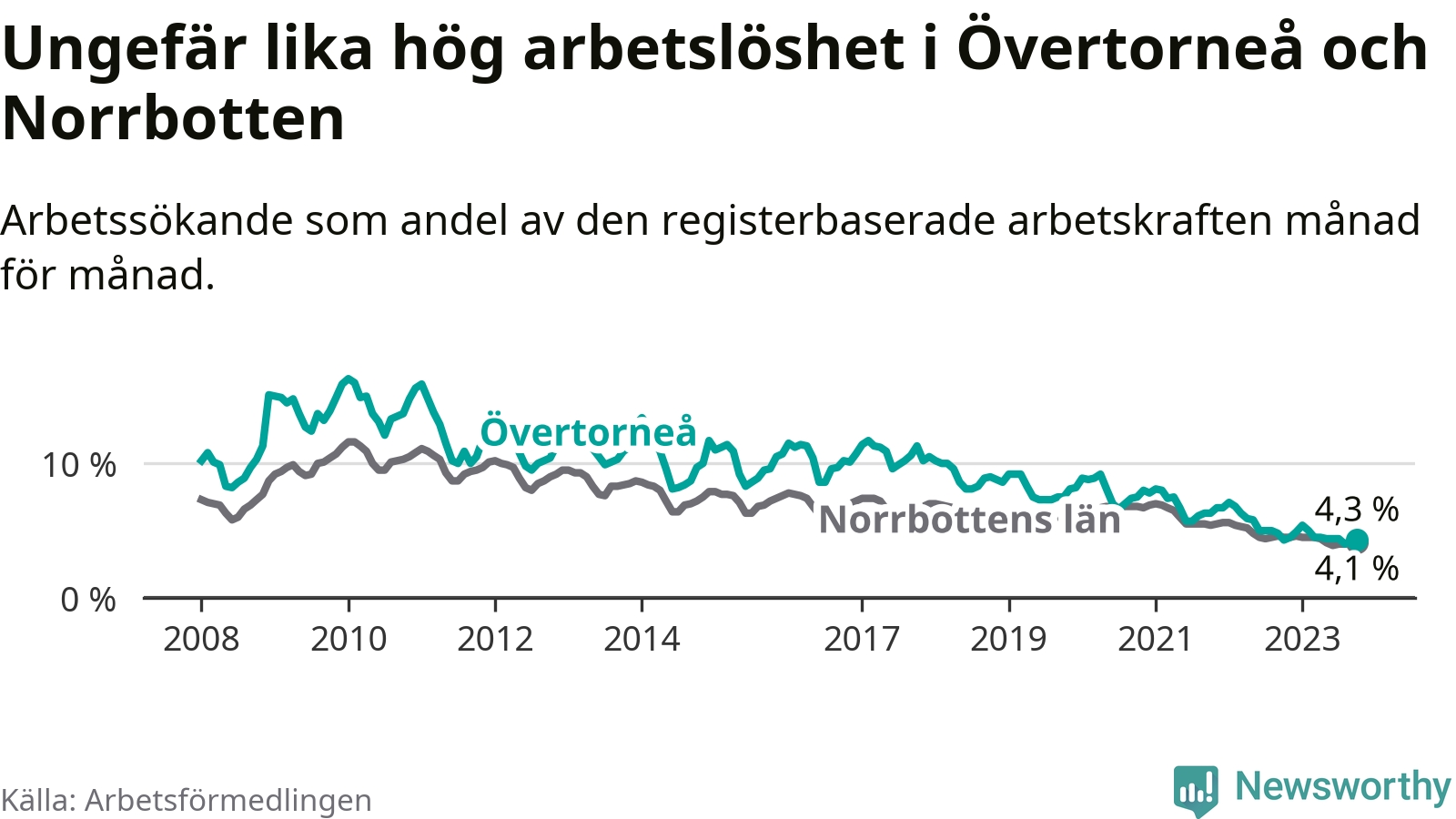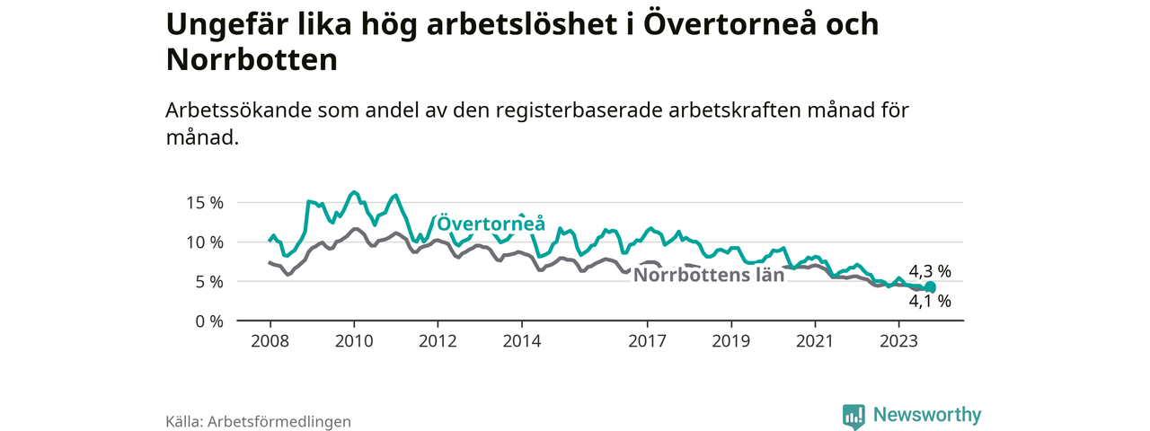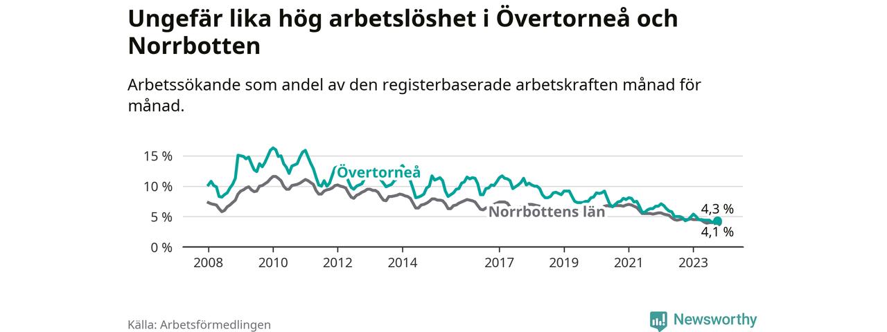 Övertorneå går därmed mot strömmen i förhållande till andra kommuner i Norrbottens län. I de flesta andra kommuner i länet går arbetslösheten nedåt. Störst är minskningen i Haparanda, där arbetslösheten sjunker med 1,3 procentenheter. I tabellen längre ner ser du utvecklingen i samtliga kommuner i länet.