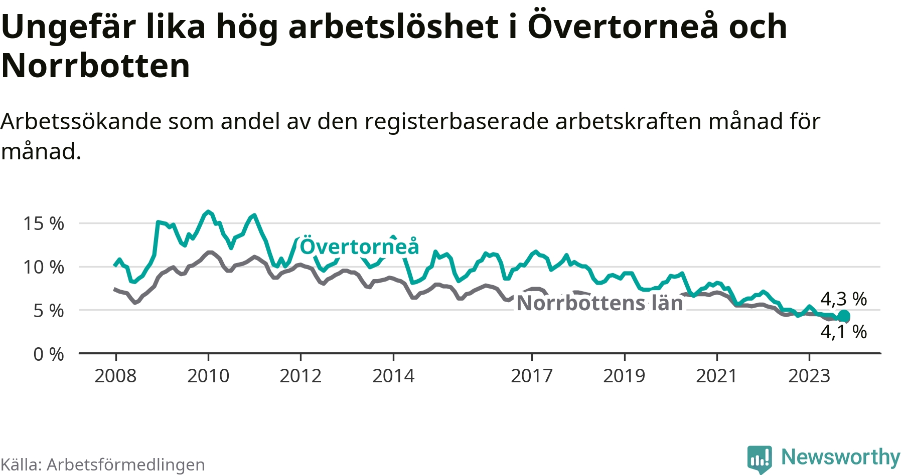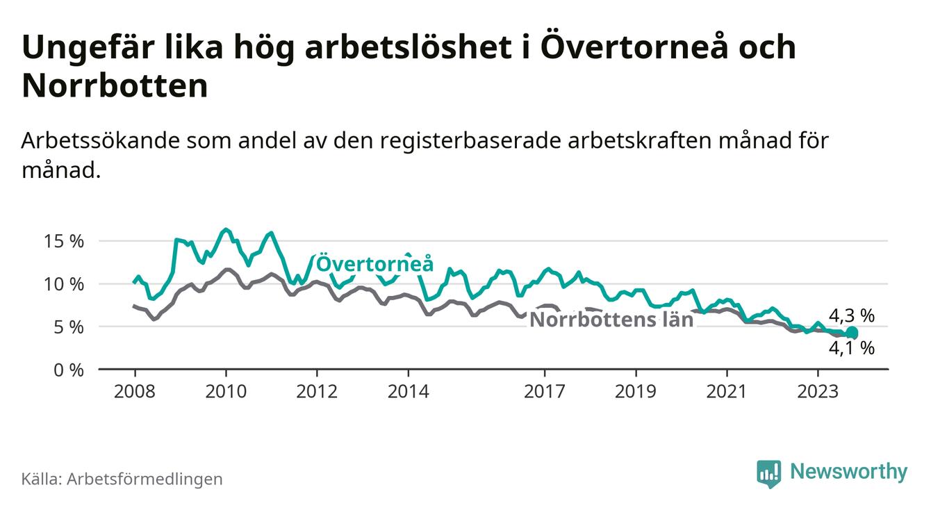 Under oktober månad rapporterade Övertorneå kommun en total arbetslöshet på 4,3 procent. Det är i samma nivå som i oktober i fjol. I Norrbottens län däremot sjunker arbetslösheten