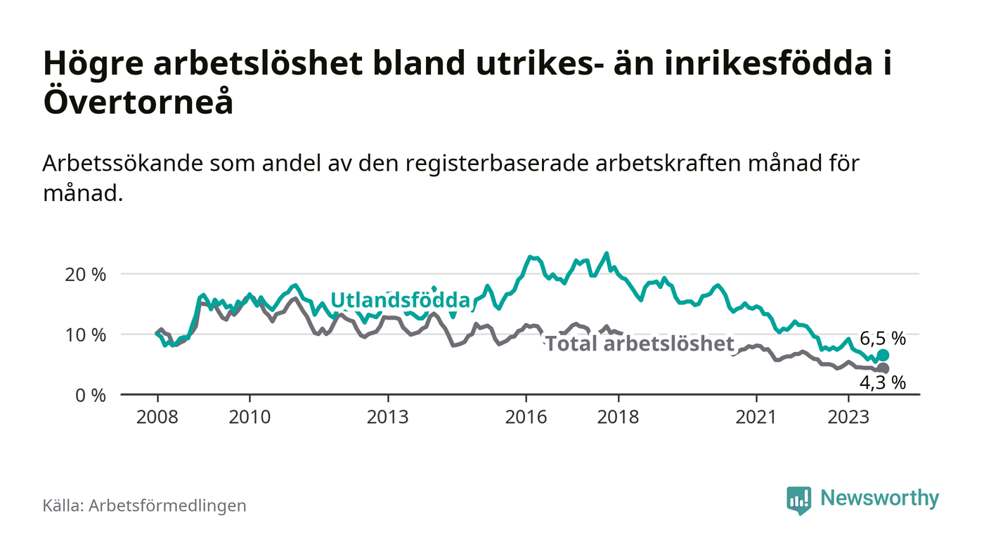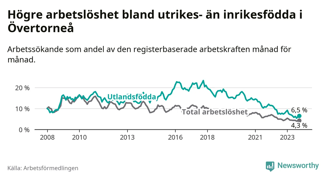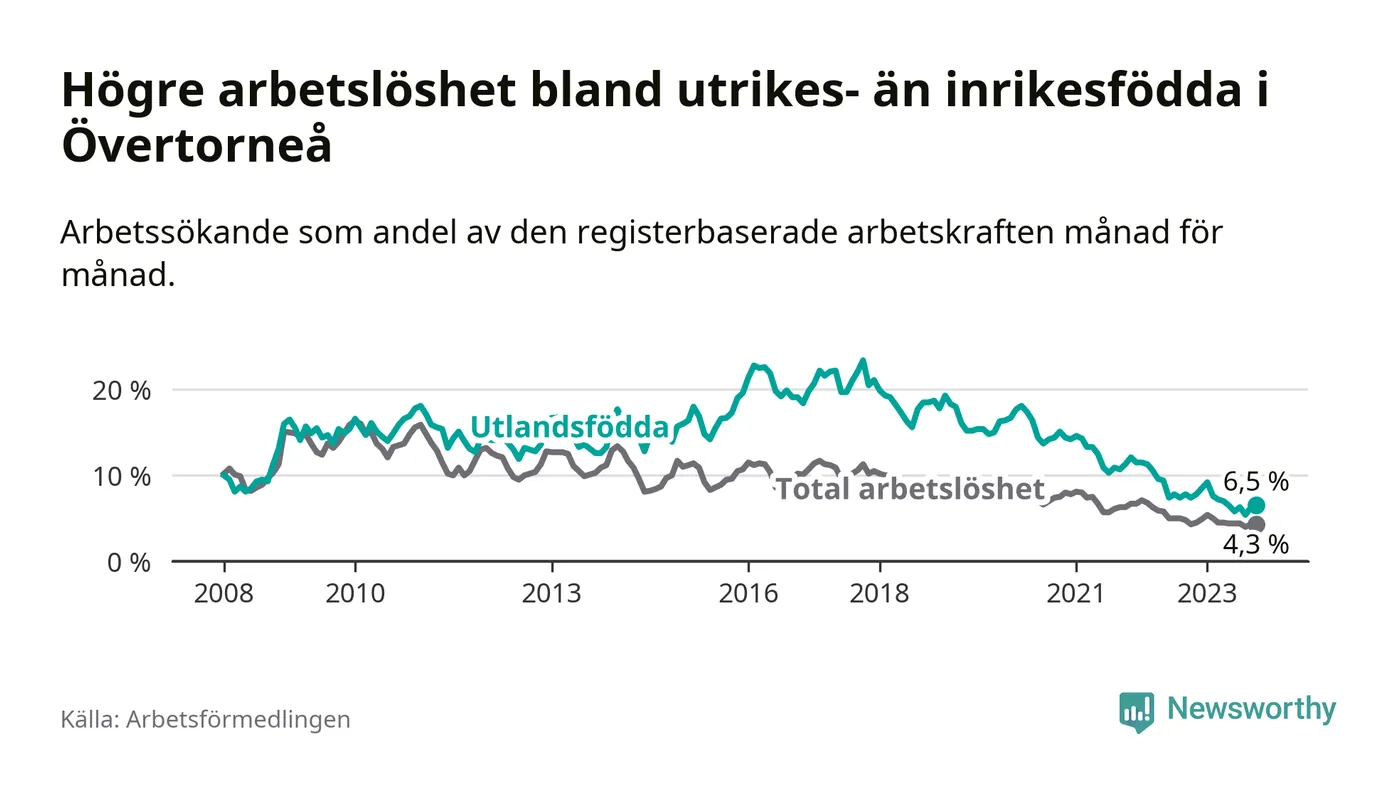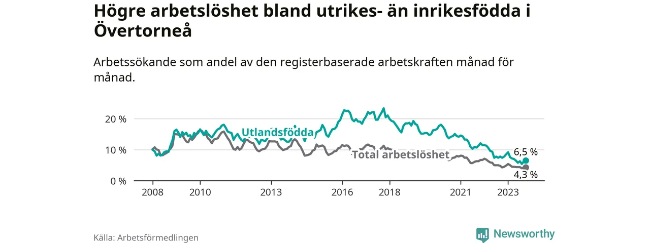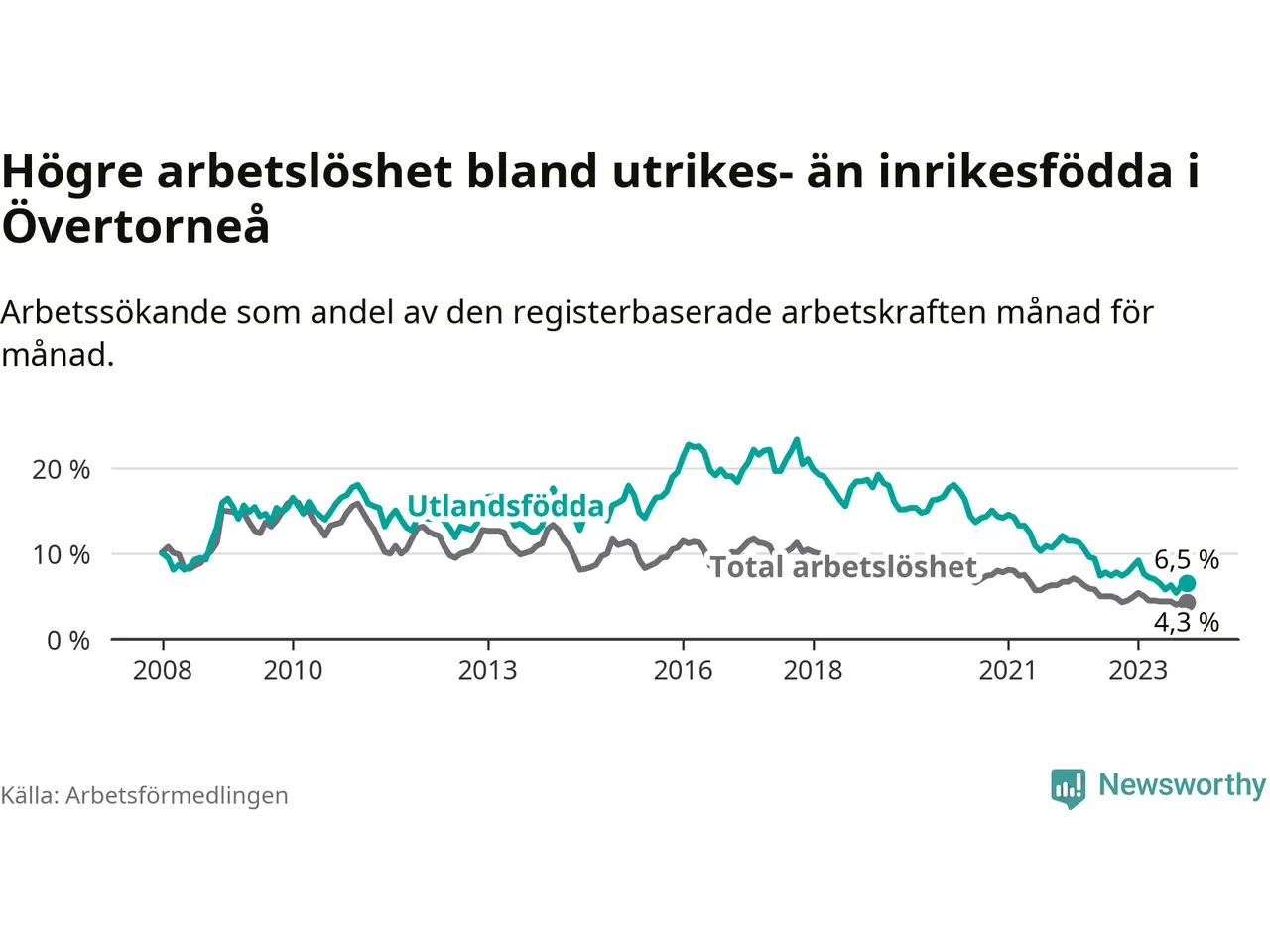 Den senaste månadsstatistiken från Arbetsförmedlingen visar på en nedgång i arbetslöshet bland utlandsfödda i Övertorneå kommun med 0,9 procentenheter. Arbetslösheten bland invånare födda i ett annat land låg i oktober på 6,5 procent.