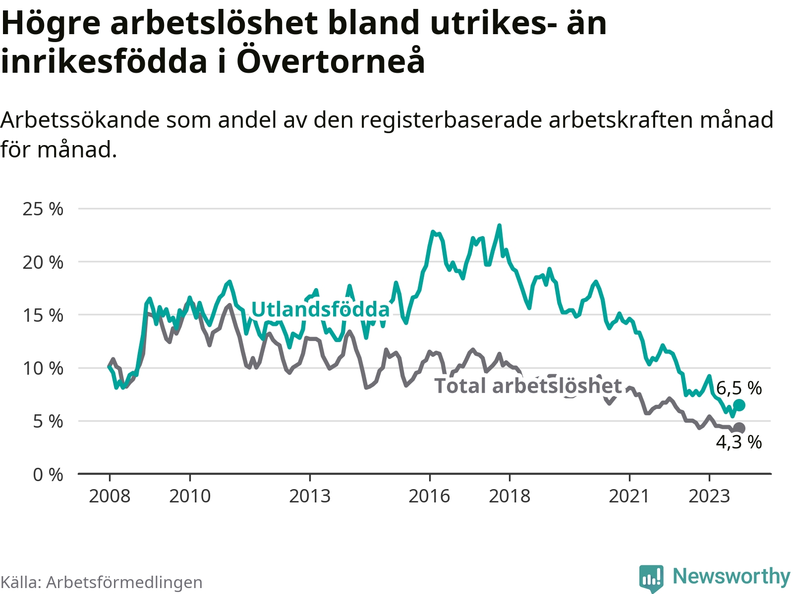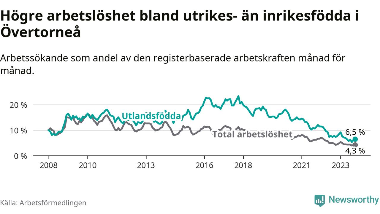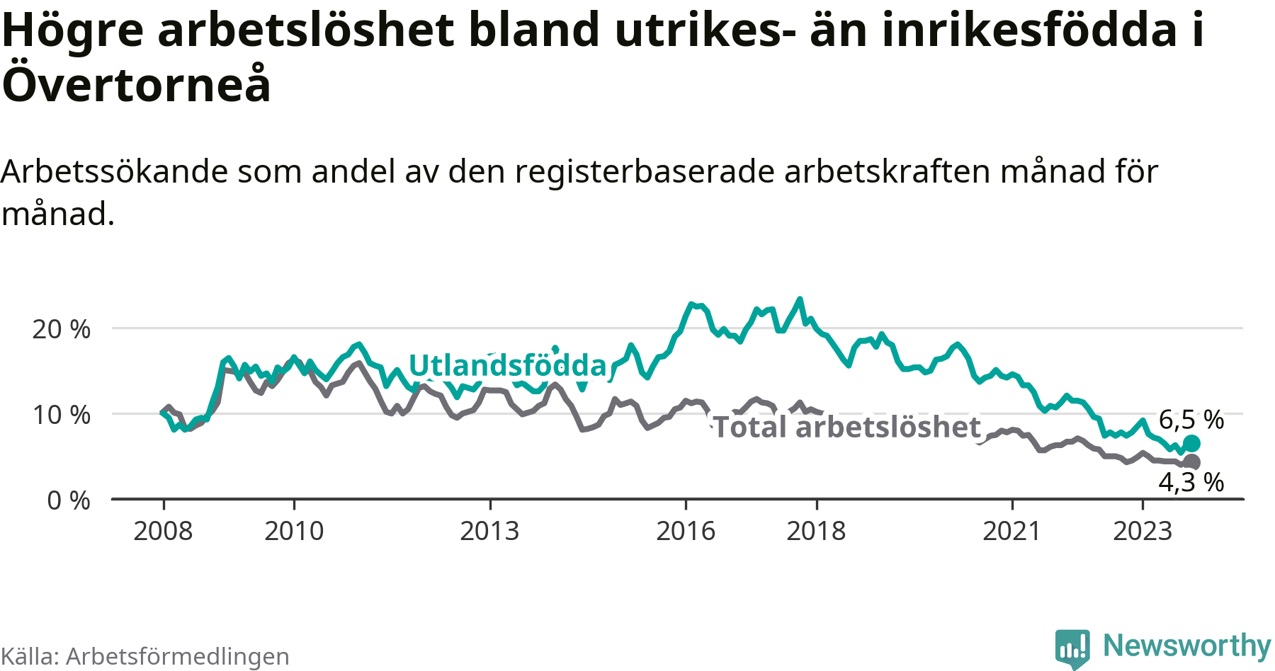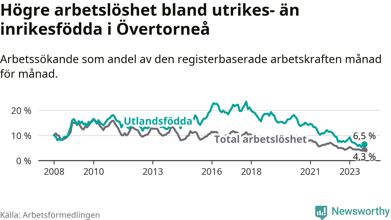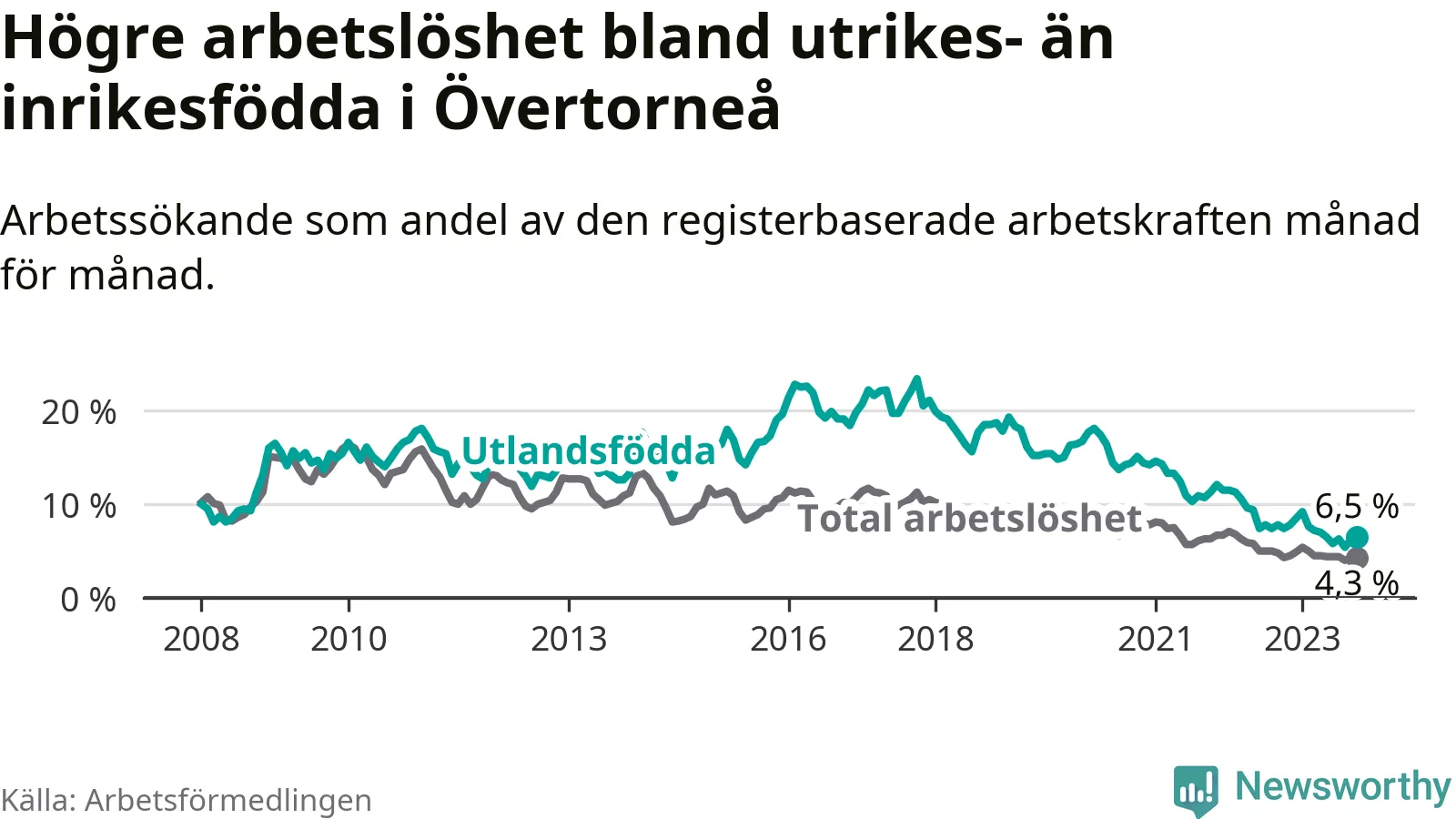 Den senaste månadsstatistiken från Arbetsförmedlingen visar på en nedgång i arbetslöshet bland utlandsfödda i Övertorneå kommun med 0,9 procentenheter. Arbetslösheten bland invånare födda i ett annat land låg i oktober på 6,5 procent.