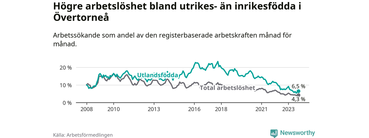 Arbetslösheten bland utlandsfödda var 6,5 procent i Övertorneå under oktober månad, motsvarande 27 av 415 personer. Det är 0,9 procentenheter färre än vid samma tidpunkt i fjol (−3 om man räknar personer). Därmed har de utlandsföddas arbetslöshet varit lägre än vid samma tidpunkt i fjol i över tre år i sträck. Sedan oktober 2020 har arbetslösheten bland utlandsfödda minskat från 15,1 till 6,5 procent.