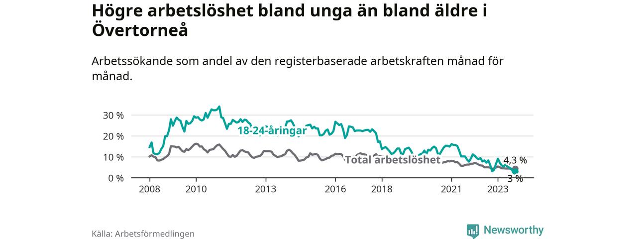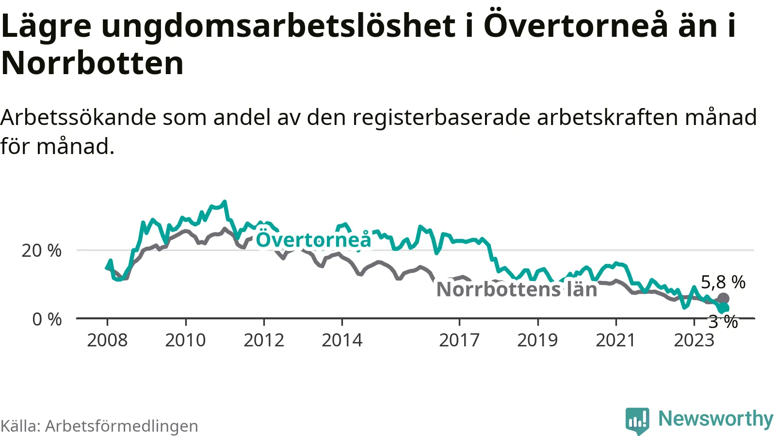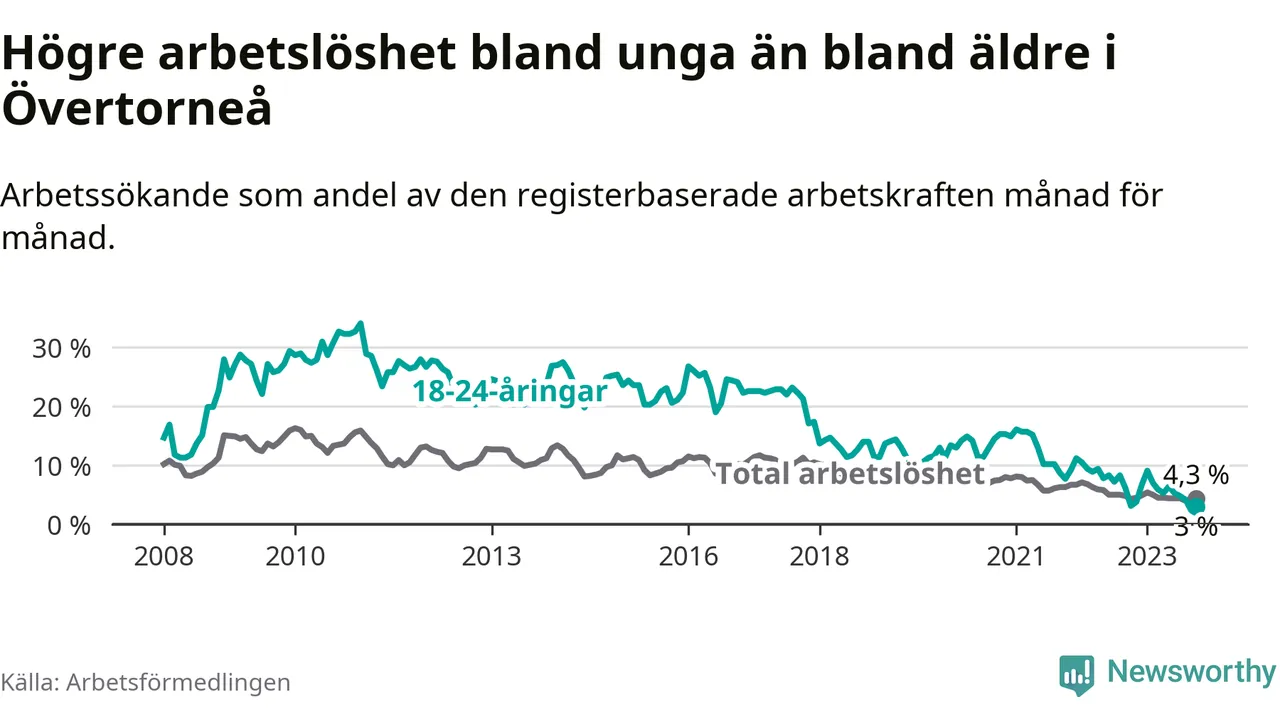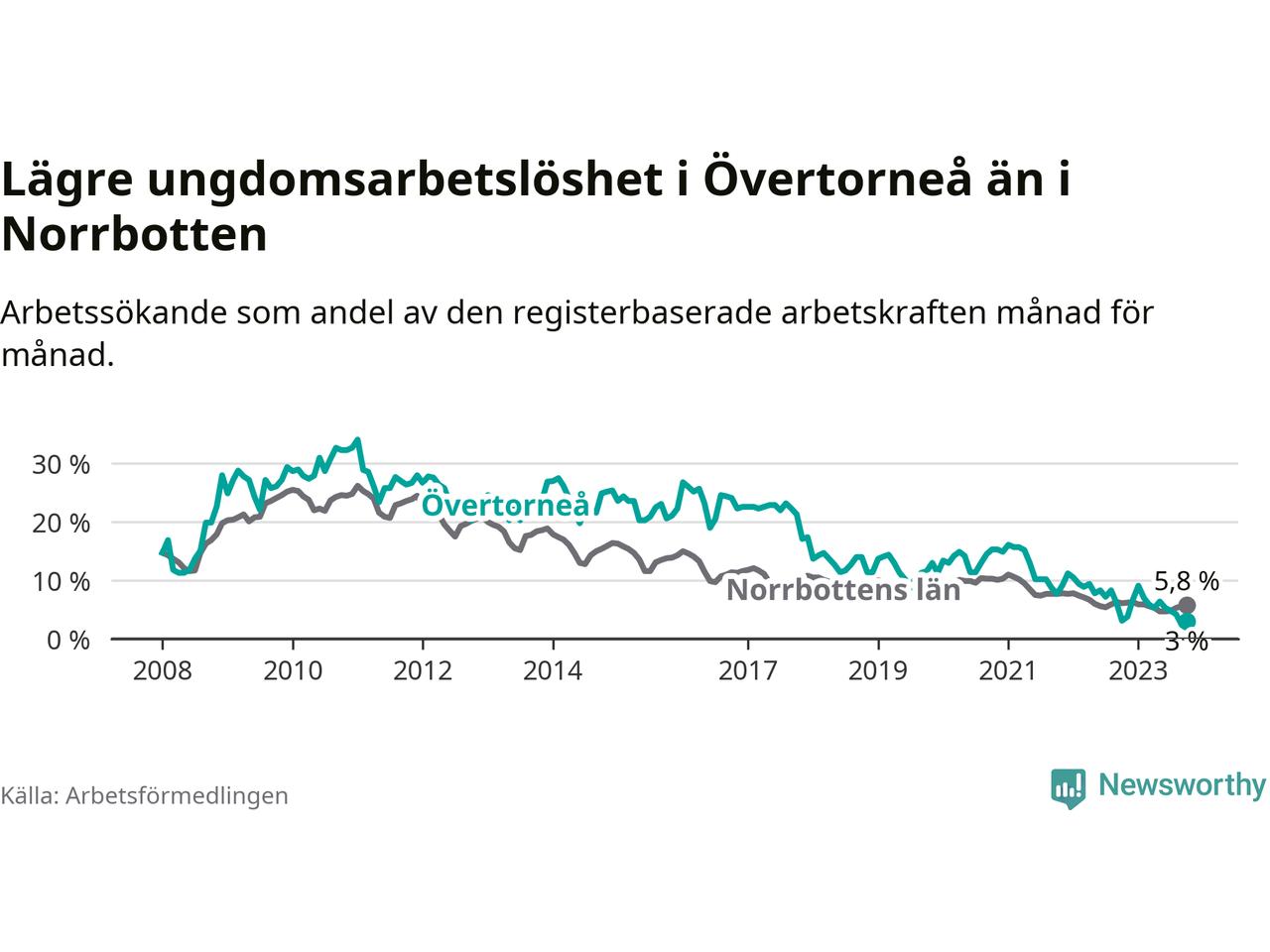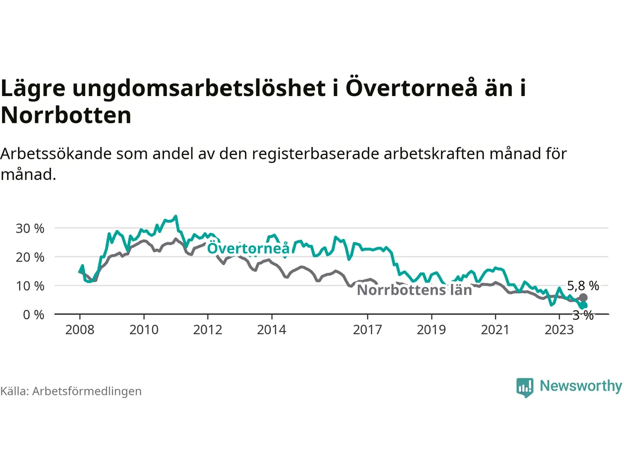 Medan Övertorneå har ungefär samma total arbetslöshet som Norrbotten, ligger ungdomsarbetslösheten 2,8 procentenheter lägre i Övertorneå.