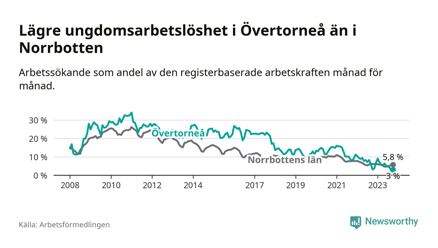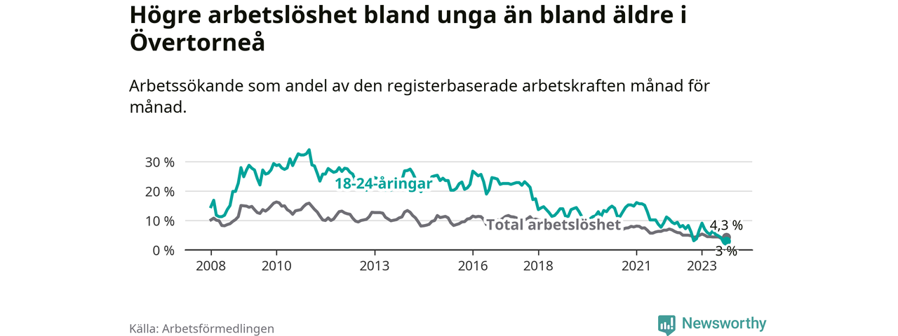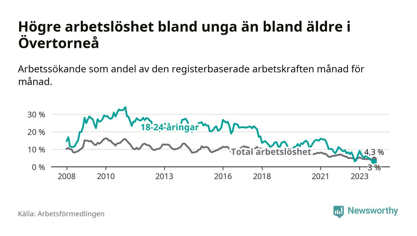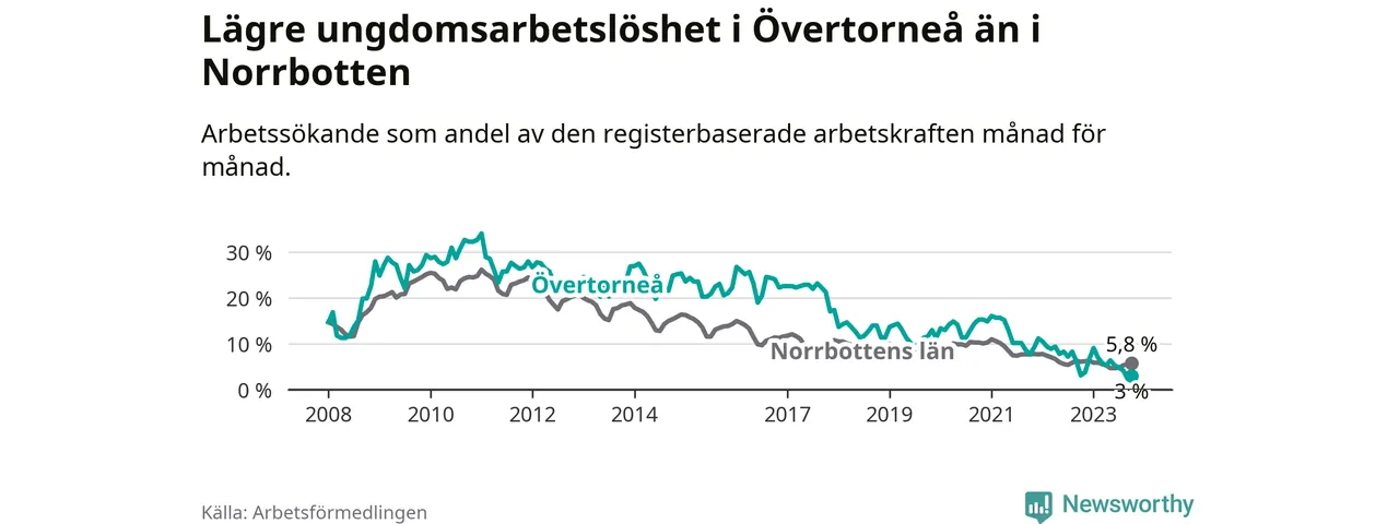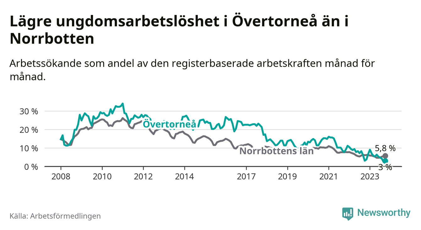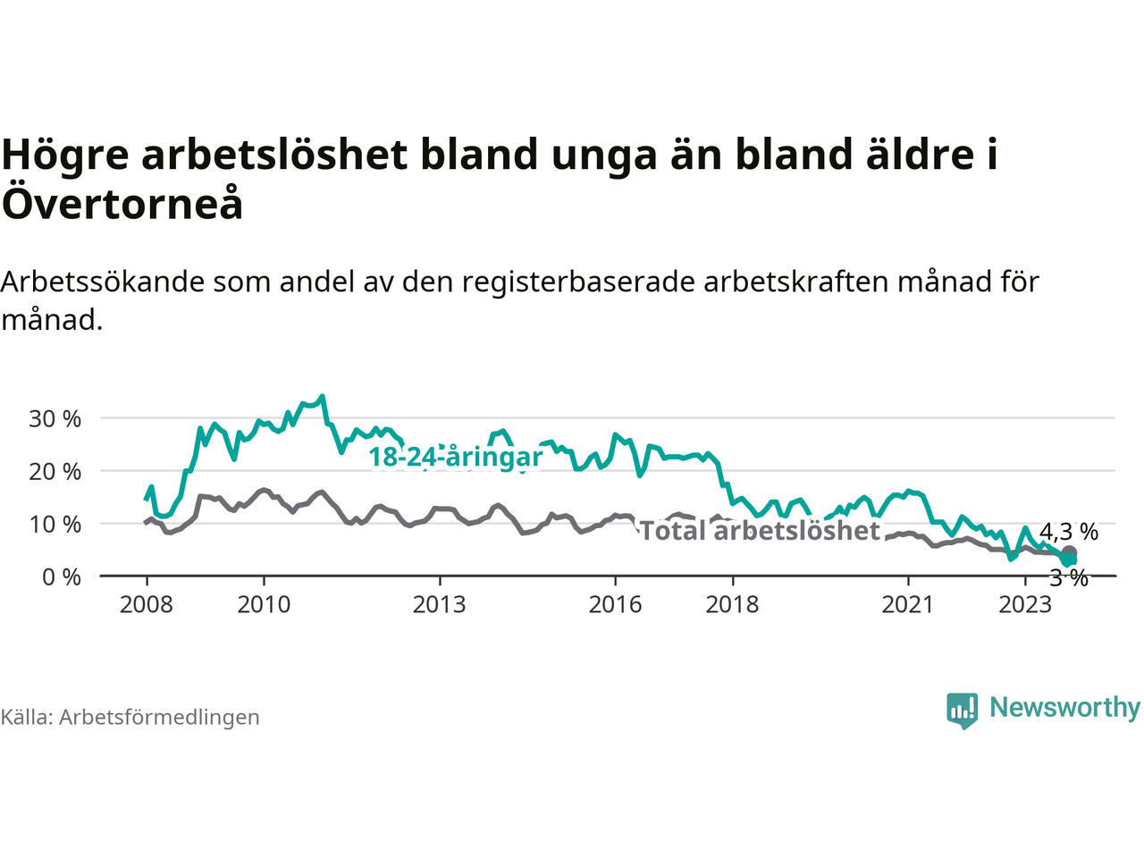 Medan Övertorneå har ungefär samma total arbetslöshet som Norrbotten, ligger ungdomsarbetslösheten 2,8 procentenheter lägre i Övertorneå.