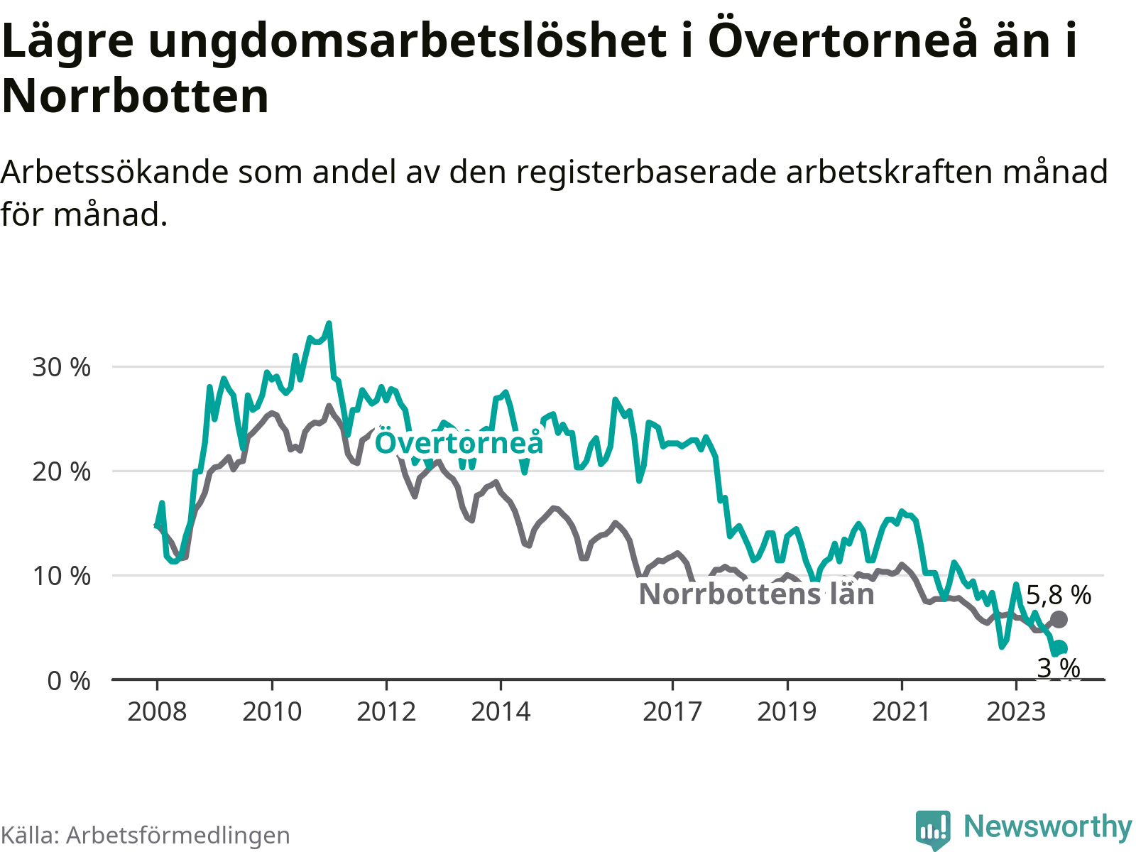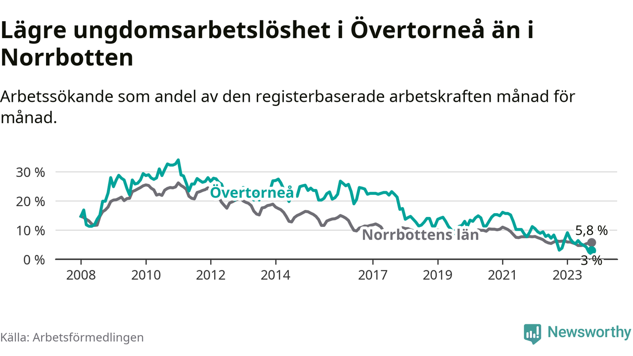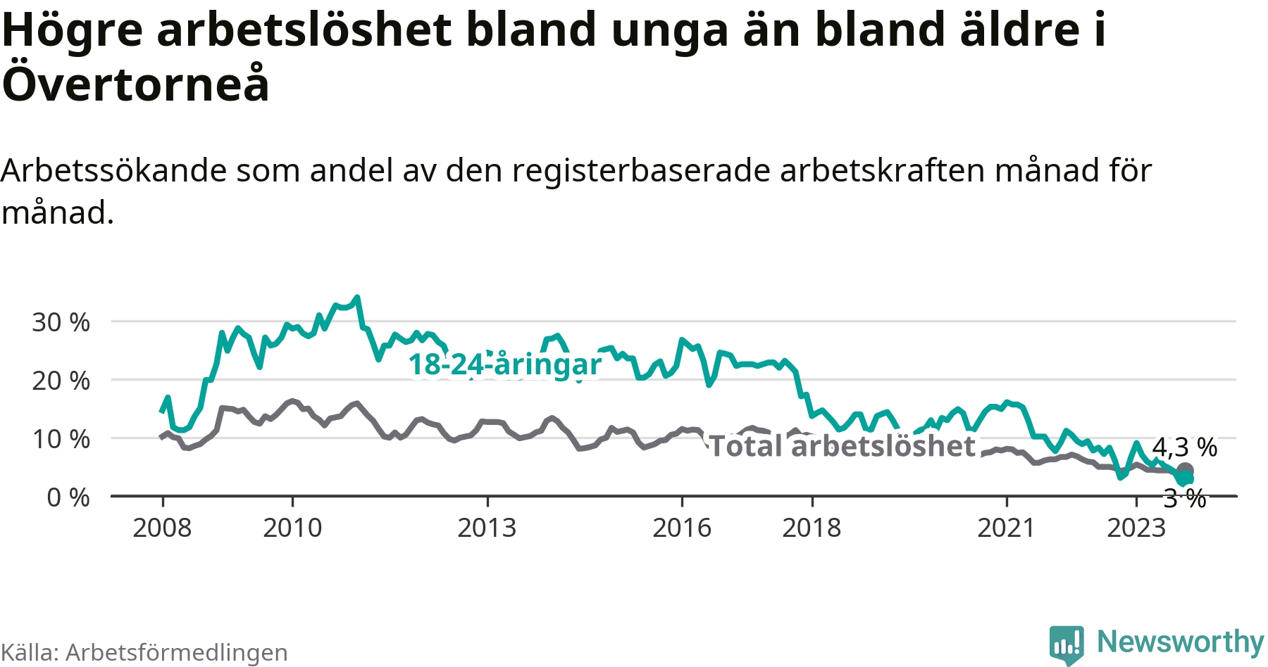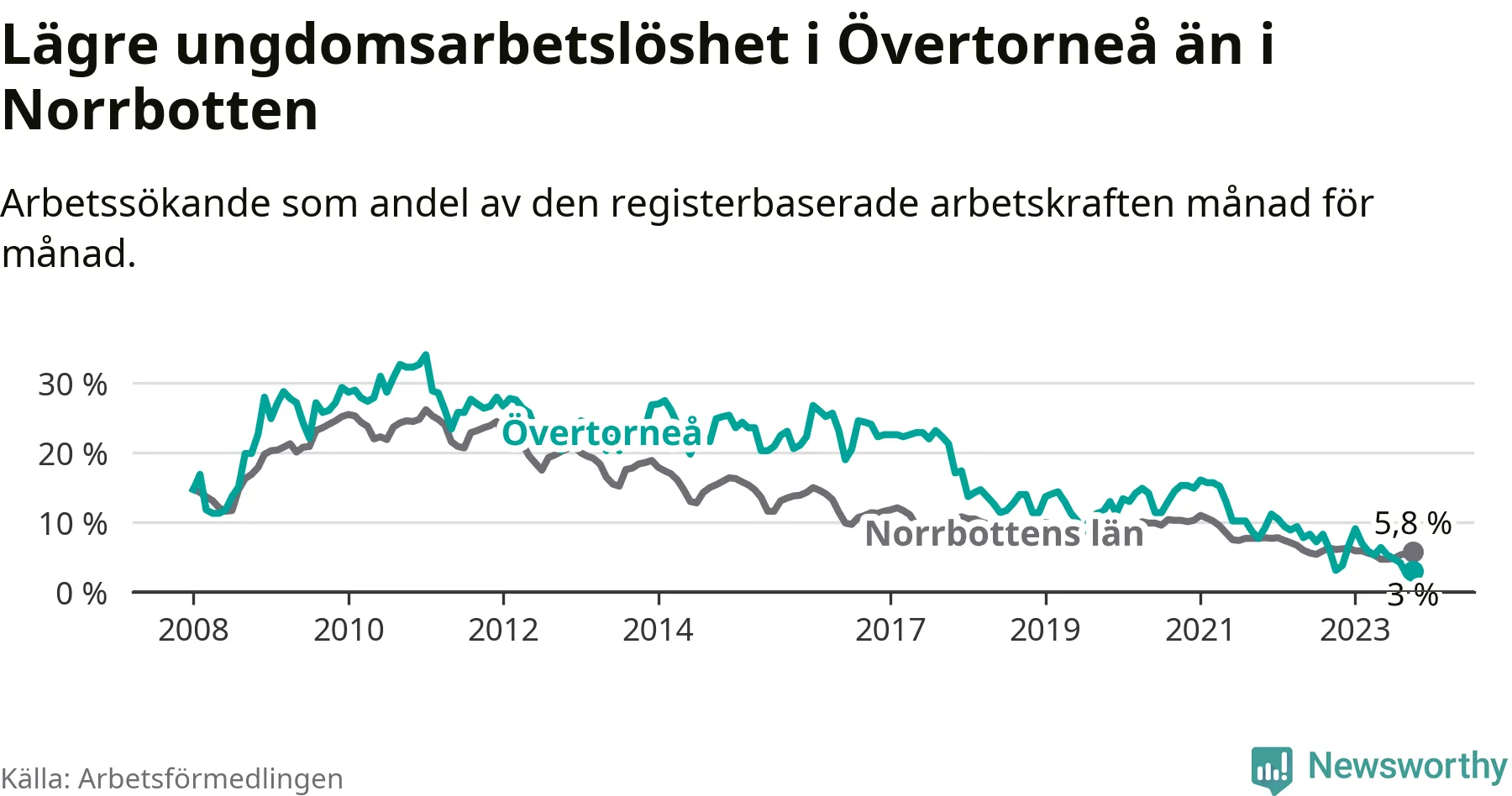 Medan Övertorneå har ungefär samma total arbetslöshet som Norrbotten, ligger ungdomsarbetslösheten 2,8 procentenheter lägre i Övertorneå.