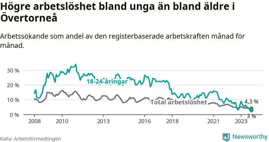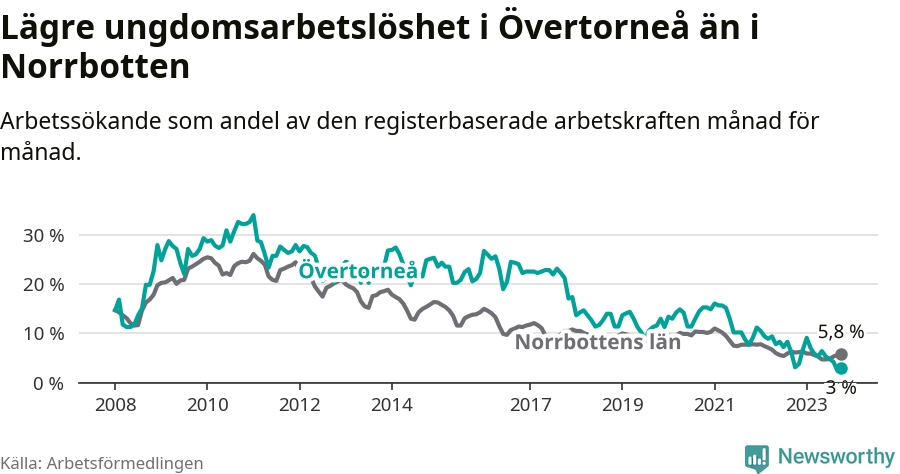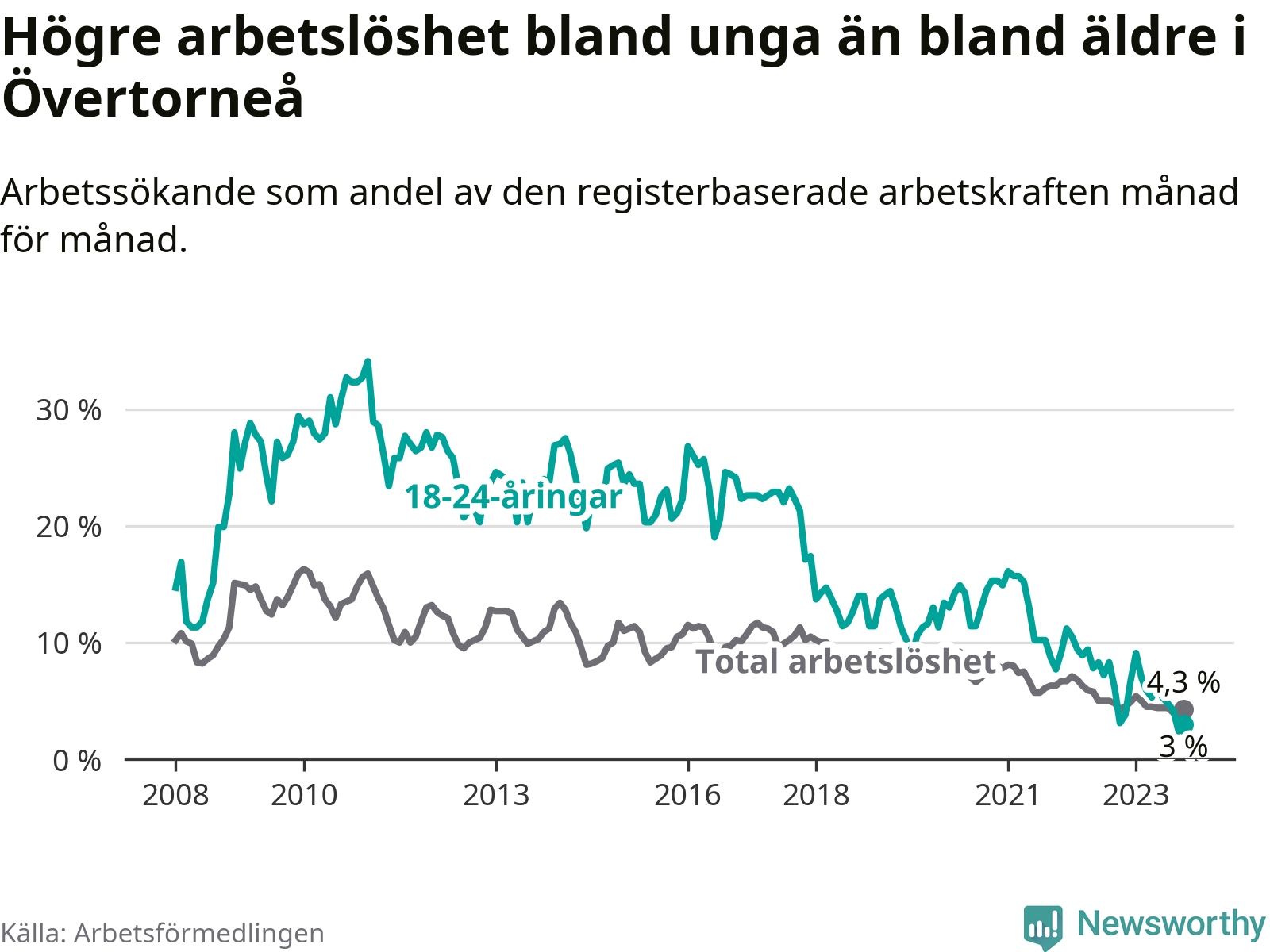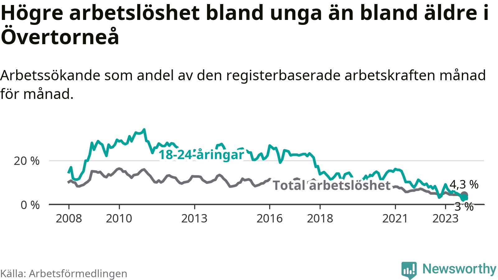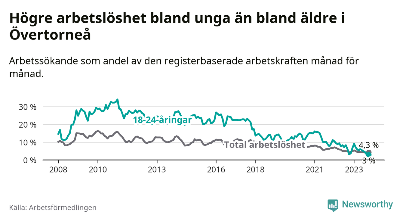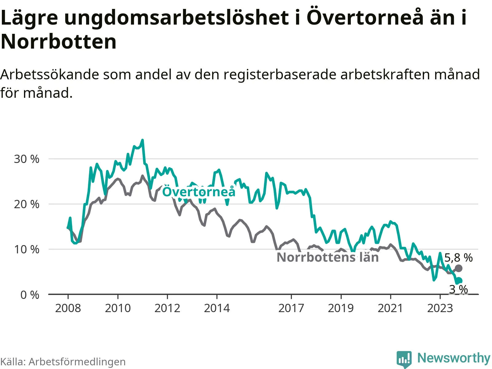 Medan Övertorneå har ungefär samma total arbetslöshet som Norrbotten, ligger ungdomsarbetslösheten 2,8 procentenheter lägre i Övertorneå.