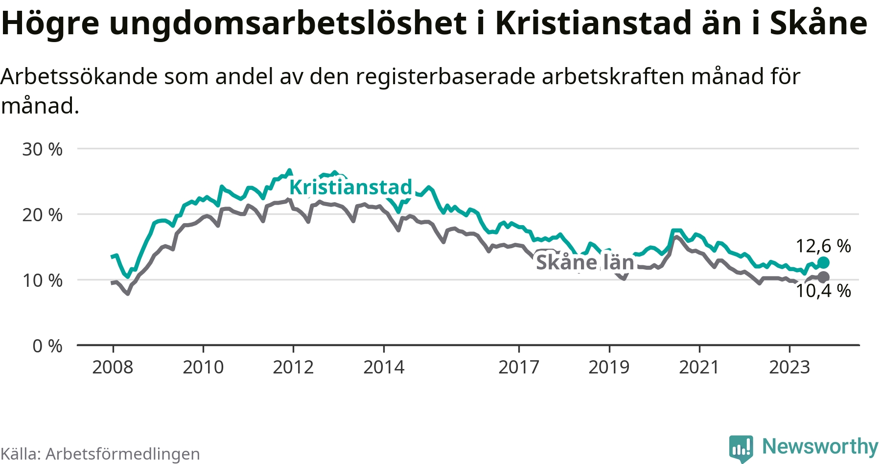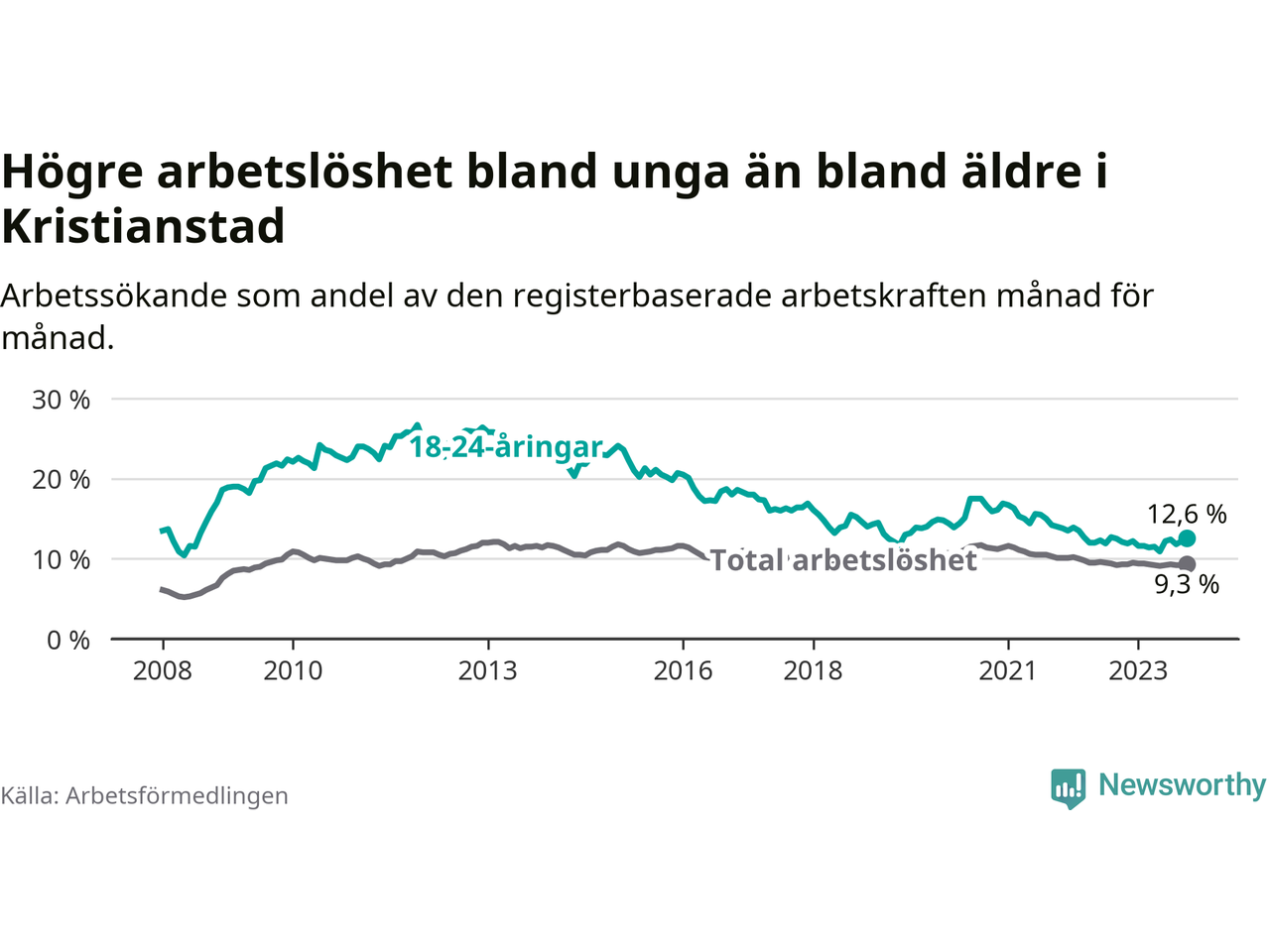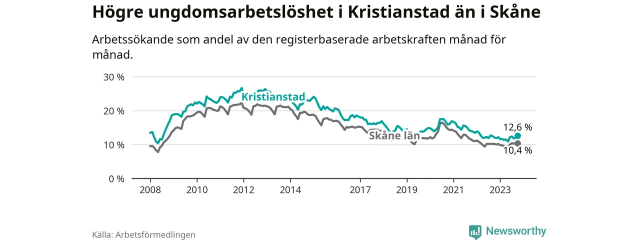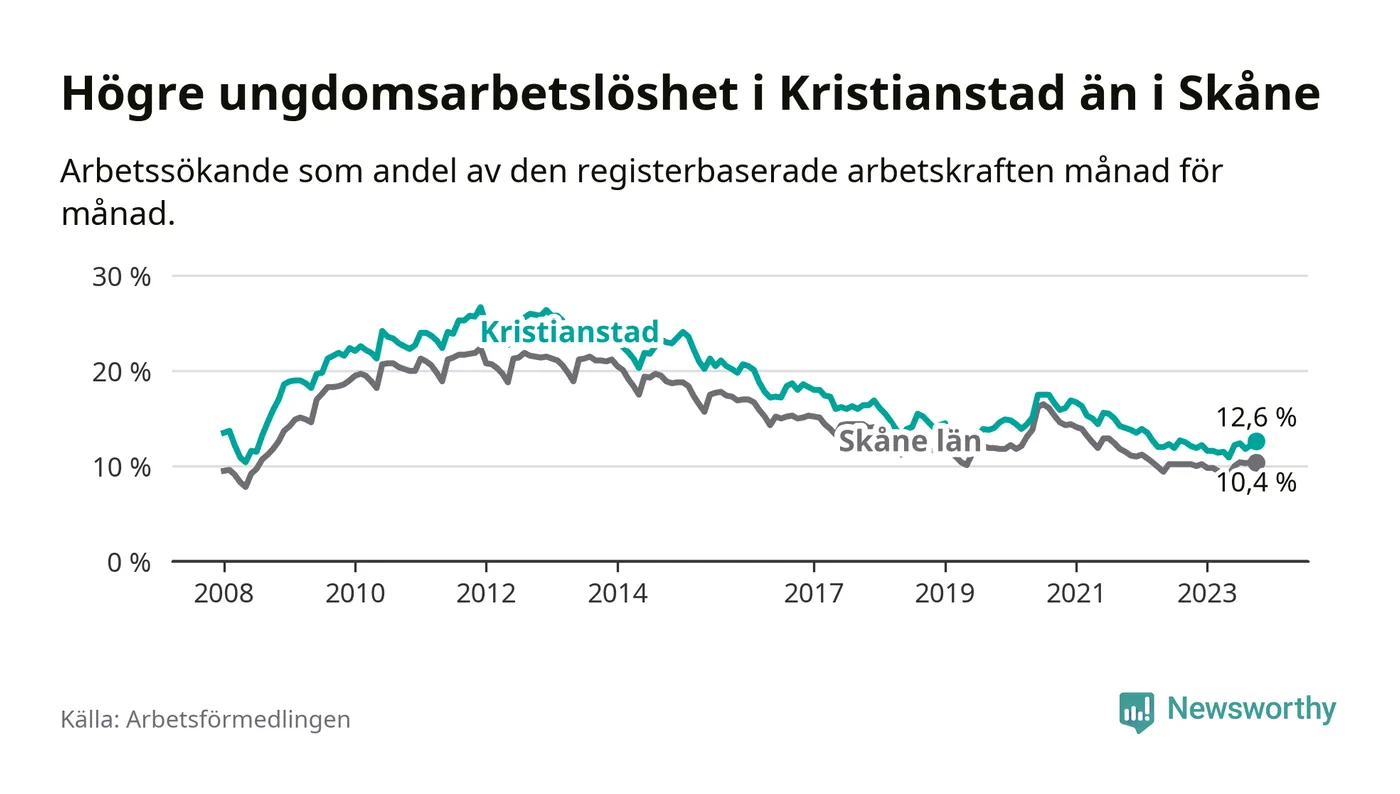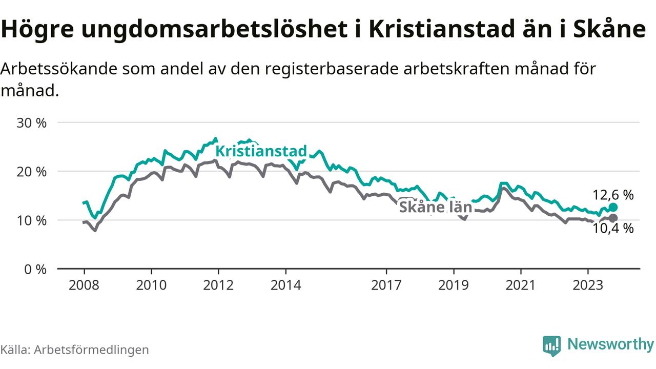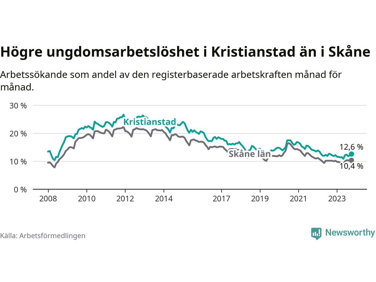 Precis som den totala arbetslösheten ligger ungdomsarbetslösheten i Kristianstad högre än i Skåne som helhet. Skillnaden mellan kommunen och länet är 2,2 procentenheter.
