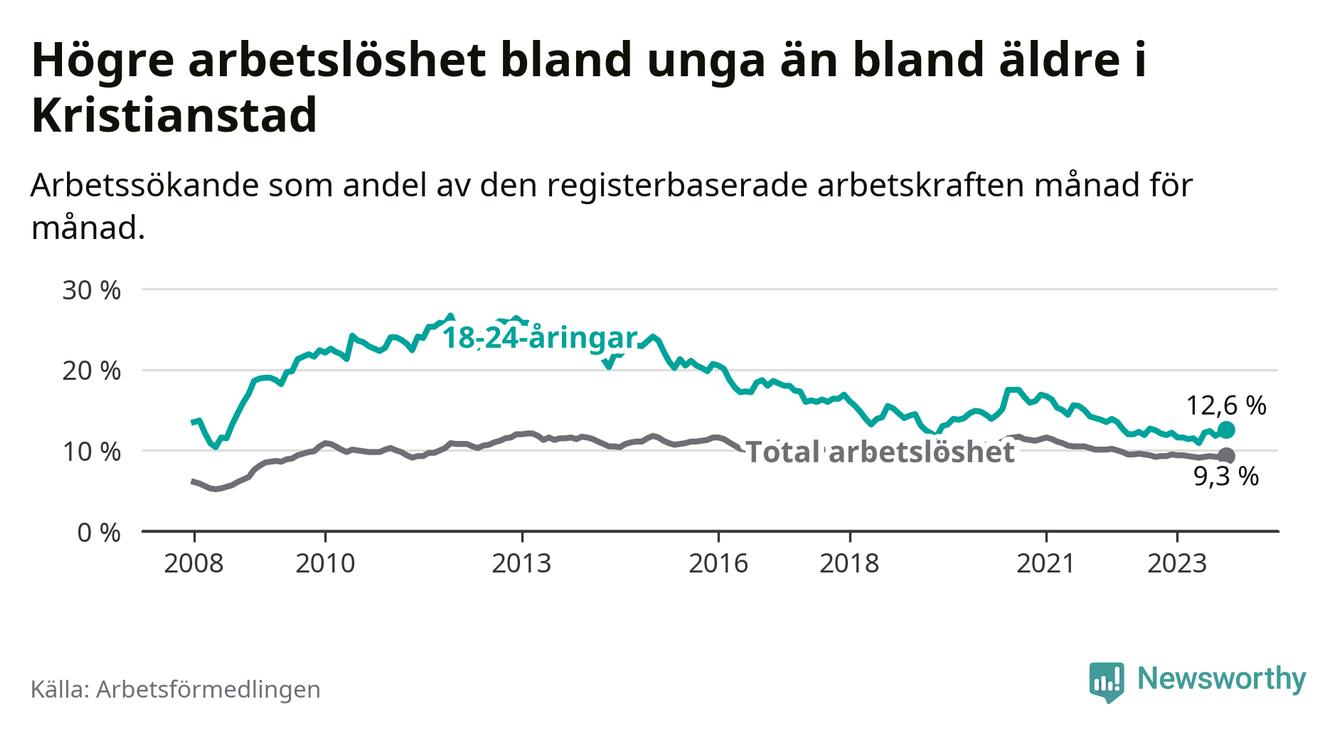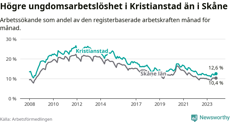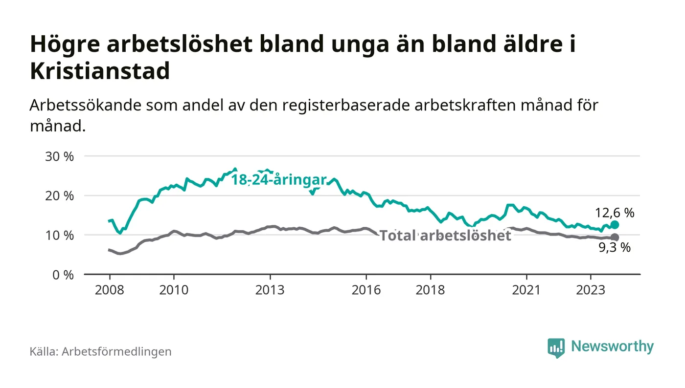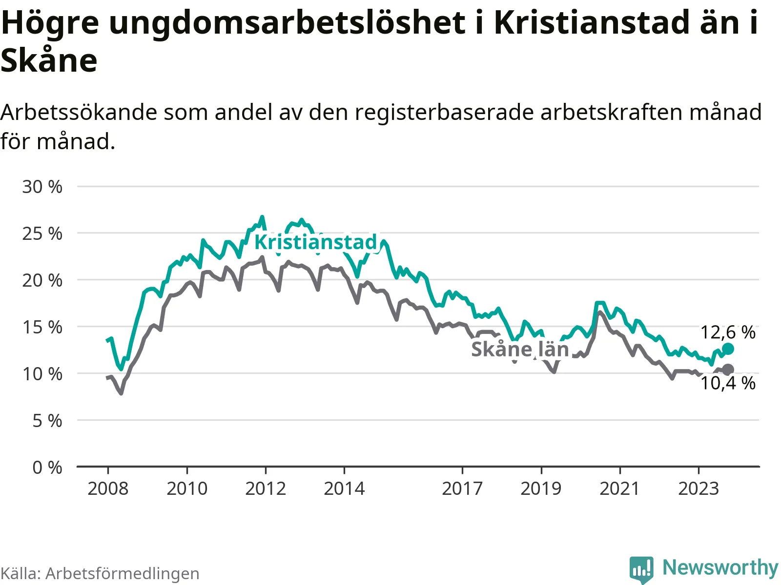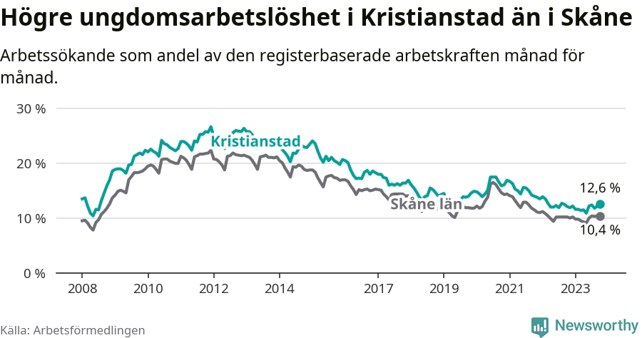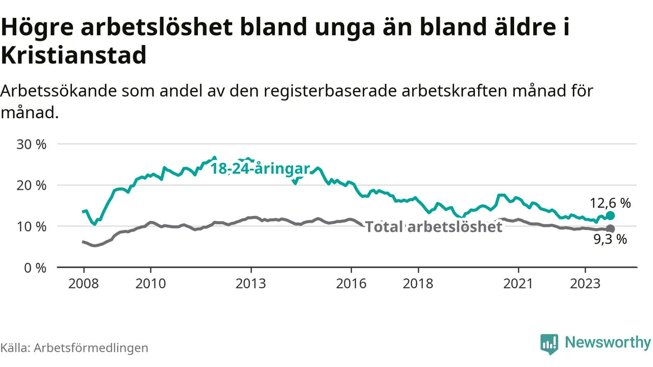 Precis som den totala arbetslösheten ligger ungdomsarbetslösheten i Kristianstad högre än i Skåne som helhet. Skillnaden mellan kommunen och länet är 2,2 procentenheter.