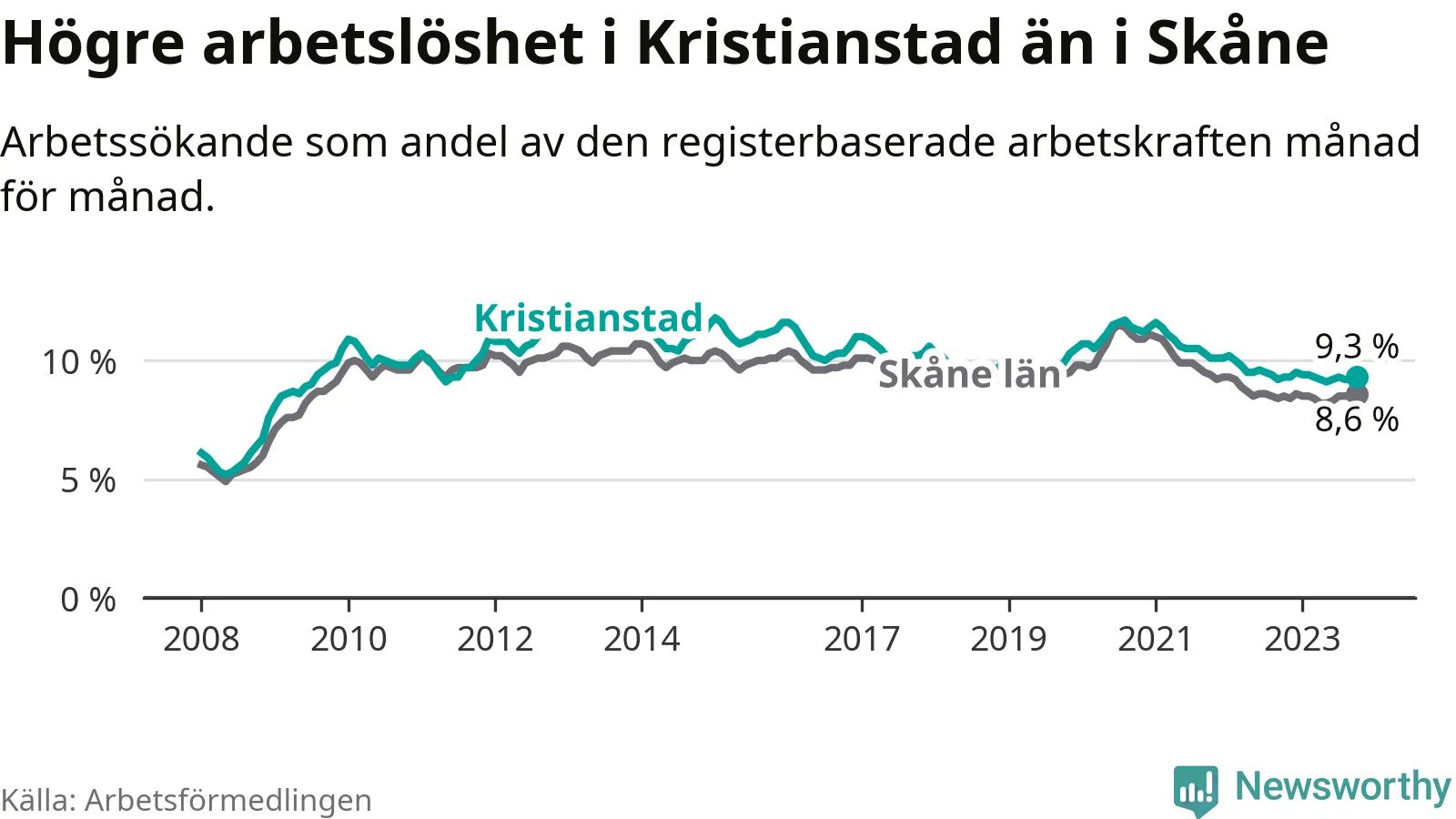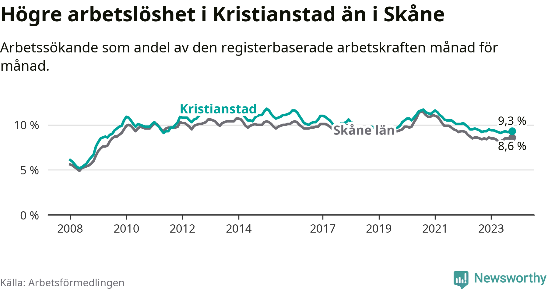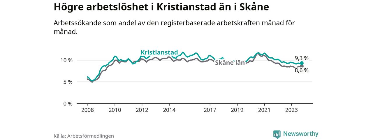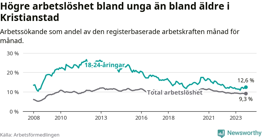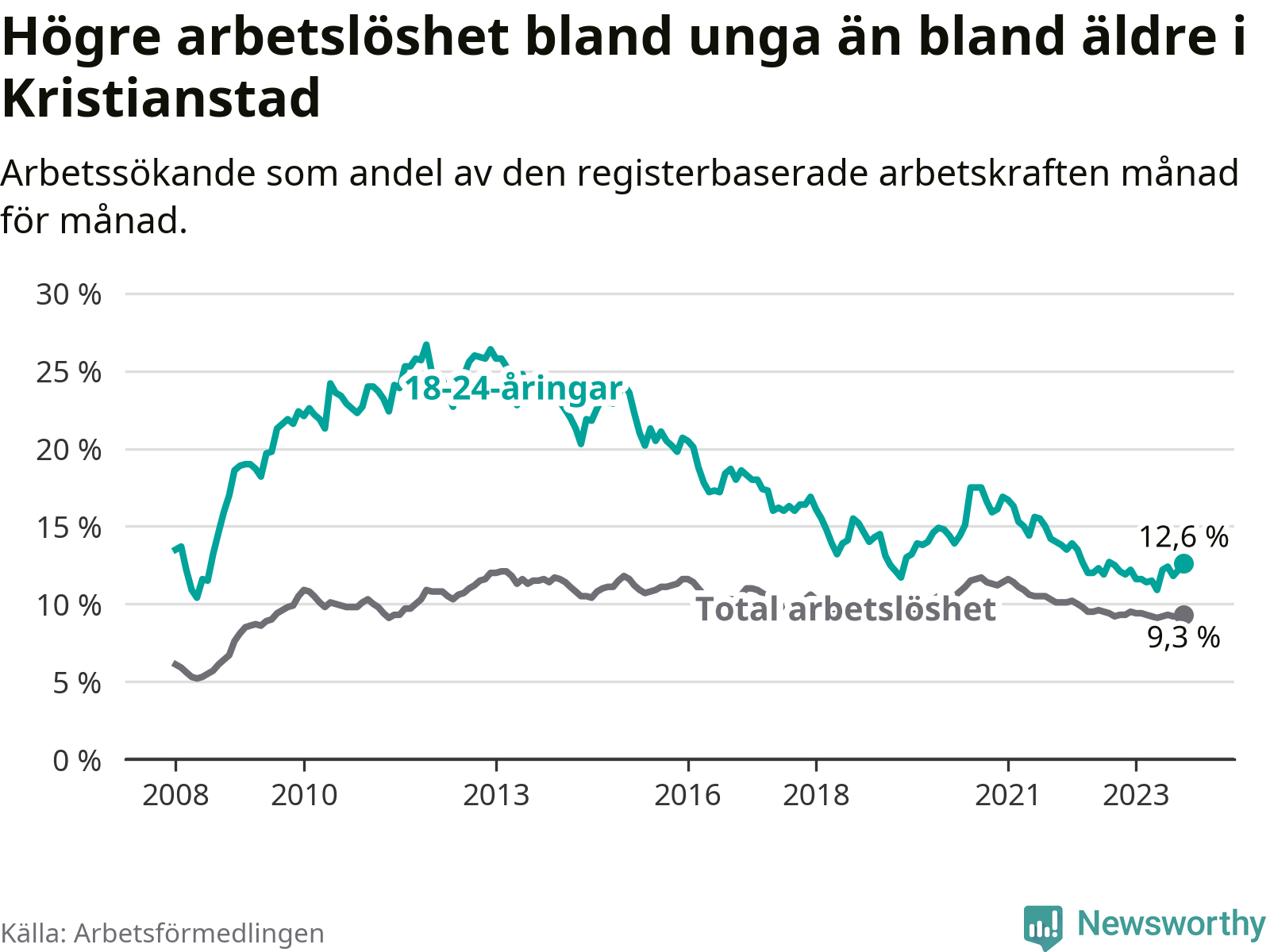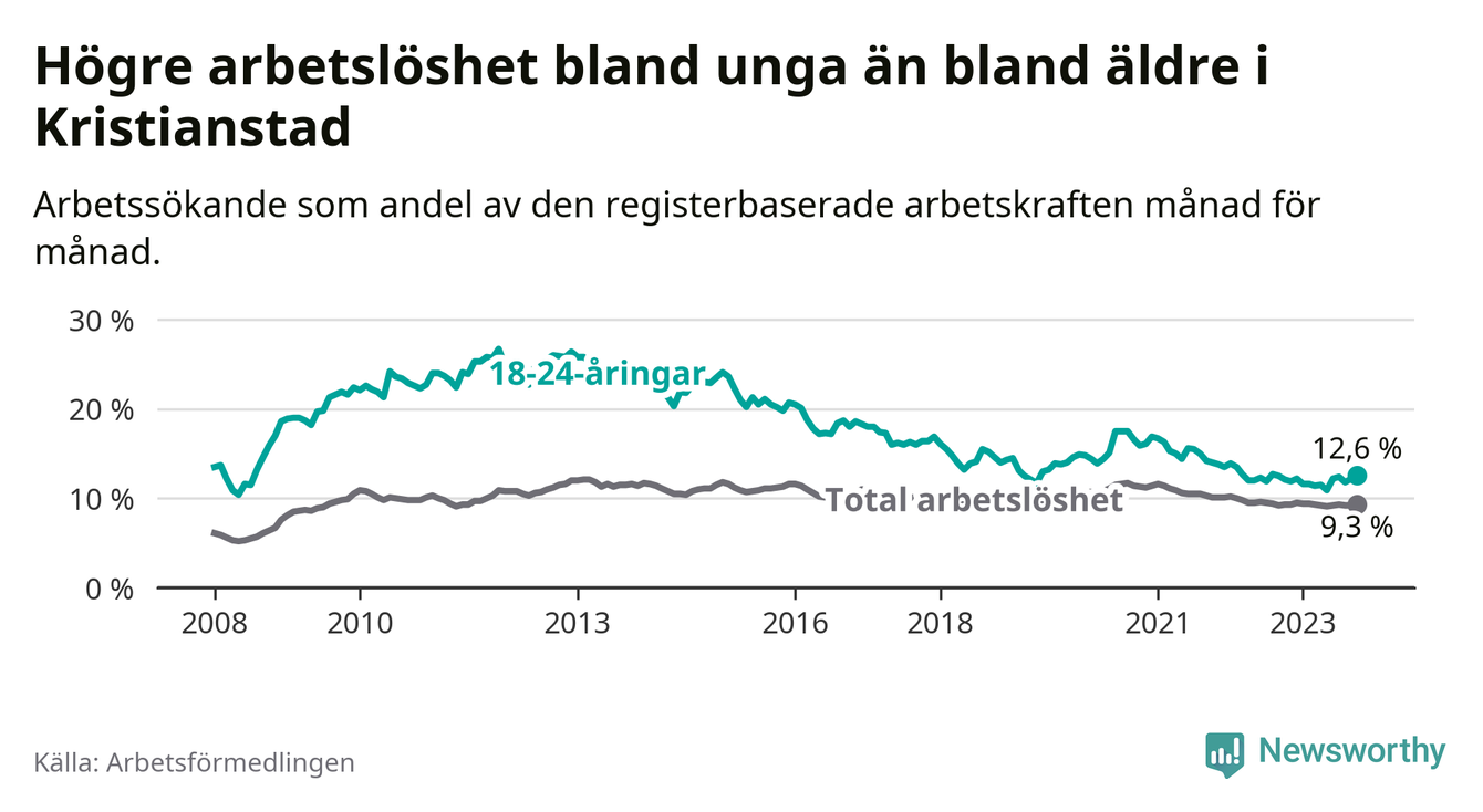 Precis som den totala arbetslösheten ligger ungdomsarbetslösheten i Kristianstad högre än i Skåne som helhet. Skillnaden mellan kommunen och länet är 2,2 procentenheter.