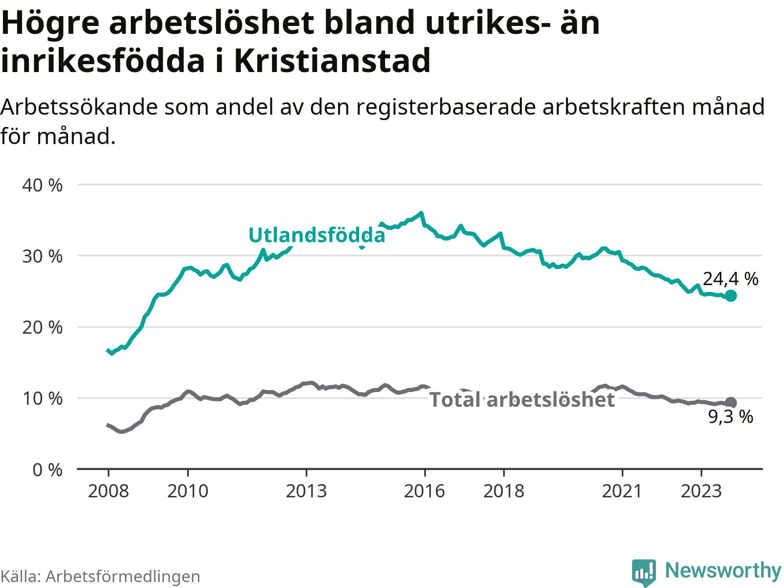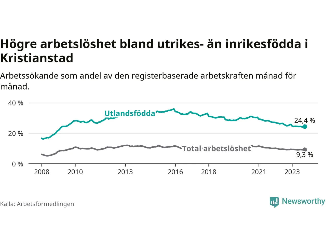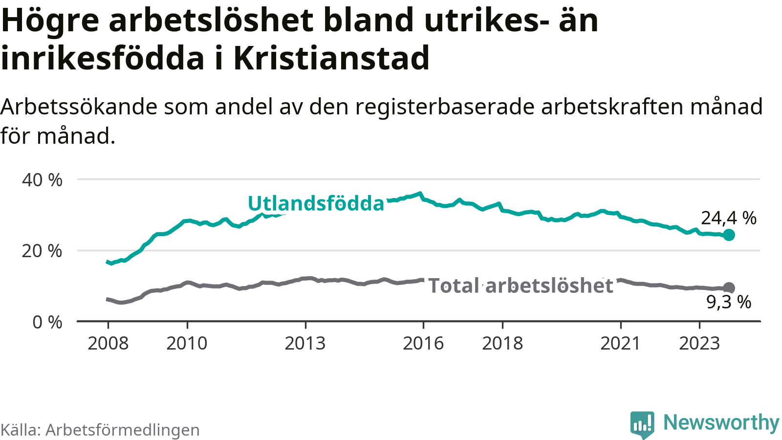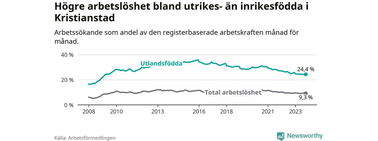 Skillnaden i arbetslöshet mellan utrikesfödda och hela befolkningen är 15,1 procentenheter i Kristianstad. Det är en mindre skillnad än för ett år sedan (−0,6 procentenheter).