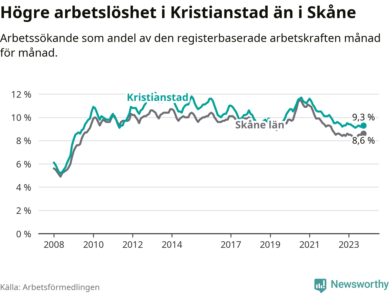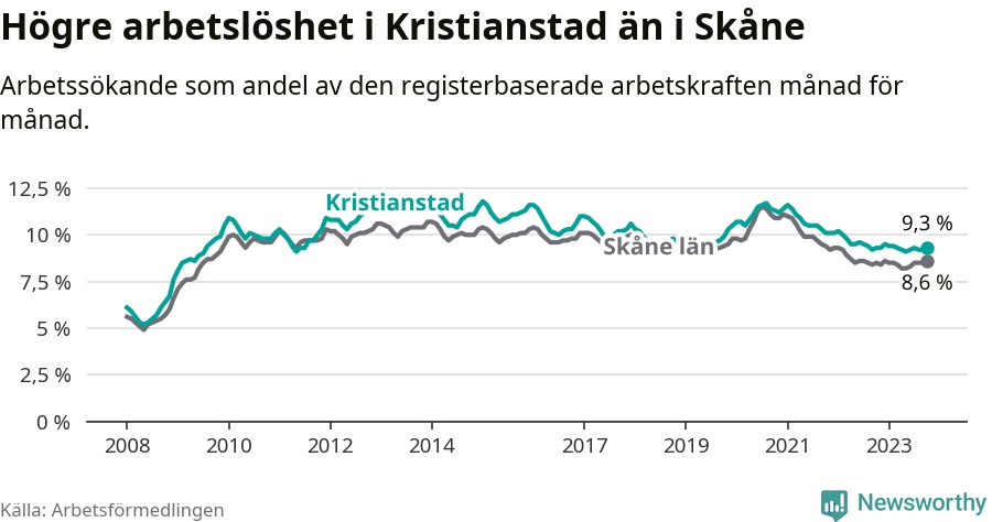 Sett till antalet personer betyder det att 3 908 av 42 022 invånare i åldern 16 till 651 år i Kristianstads kommun var inskrivna som arbetssökande (111 fler än i oktober i fjol).