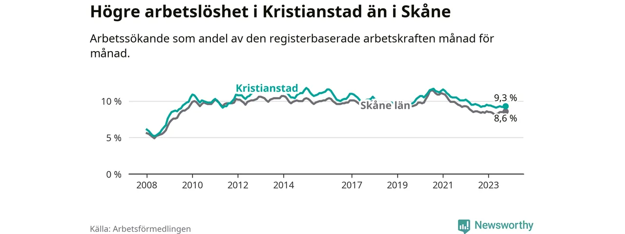 Under oktober månad rapporterade Kristianstads kommun en total arbetslöshet på 9,3 procent. Det är i samma nivå som i oktober i fjol. I Skåne län däremot stiger arbetslösheten något