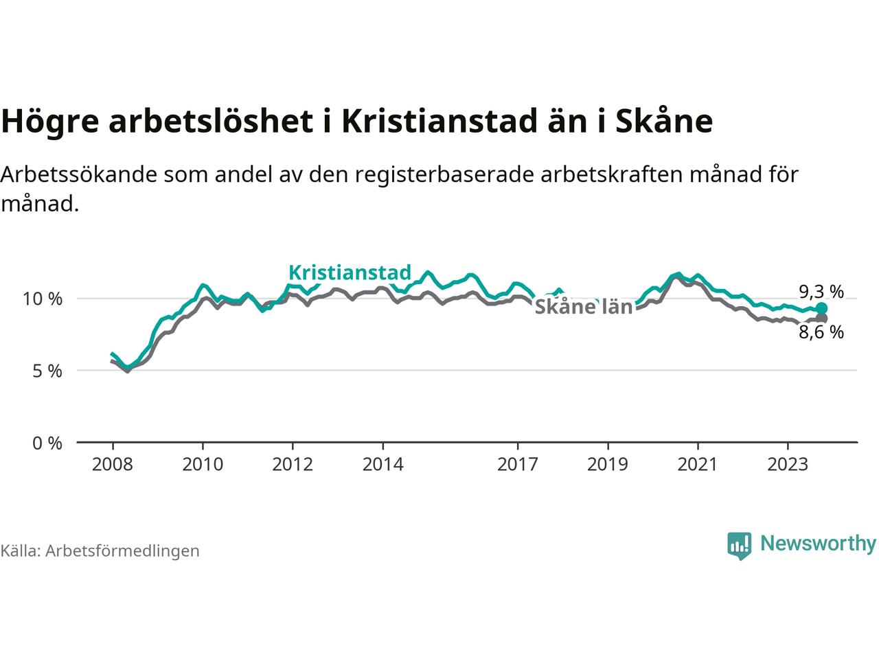 Arbetslösheten i Kristianstad ligger över nivån i hela Skåne län (9,3 procent i kommunen, jämfört med 8,6 procent i hela länet). Vellinge har den lägsta arbetslösheten i länet (3,3 procent), medan Malmö har den högsta (12,3 procent). För att Kristianstad skulle komma ner i samma arbetslöshetsnivå som Vellinge skulle 2 521 personer behöva sysselsättas.