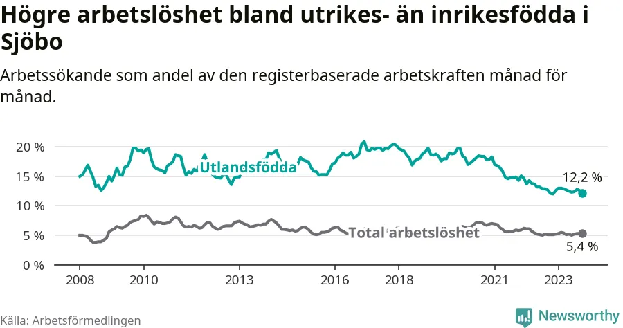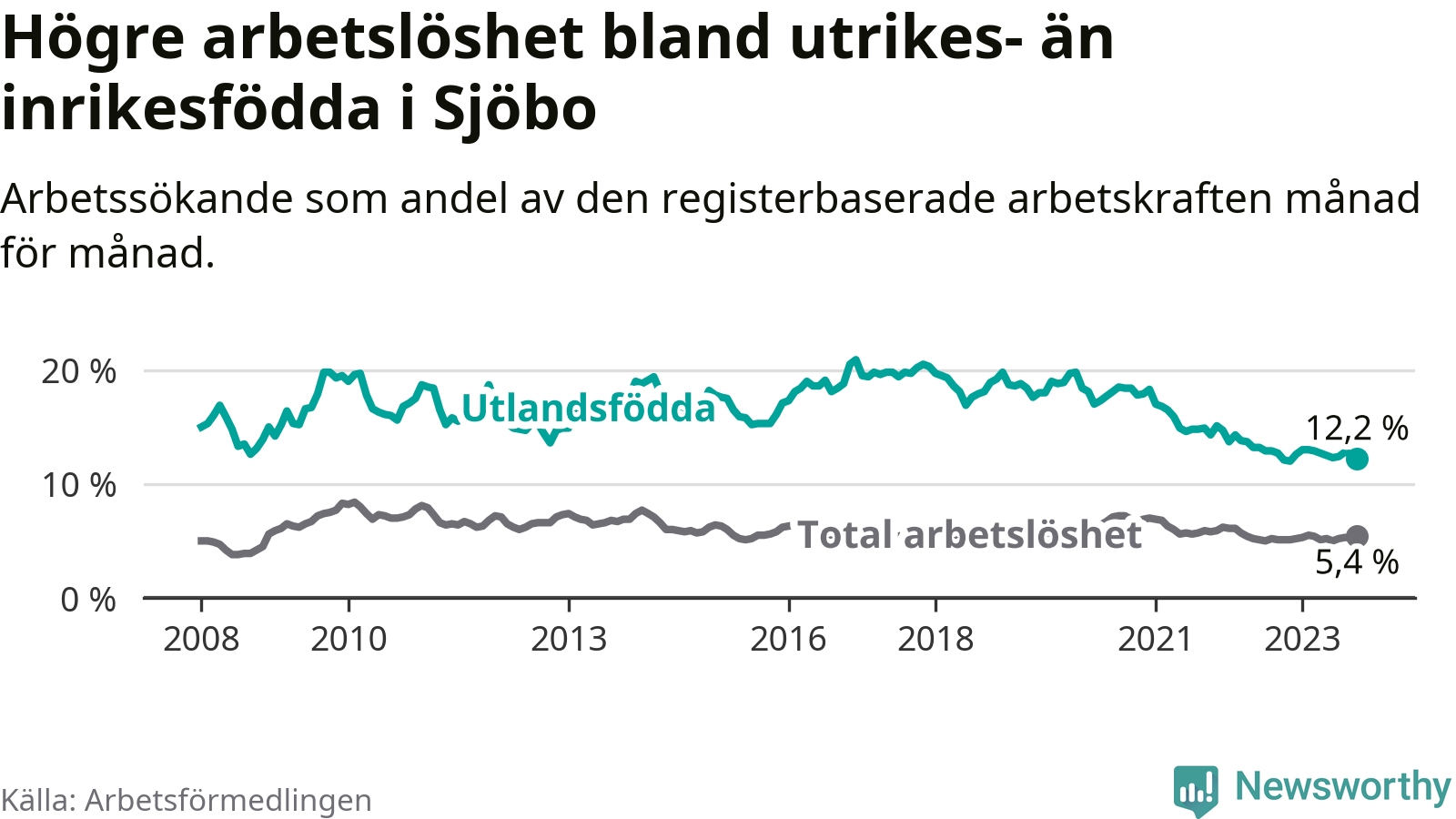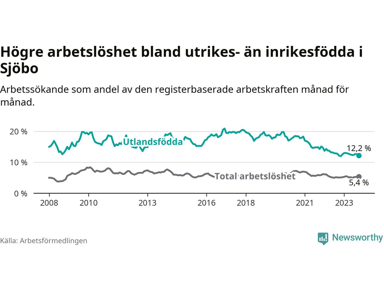 Arbetslösheten bland utlandsfödda var 12,2 procent i Sjöbo under oktober månad, motsvarande 147 av 1 205 personer. Det är 0,1 procentenheter fler än vid samma tidpunkt i fjol (+15 om man räknar personer). Den senaste månadens uppgång innebär ett trendbrott. Under de 38 föregående månaderna hade arbetslösheten bland utlandsfödda varit lägre än motsvarande tidpunkt året innan.