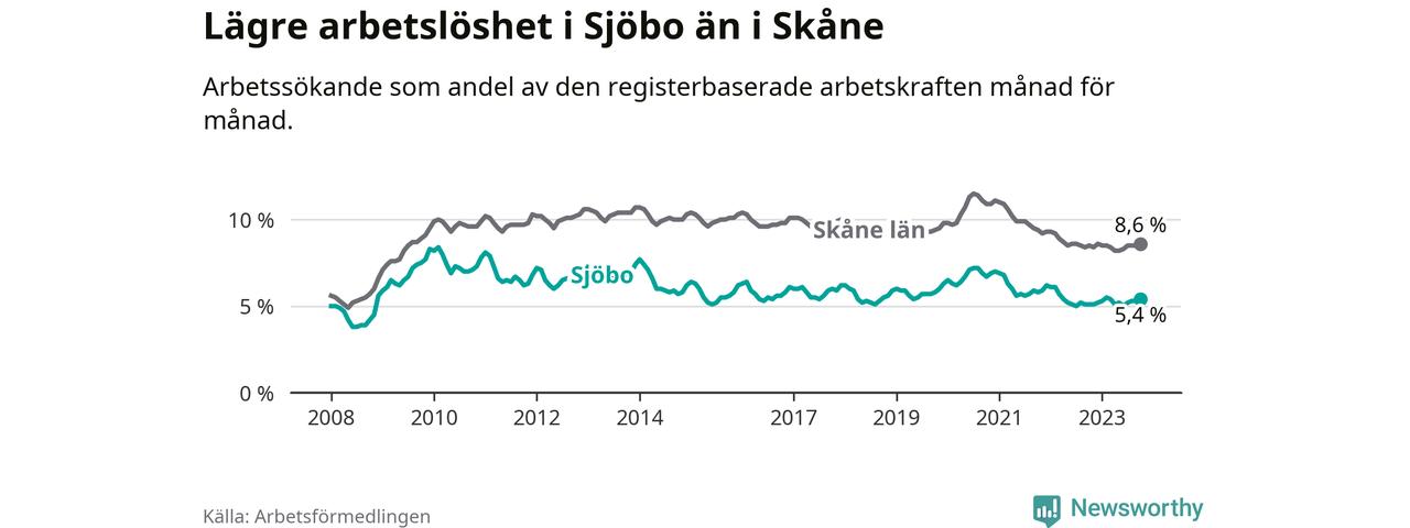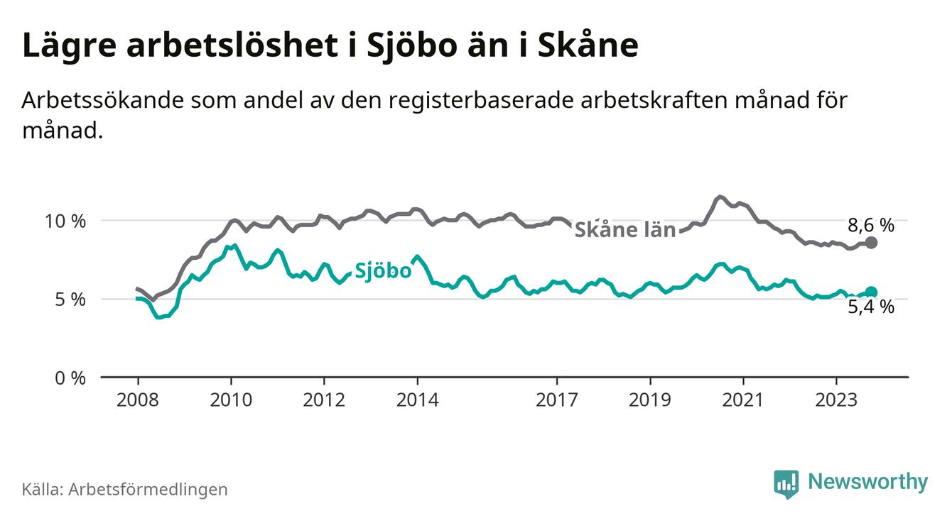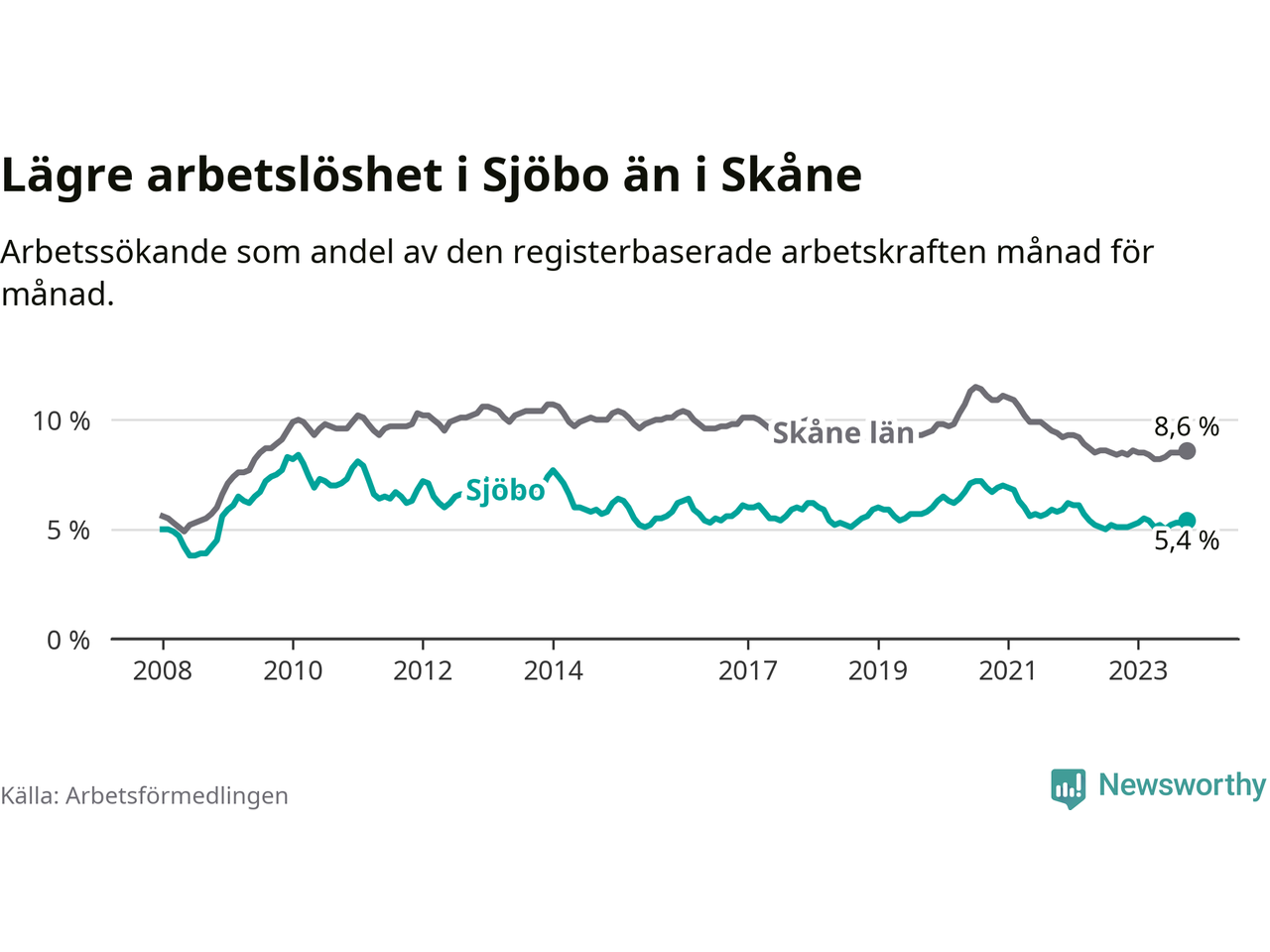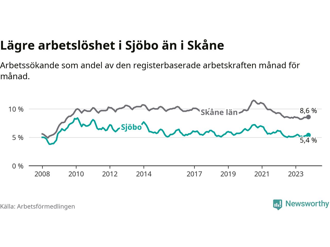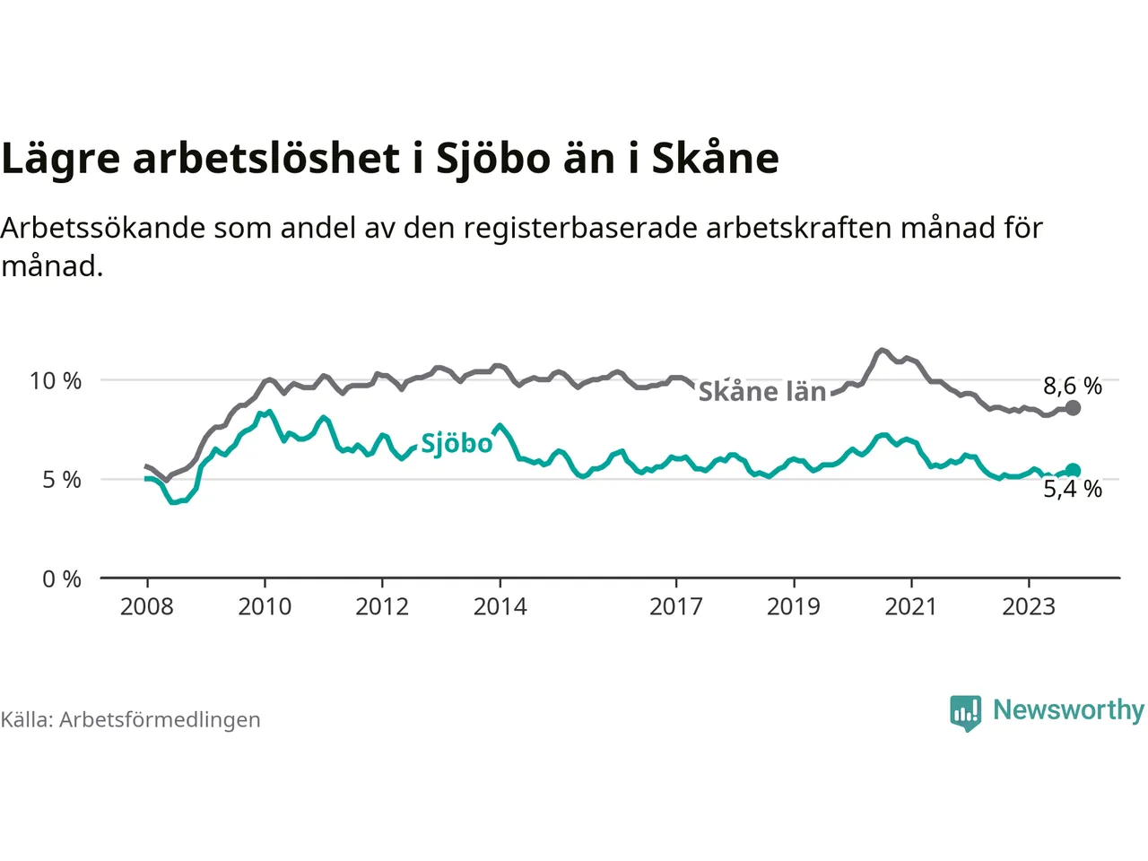 Även om arbetslösheten i Sjöbo alltså ökar, så ligger den fortfarande under snittet i hela Skåne län (5,4 procent i kommunen, jämfört med 8,6 procent i hela länet). Vellinge har den lägsta arbetslösheten i länet (3,3 procent), medan Malmö har den högsta (12,3 procent). För att Sjöbo skulle komma ner i samma arbetslöshetsnivå som Vellinge skulle 203 personer behöva sysselsättas.