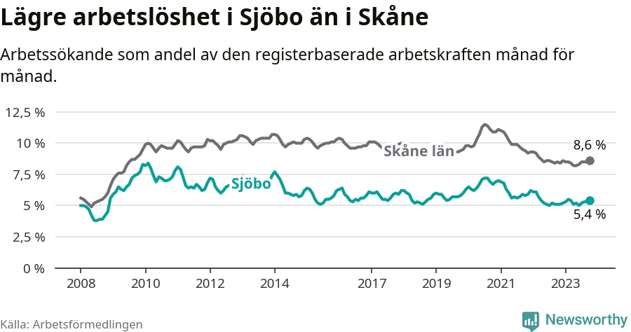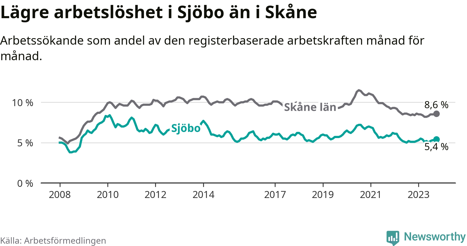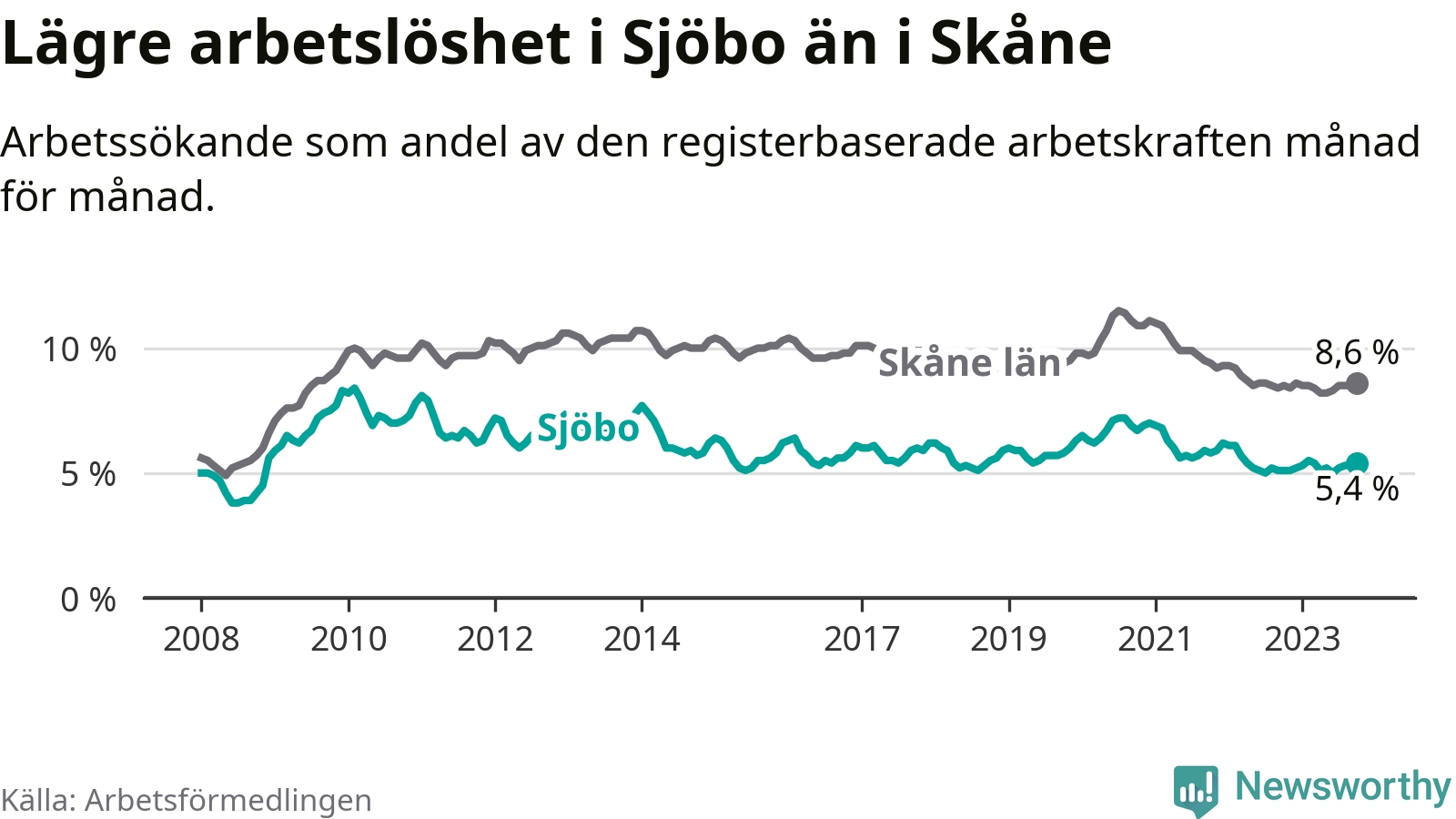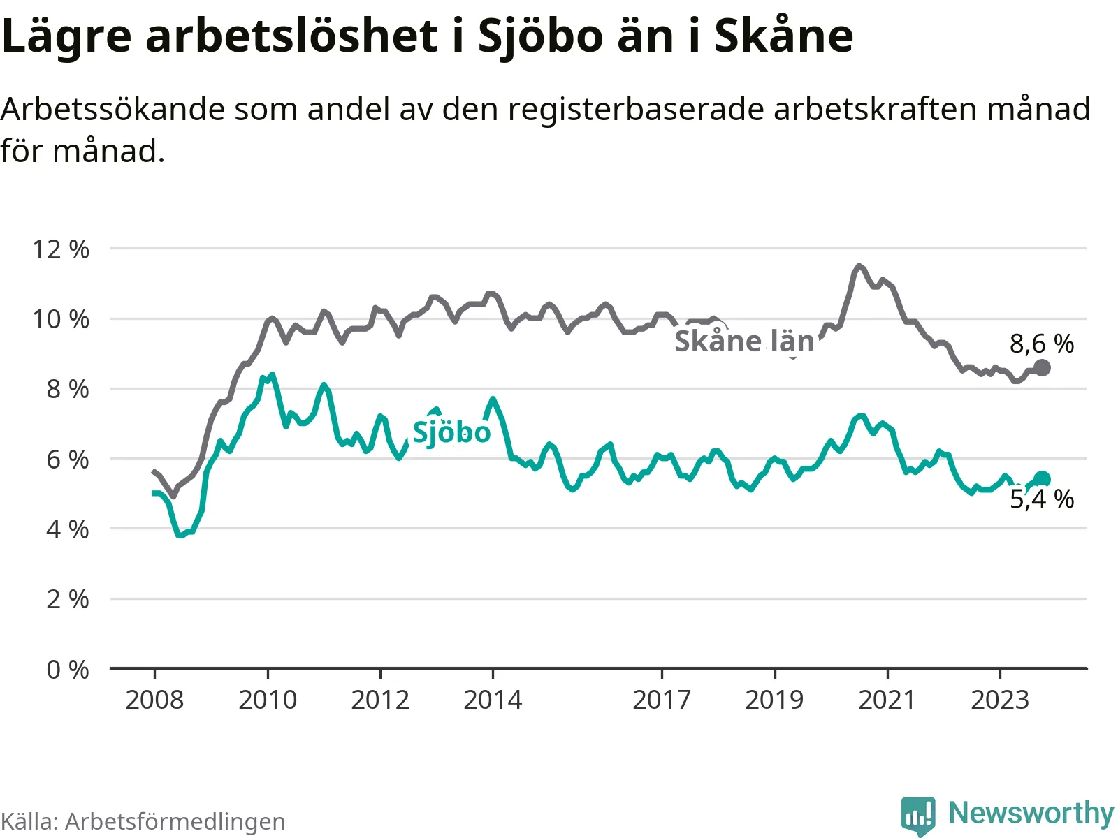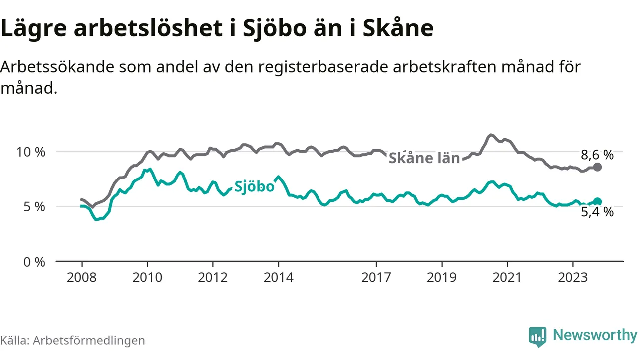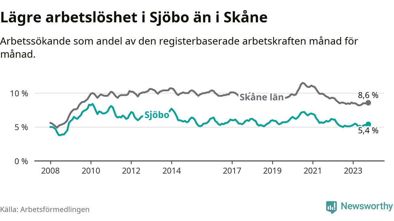 Även om arbetslösheten i Sjöbo alltså ökar, så ligger den fortfarande under snittet i hela Skåne län (5,4 procent i kommunen, jämfört med 8,6 procent i hela länet). Vellinge har den lägsta arbetslösheten i länet (3,3 procent), medan Malmö har den högsta (12,3 procent). För att Sjöbo skulle komma ner i samma arbetslöshetsnivå som Vellinge skulle 203 personer behöva sysselsättas.