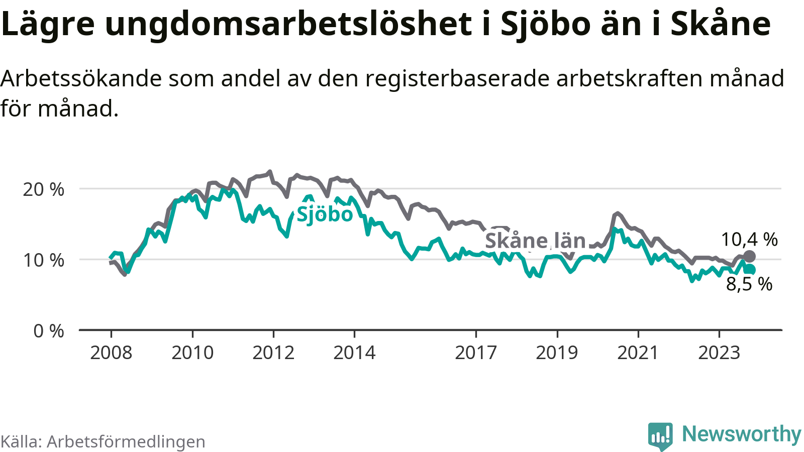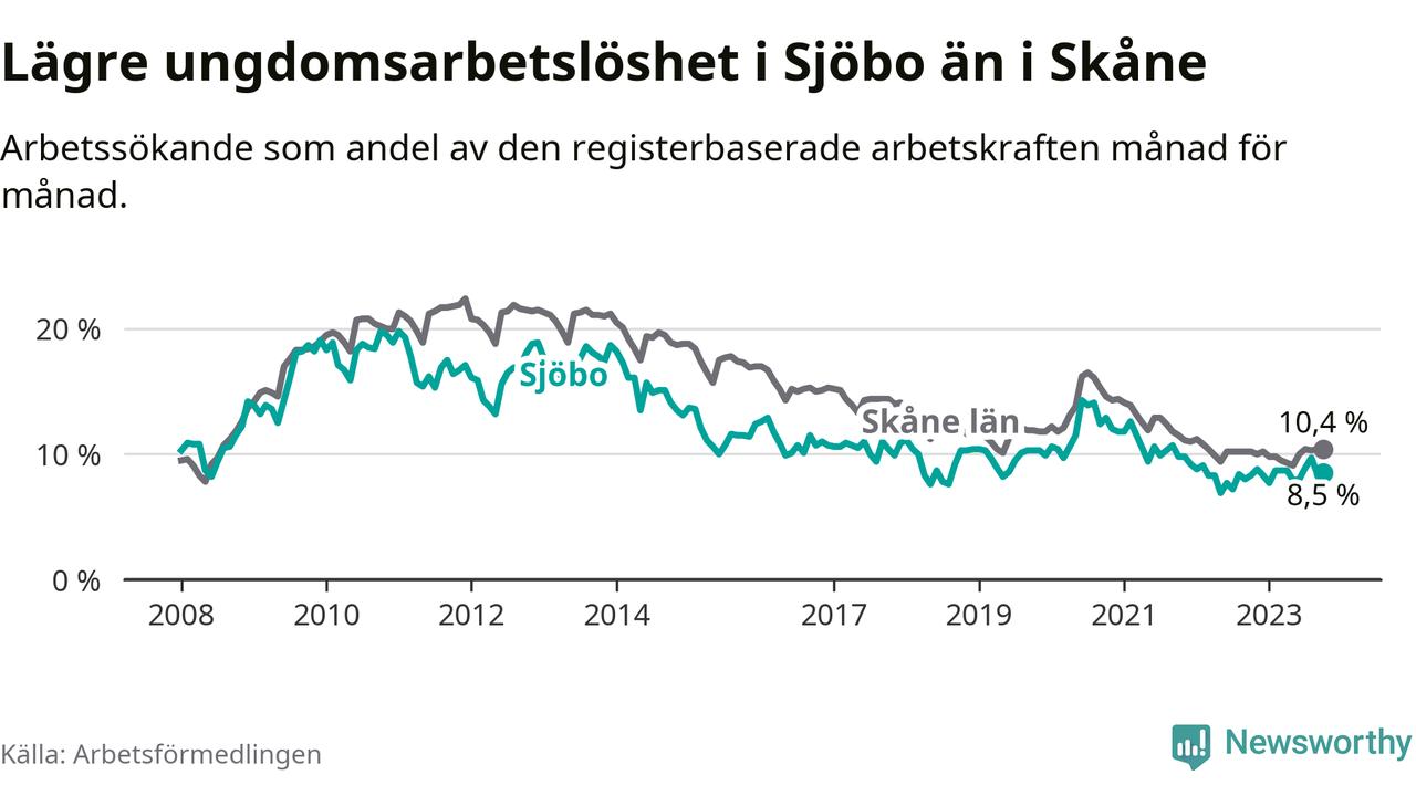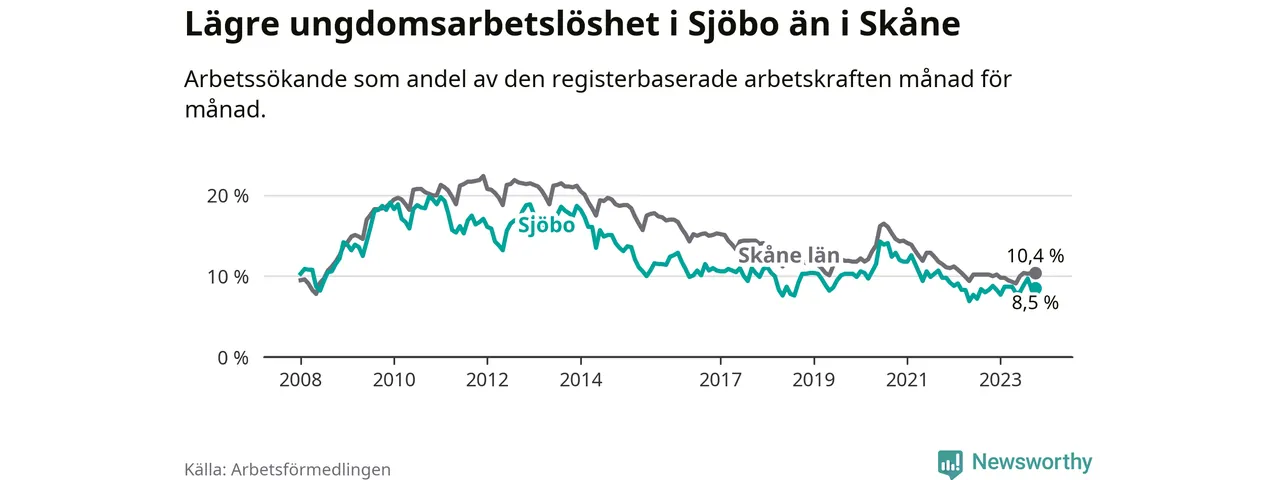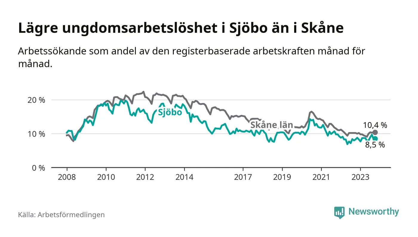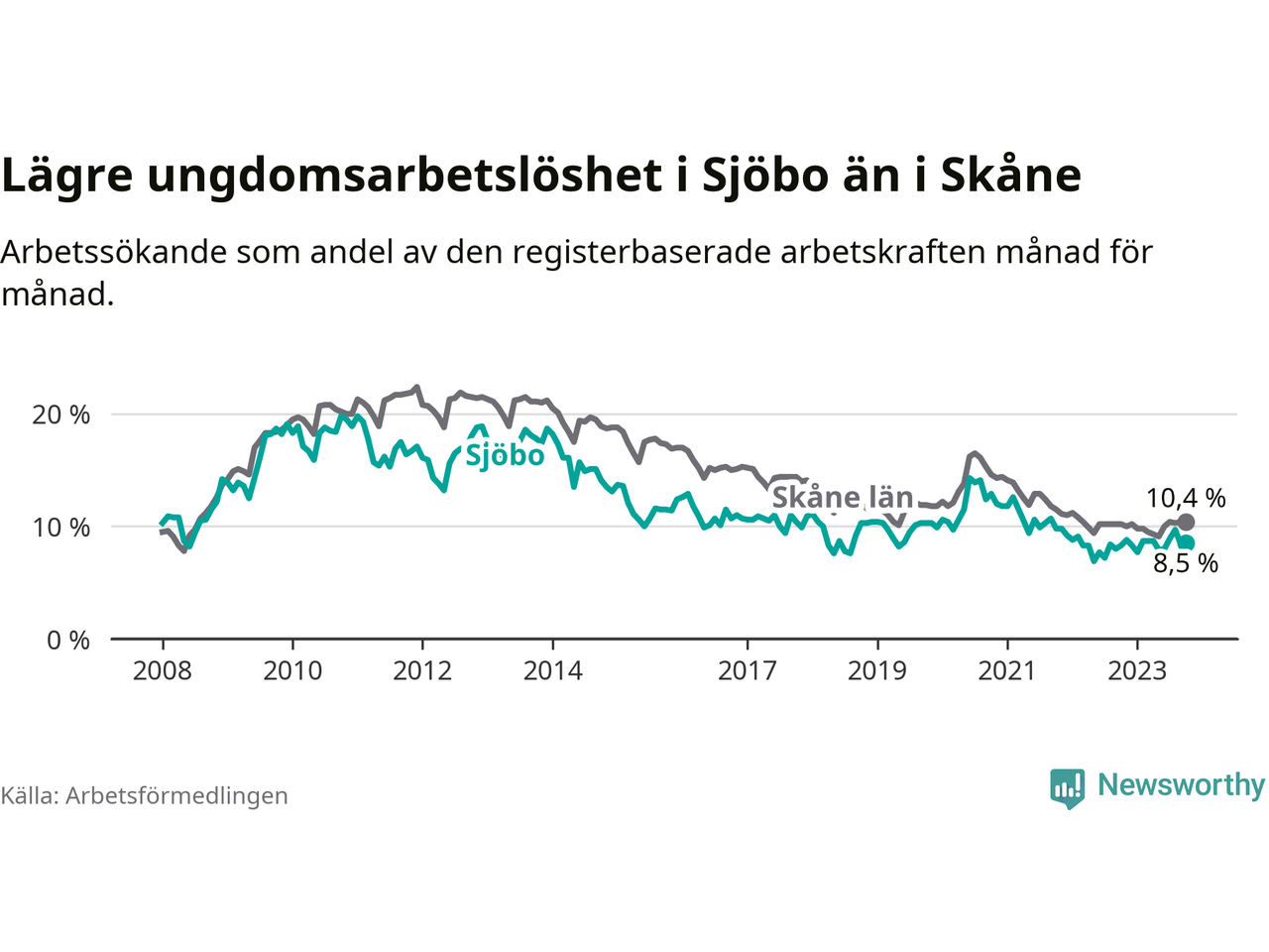 Precis som den totala arbetslösheten ligger ungdomsarbetslösheten i Sjöbo lägre än i Skåne som helhet. Skillnaden mellan kommunen och länet är 1,9 procentenheter.