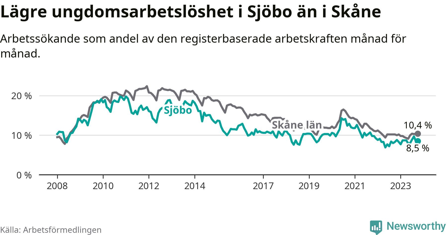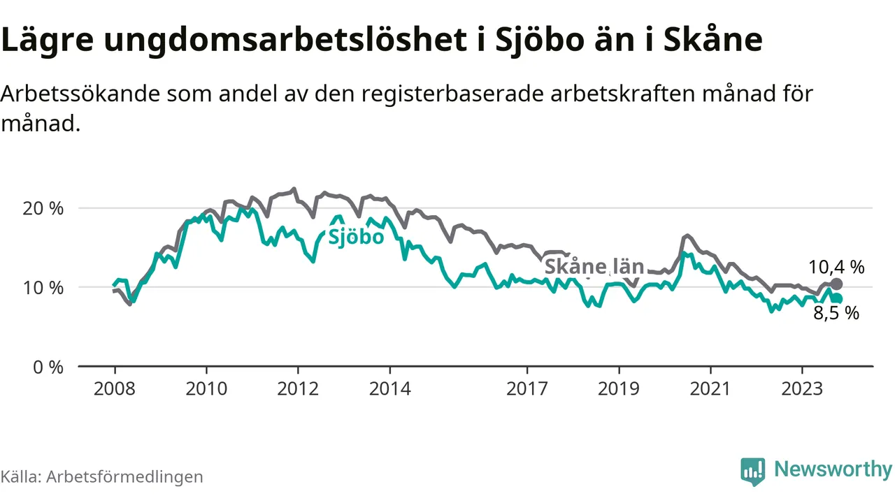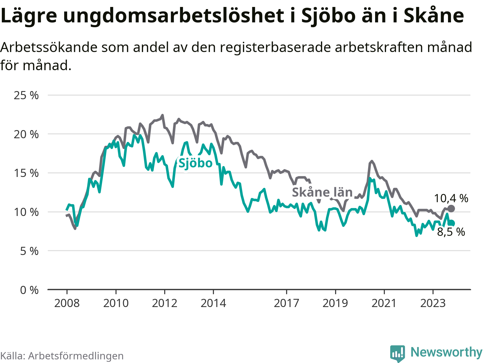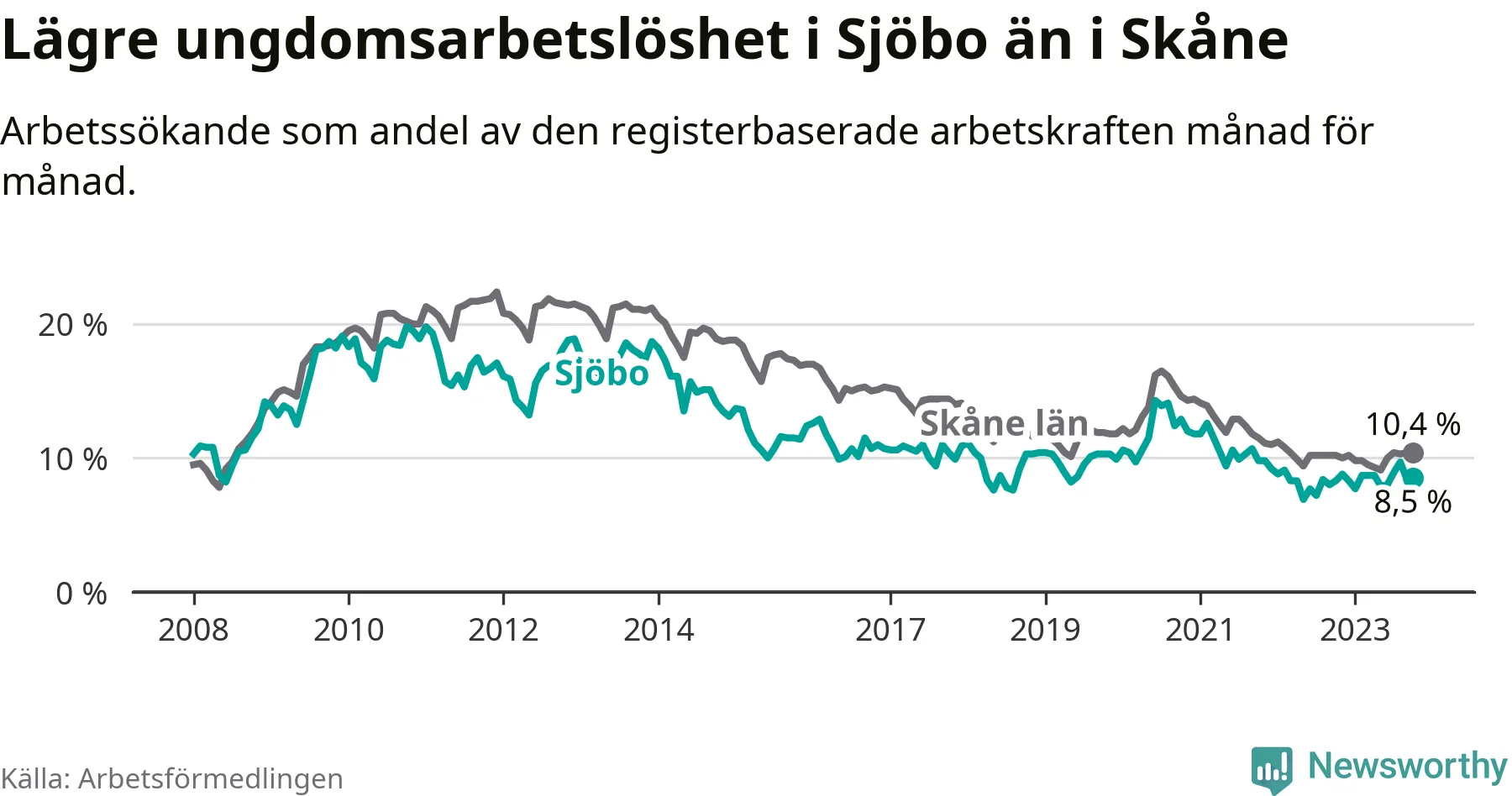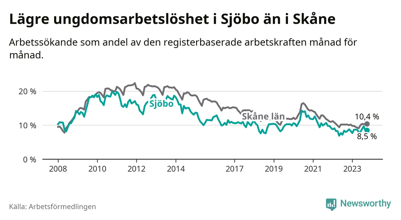 Precis som den totala arbetslösheten ligger ungdomsarbetslösheten i Sjöbo lägre än i Skåne som helhet. Skillnaden mellan kommunen och länet är 1,9 procentenheter.