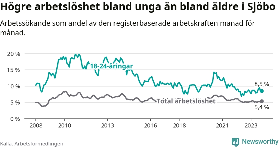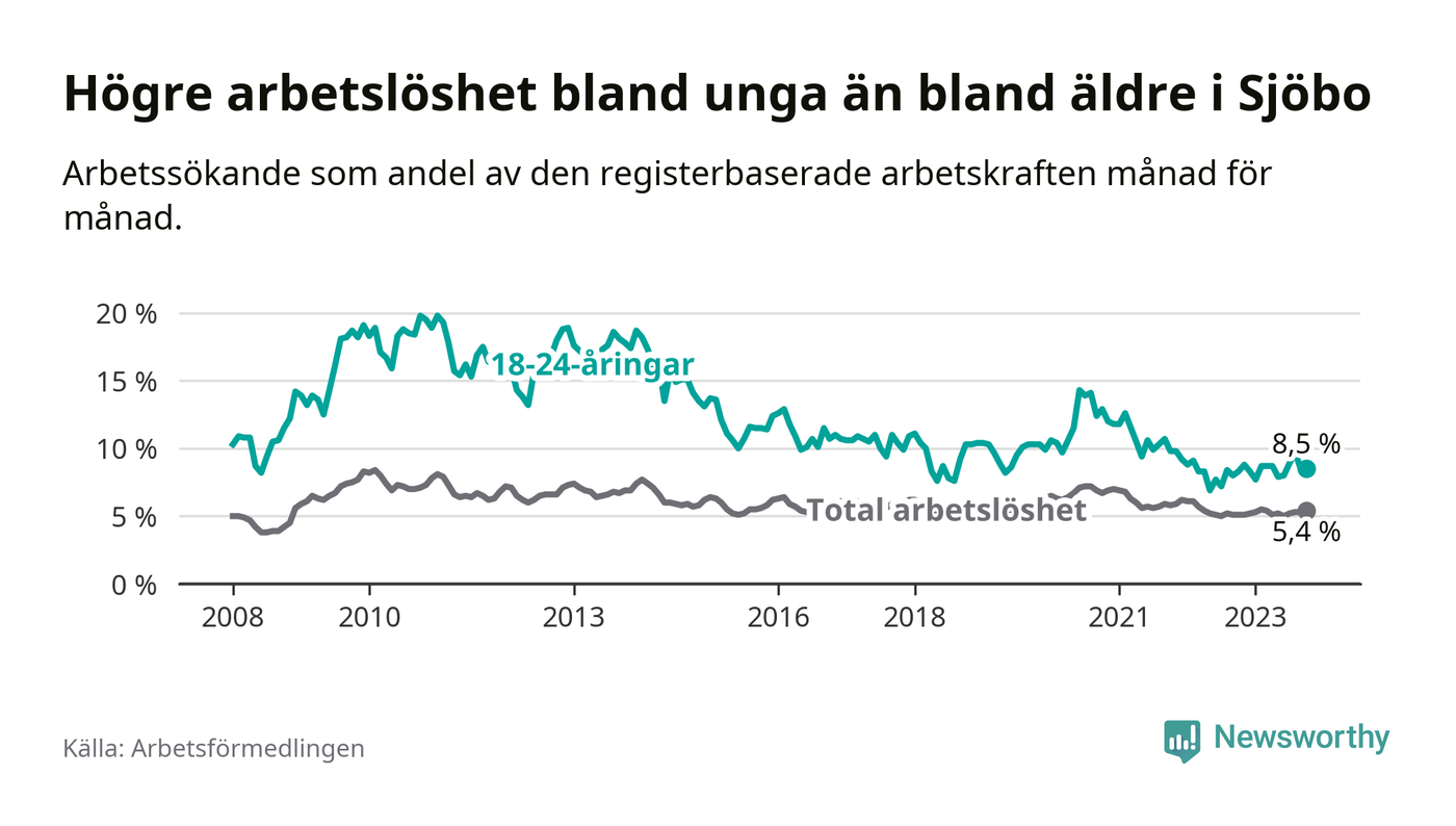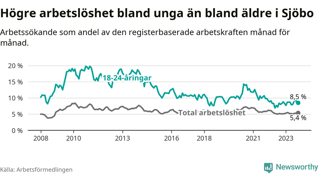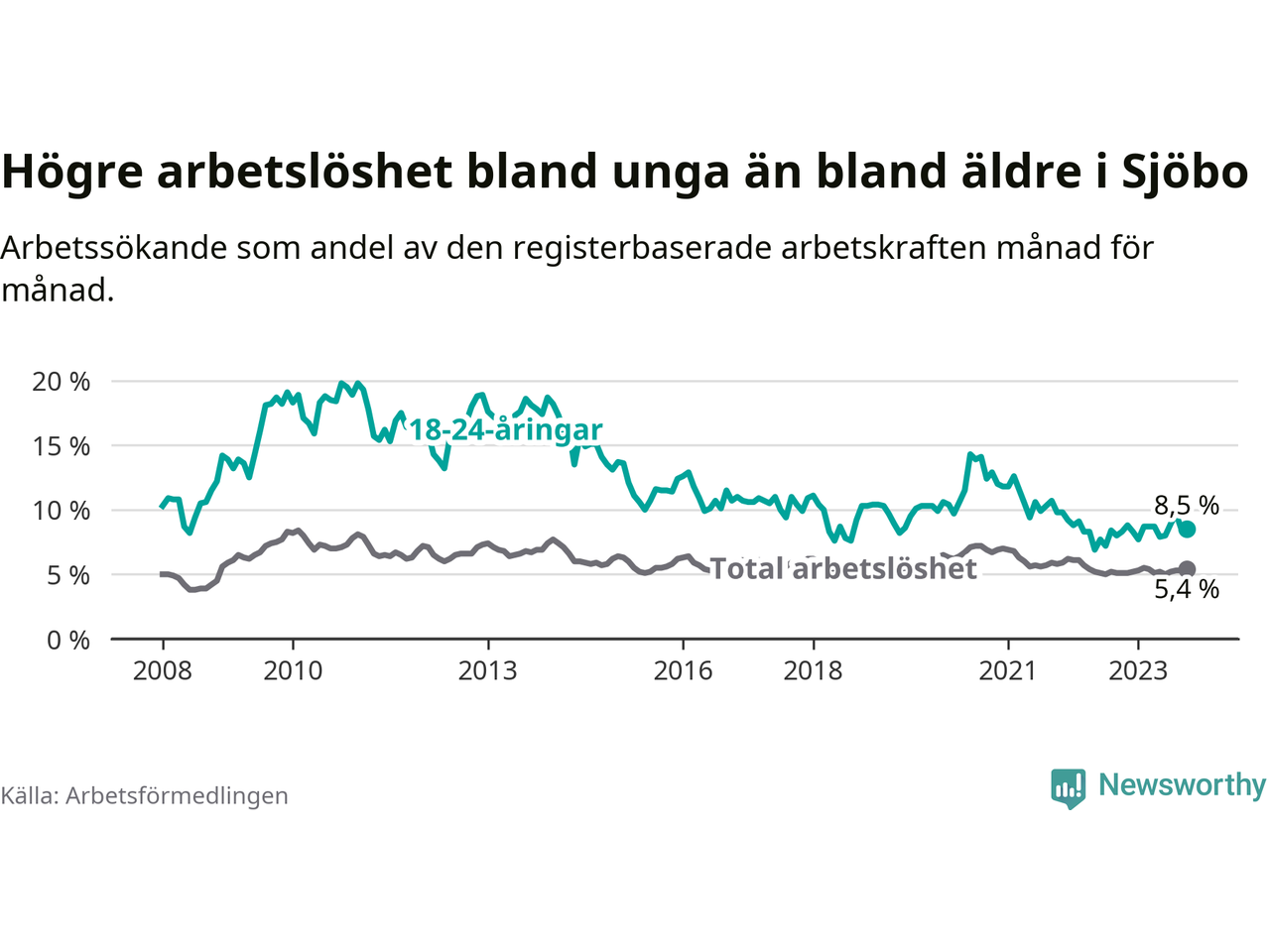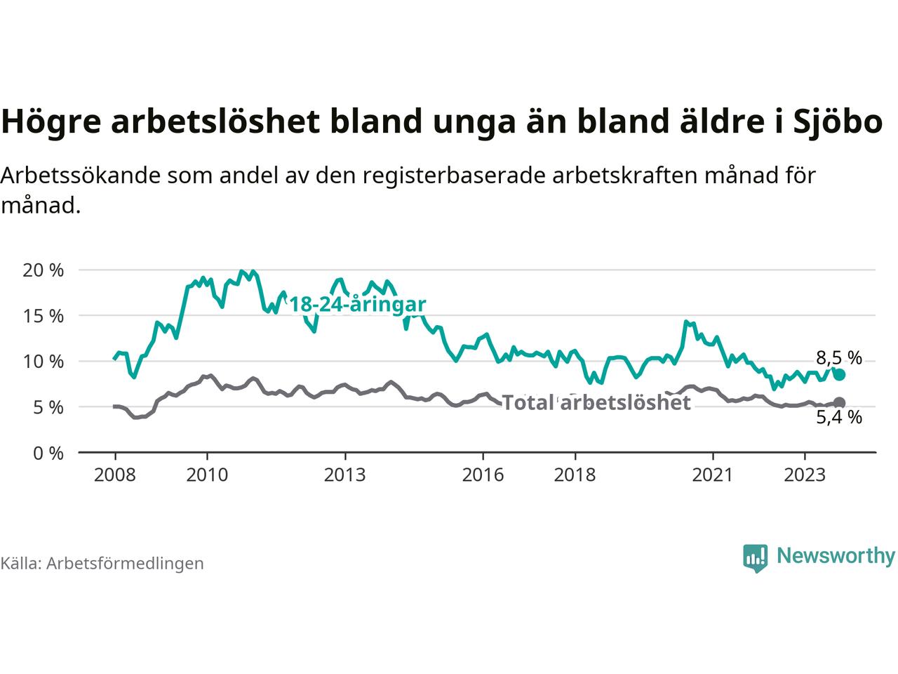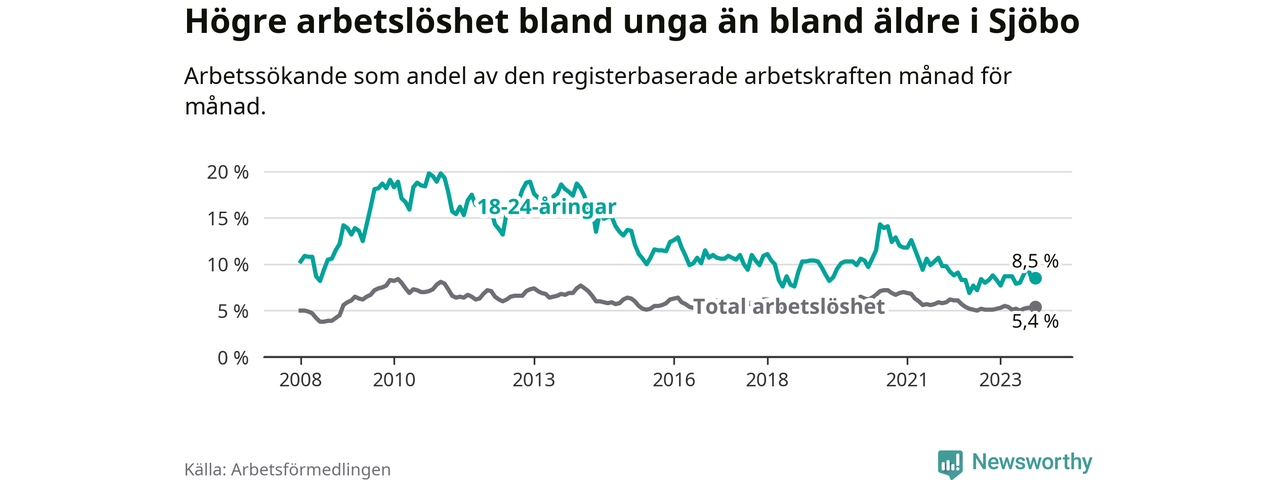 I och med den senaste månadens uppgång har de ungas arbetslöshet i Sjöbo stigit åtta månader i följd (upp från 8,7 procent i februari till 8,5 procent nu).