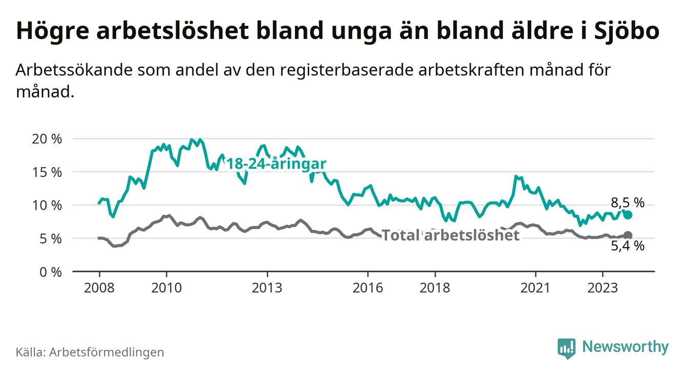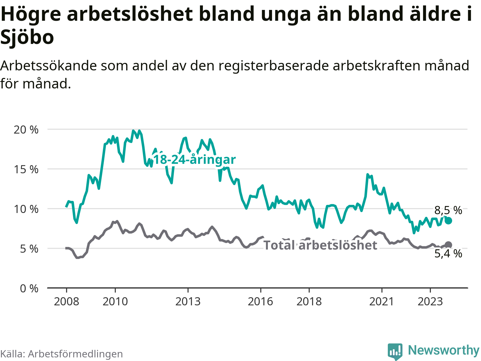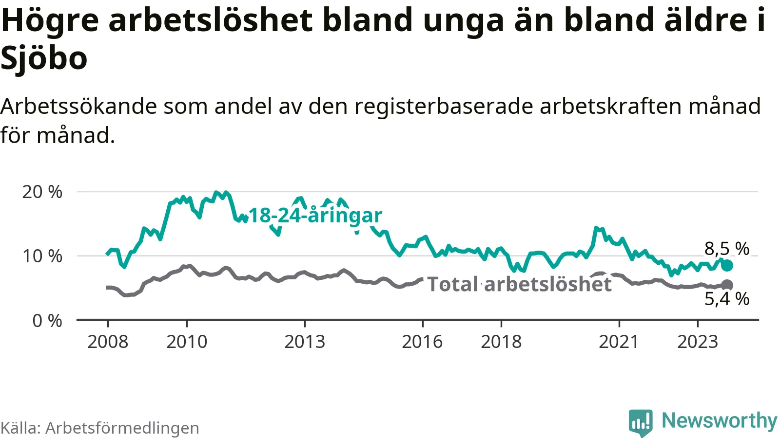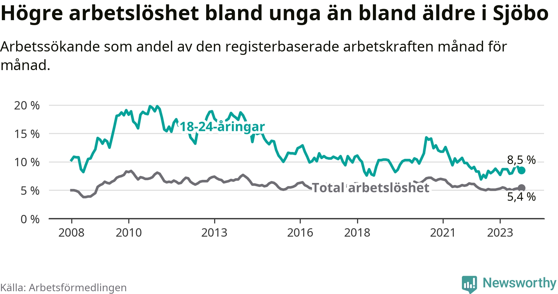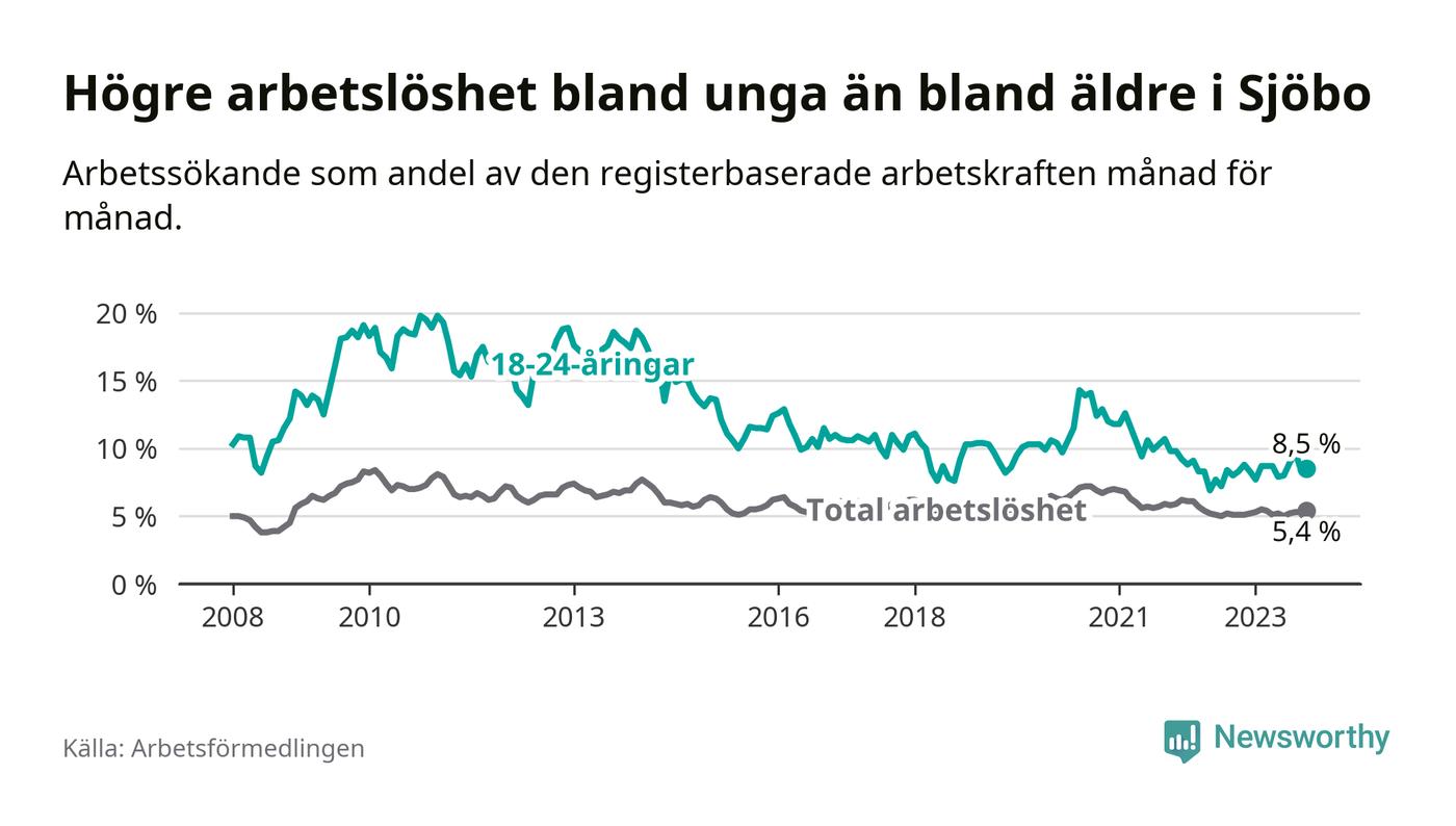 I och med den senaste månadens uppgång har de ungas arbetslöshet i Sjöbo stigit åtta månader i följd (upp från 8,7 procent i februari till 8,5 procent nu).