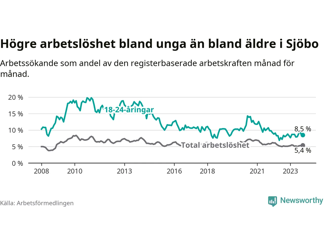 Precis som den totala arbetslösheten stiger arbetslösheten bland unga (+0,2 procentenheter). I oktober var 8,5 procent av 18–24-åringarna inskrivna som arbetssökande (motsvarande 71 personer). Mäter vi antalet inskrivna ser vi en ökning med åtta personer på ett års sikt.